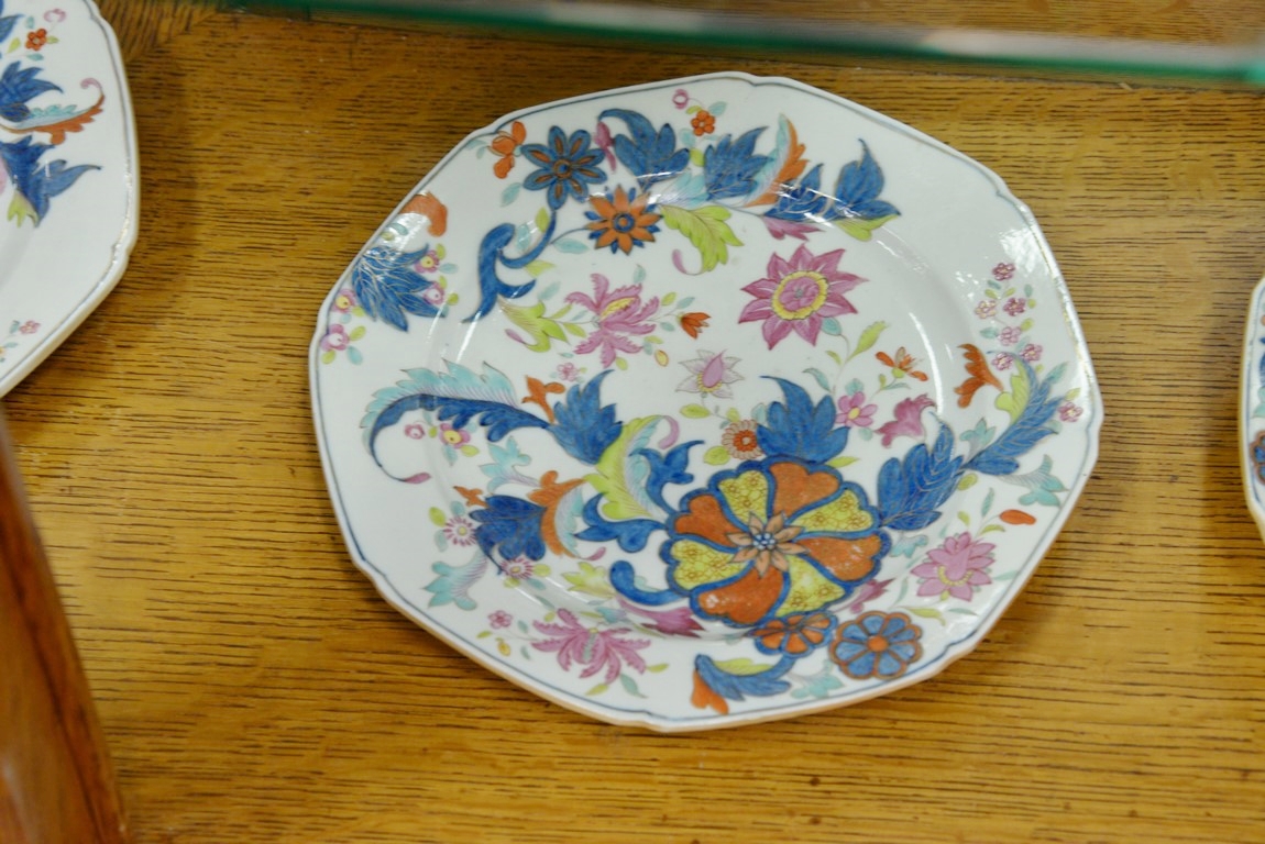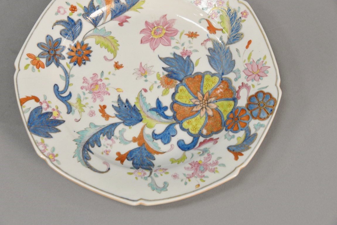 Set of twelve Chinese Export Pseudo Tobacco Leaf plate with scalloped edge and enamels of pink, yellow, iron-red, and green with overall blossoms, lotus flowers, scrolling vines, and leaves, 18th century. dia. 9 in.
