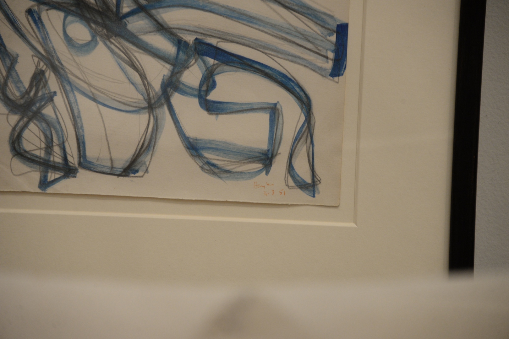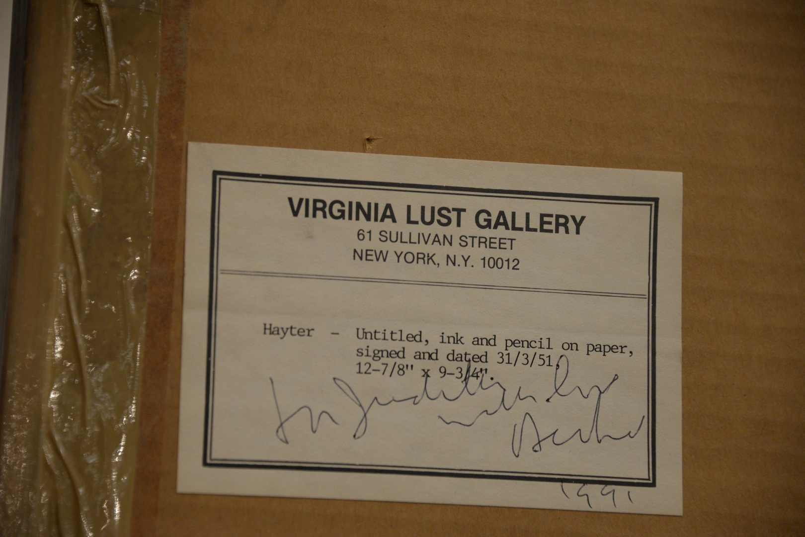 Stanley William Hayter (American, 1901 – 1988), untitled, 1951, oil and pencil on paper, signed and dated lower right Hayter/31.3.51, Virginia Lust Gallery label on the reverse, 12 3/4″ x 9 3/4″.