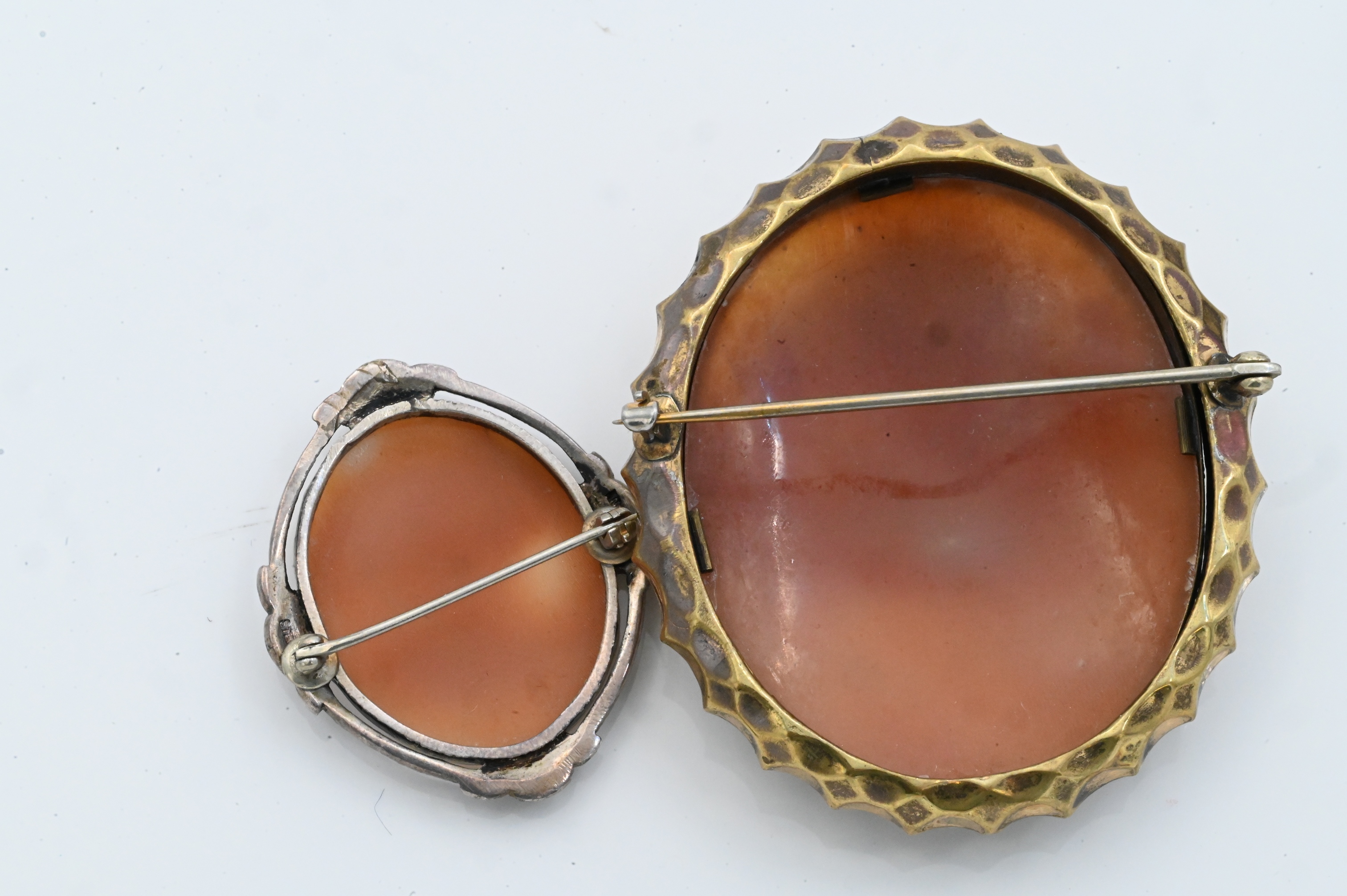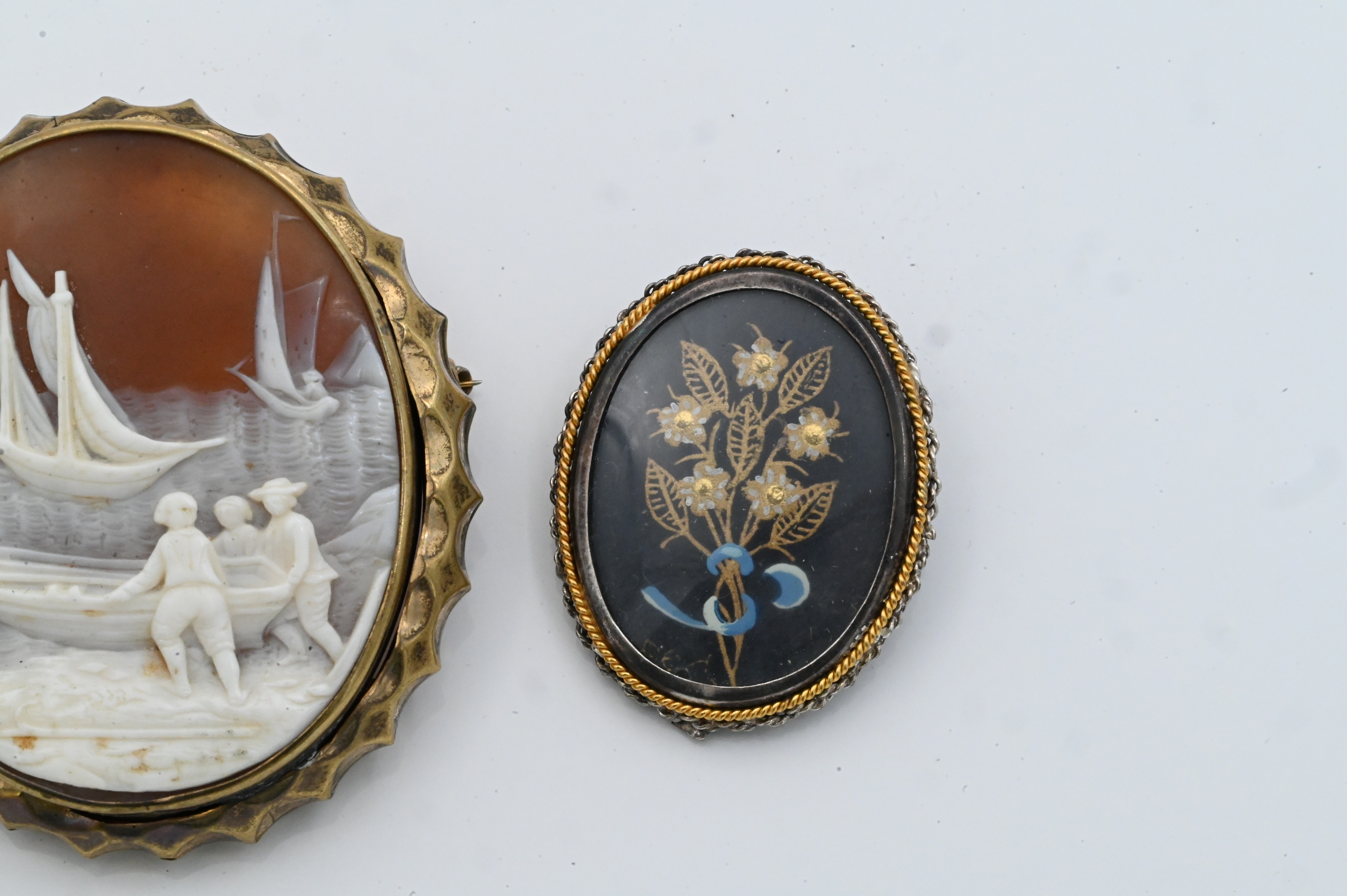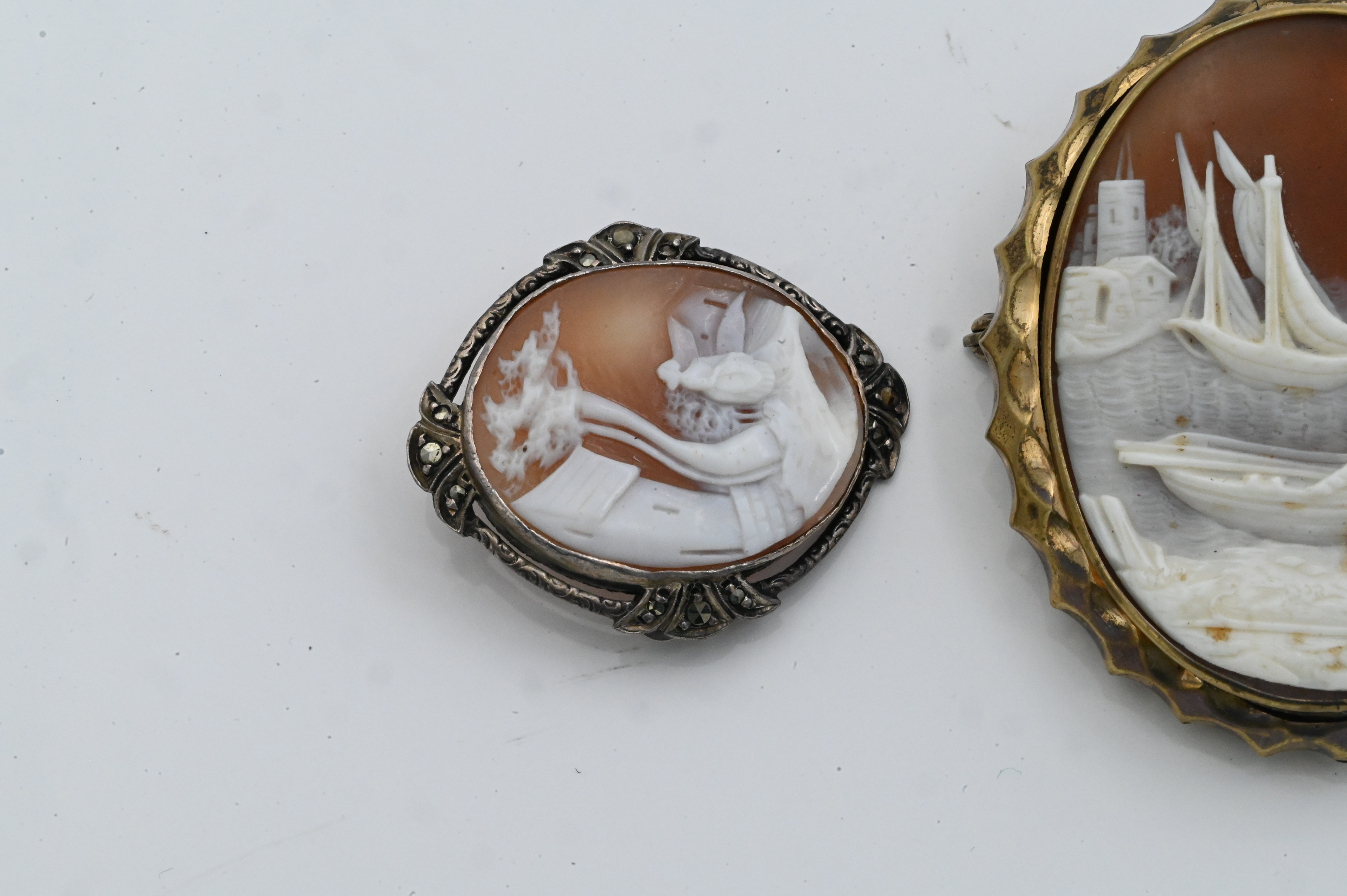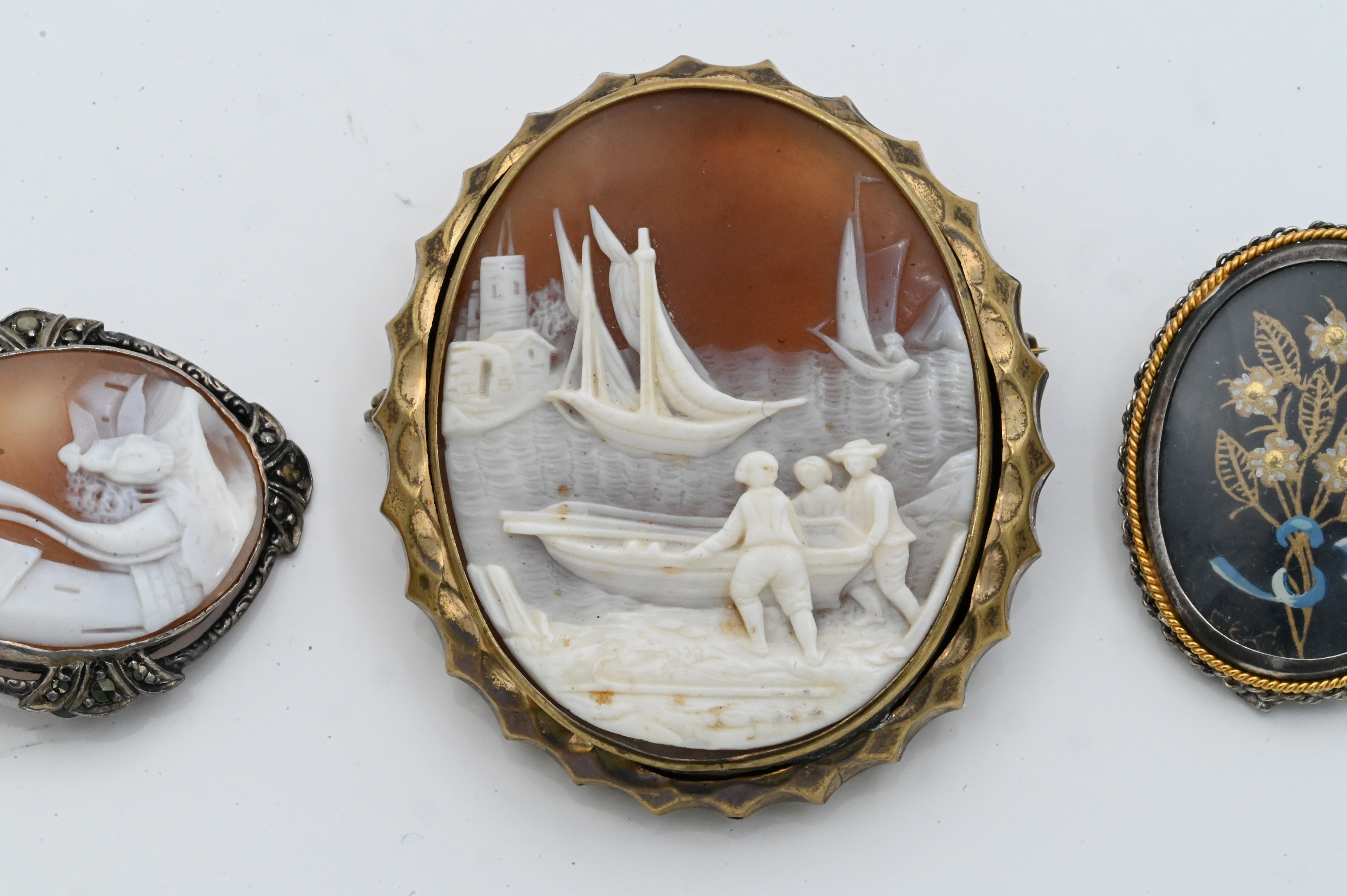 to include one silver depicting a woman by a tree, one gold filled depicting a harbor scene, and one marked 800 silver with a gold wire rim
