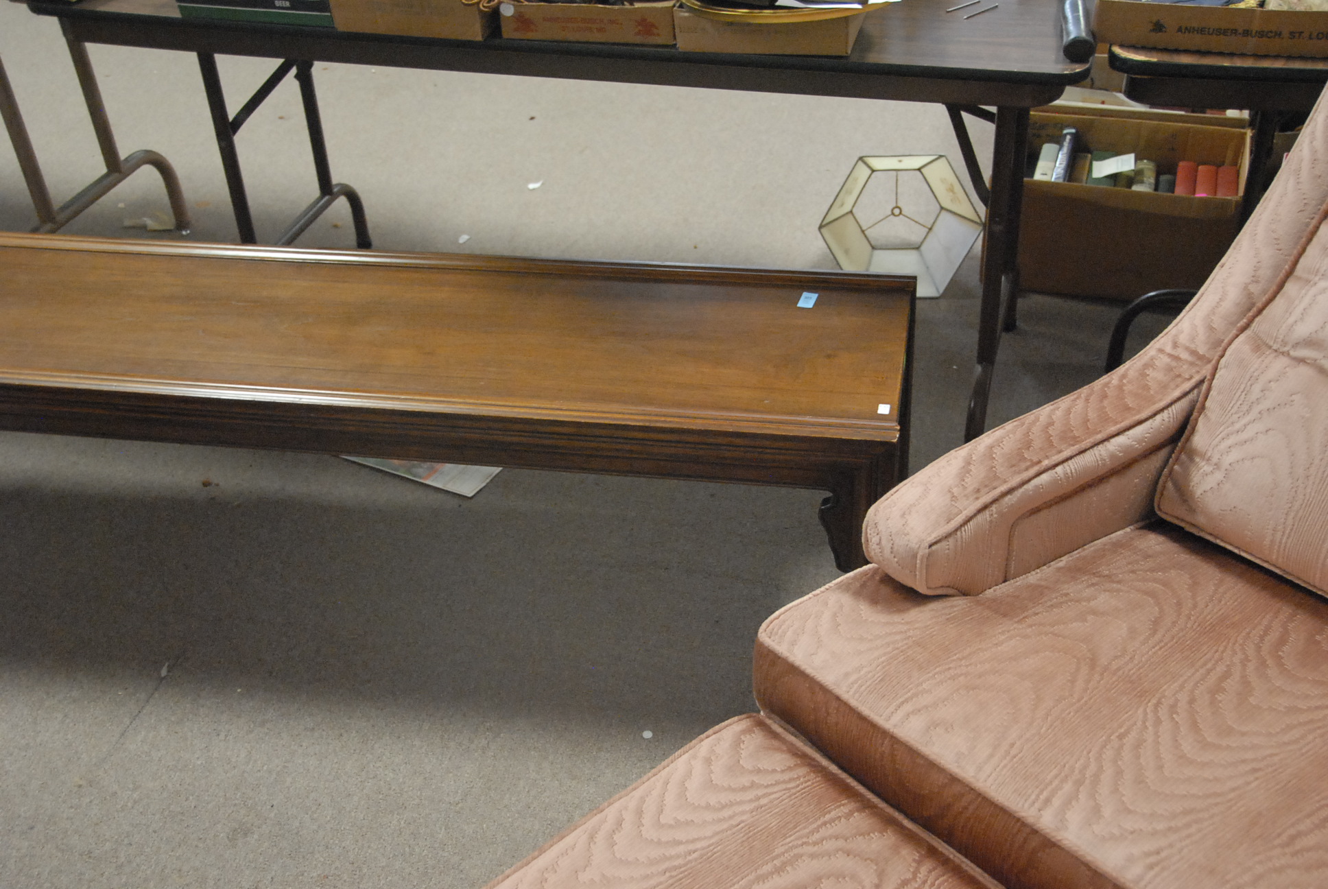 Lot 305: Three piece lot to include John Witticomb long table, ht. 16 1/2in. lg. 72in., upholstered chair, and ottoman.