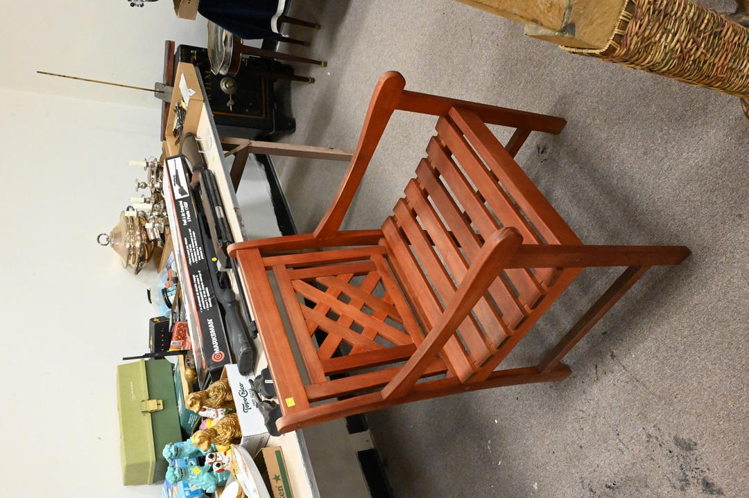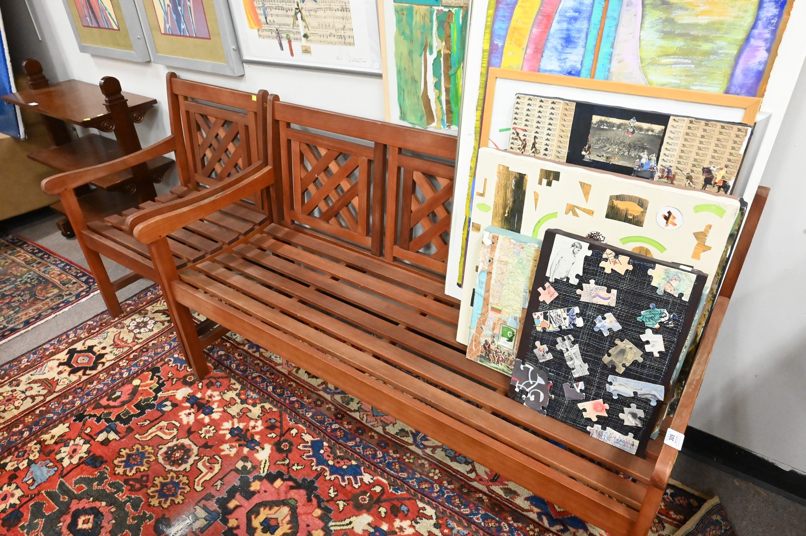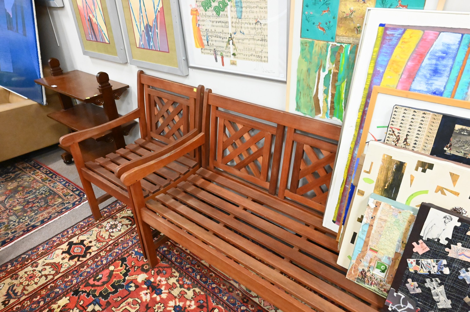 Three Piece Outdoor Teak Set, to include a bench and matching armchairs, bench length 57 inches.
