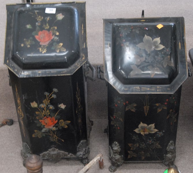 Two tole coal hods. ht. 25 1/2in. & 23 1/2in.