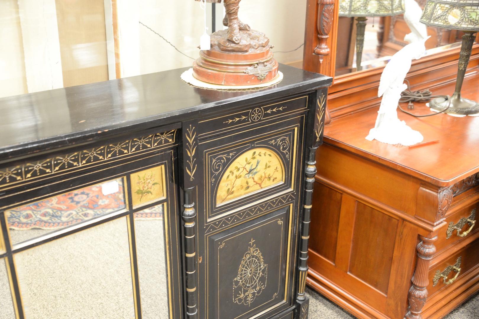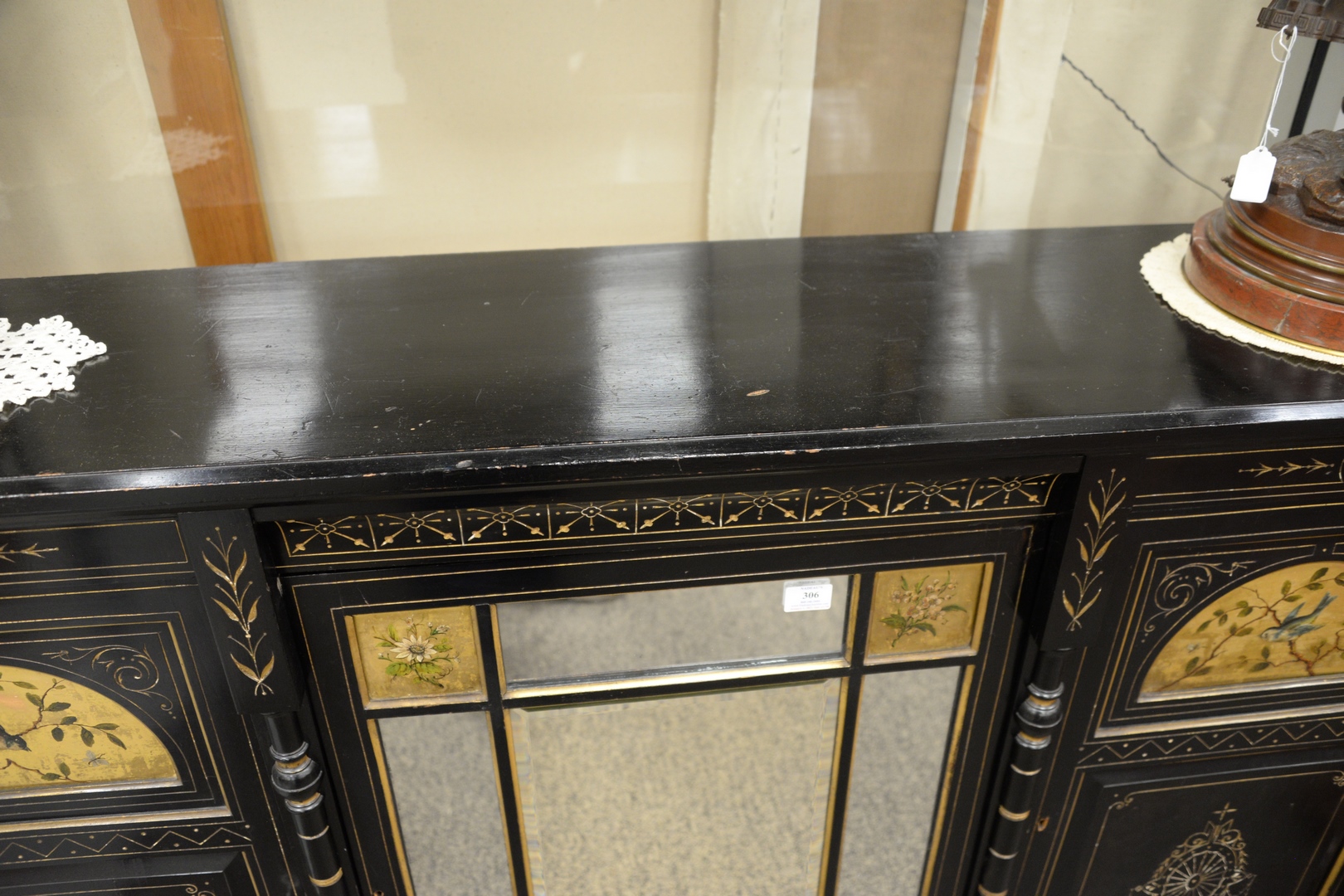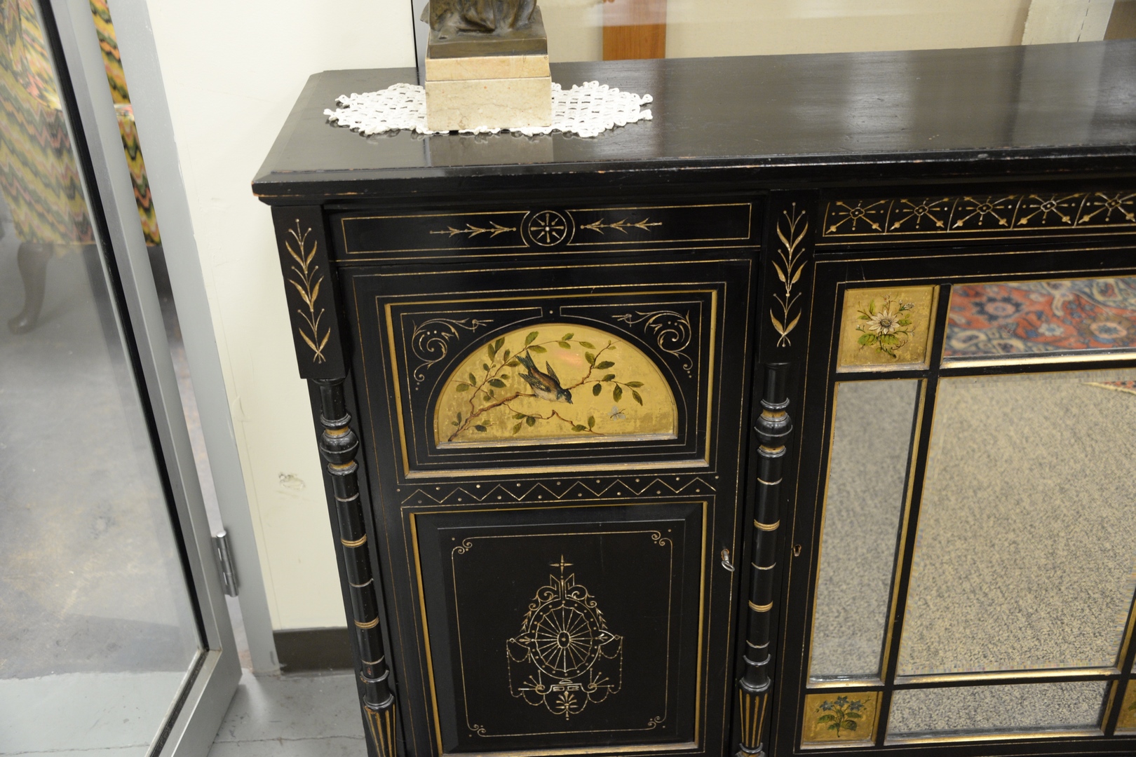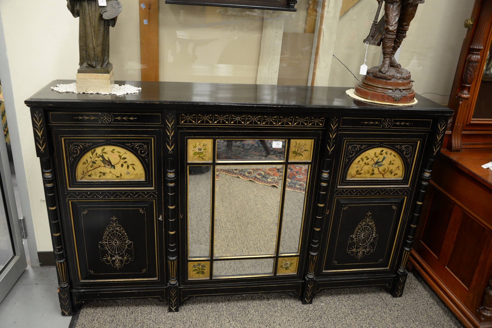 Lot 306: Aesthetic Ebonized Sideboard with mirrored center door having four painted panels, flanked by doors, each with bird and branch paint…