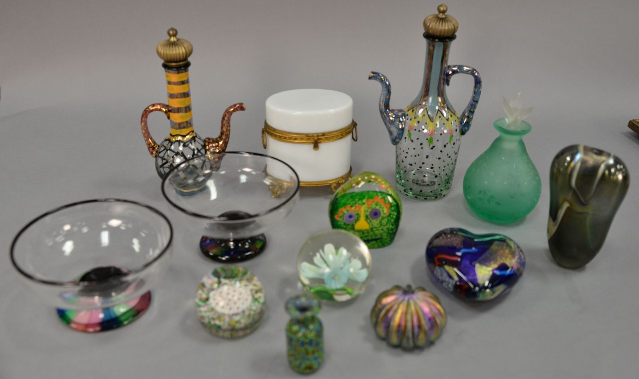 Box lot of art glass to include 2 Mackenzie Childs Victoria and Richard collection bottles, 2 Murano art glass dishes, green frosted perfume, 4 Murano paperweights, a box mounted with bronze fittings, Rhag iridescent paperweight, and Coleman Studios art glass perfume 1987.