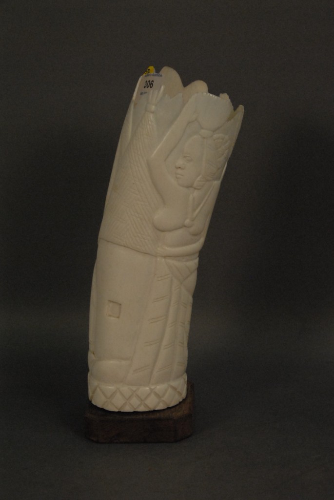 Lot 306: Carved ivory elephant tusk of elephant and African woman, ht. 11 1/2.