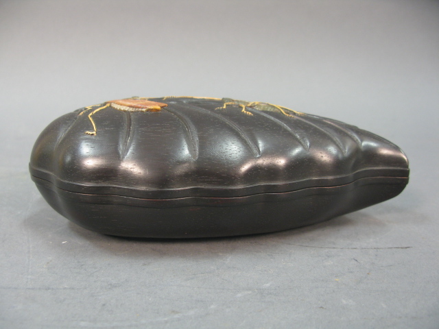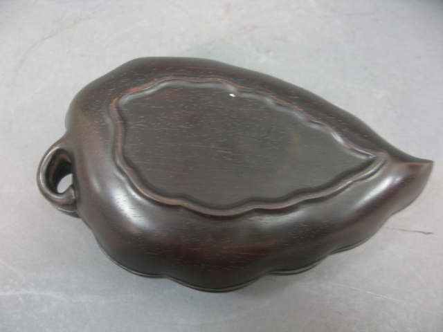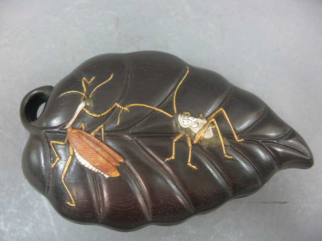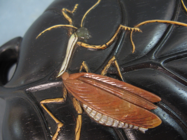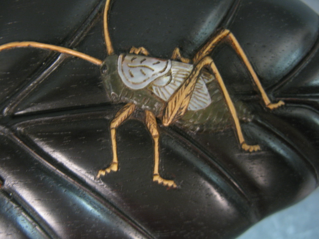 Carved zitan leaf box, zitan carved in the form of a leaf mounted with stone and mother of pearl praying mantes and grasshopper.