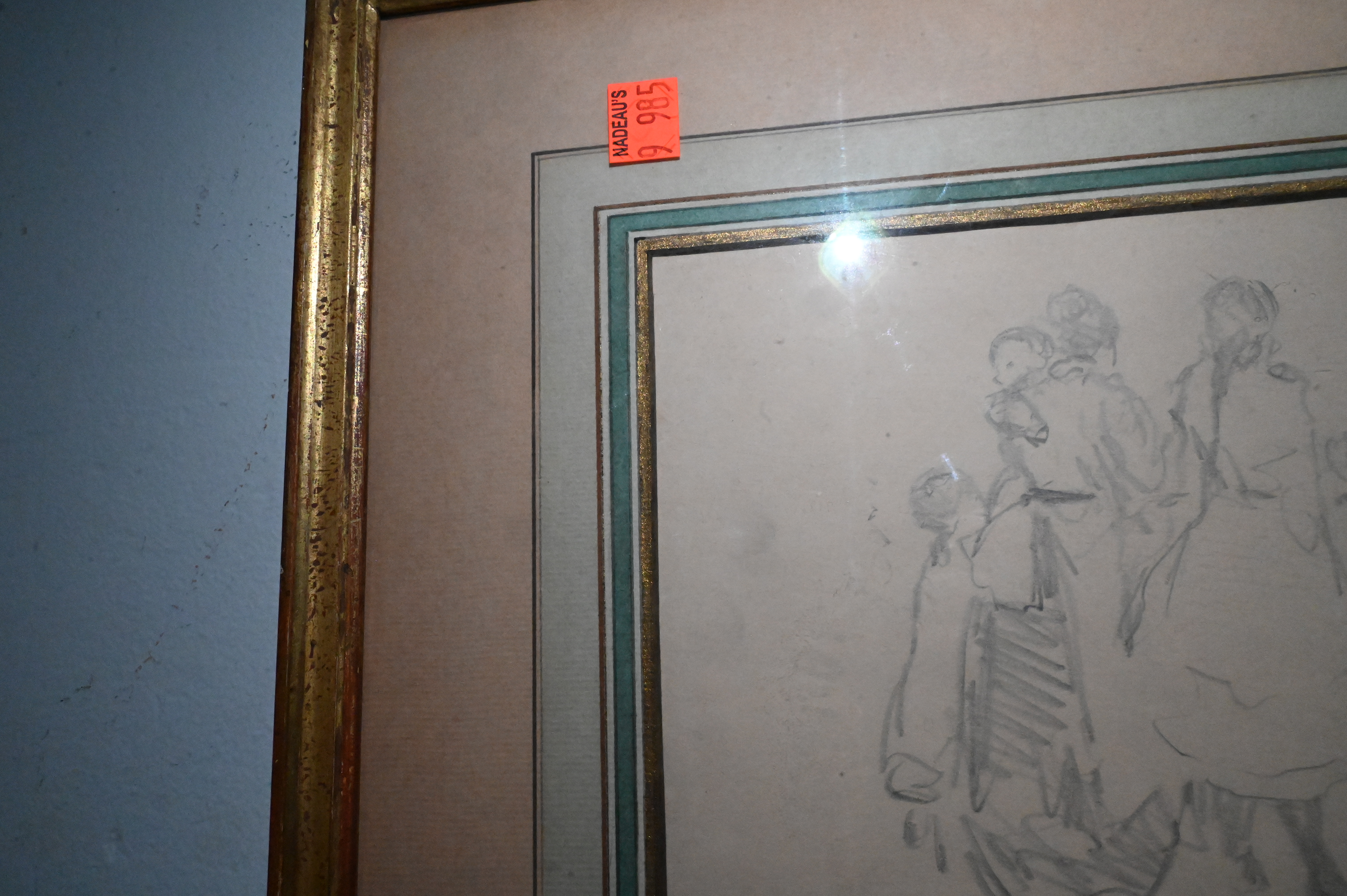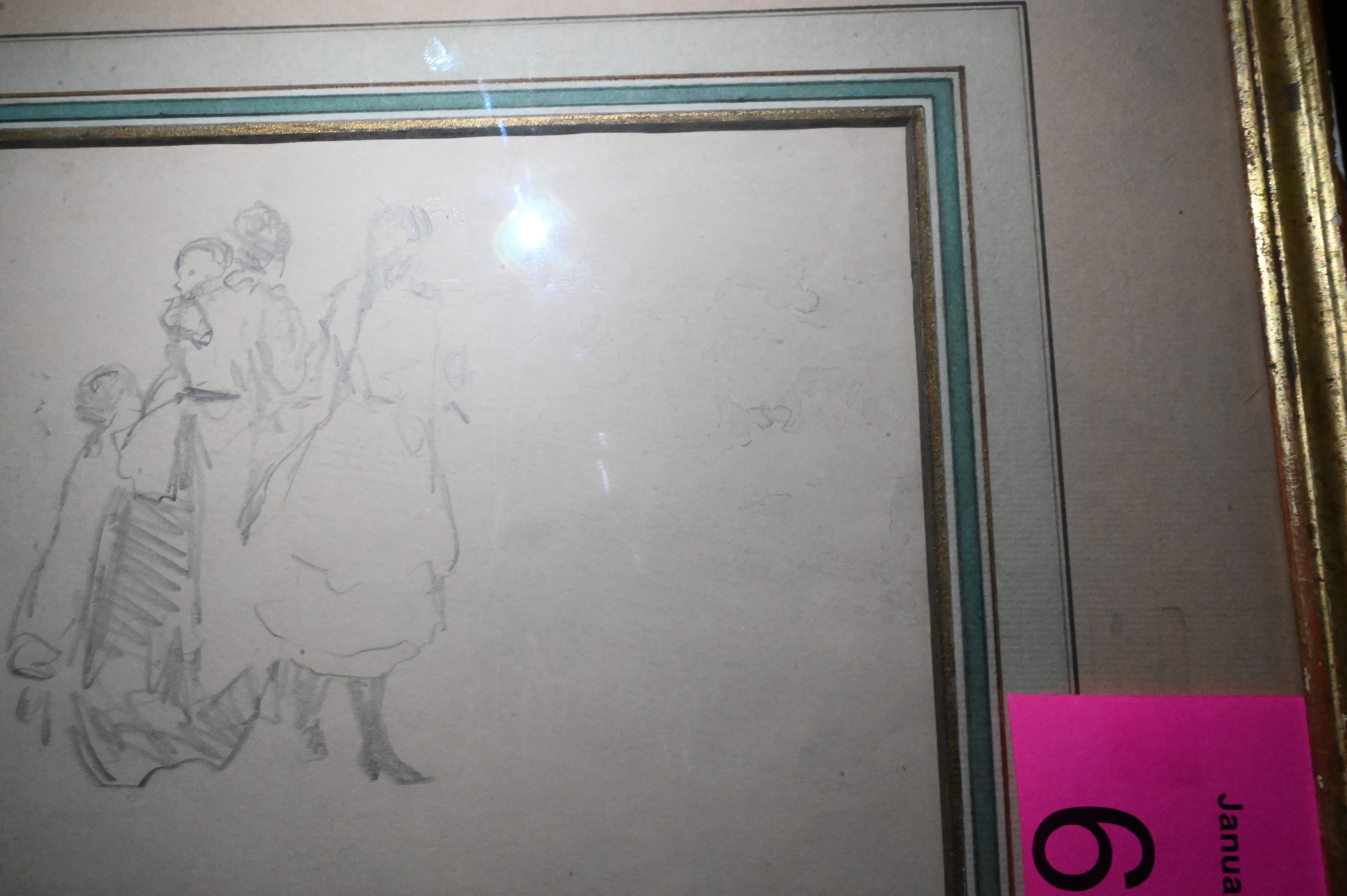 Light graphite sketch depicting a small group of figures, including a woman holding a child and two additional children at her side, rendered with quick, economical strokes characteristic of late 19th- to early 20th-century Impressionist draftsmanship; the loose handling and emphasis on gesture recall preparatory studies by Camille Pissarro and his circle