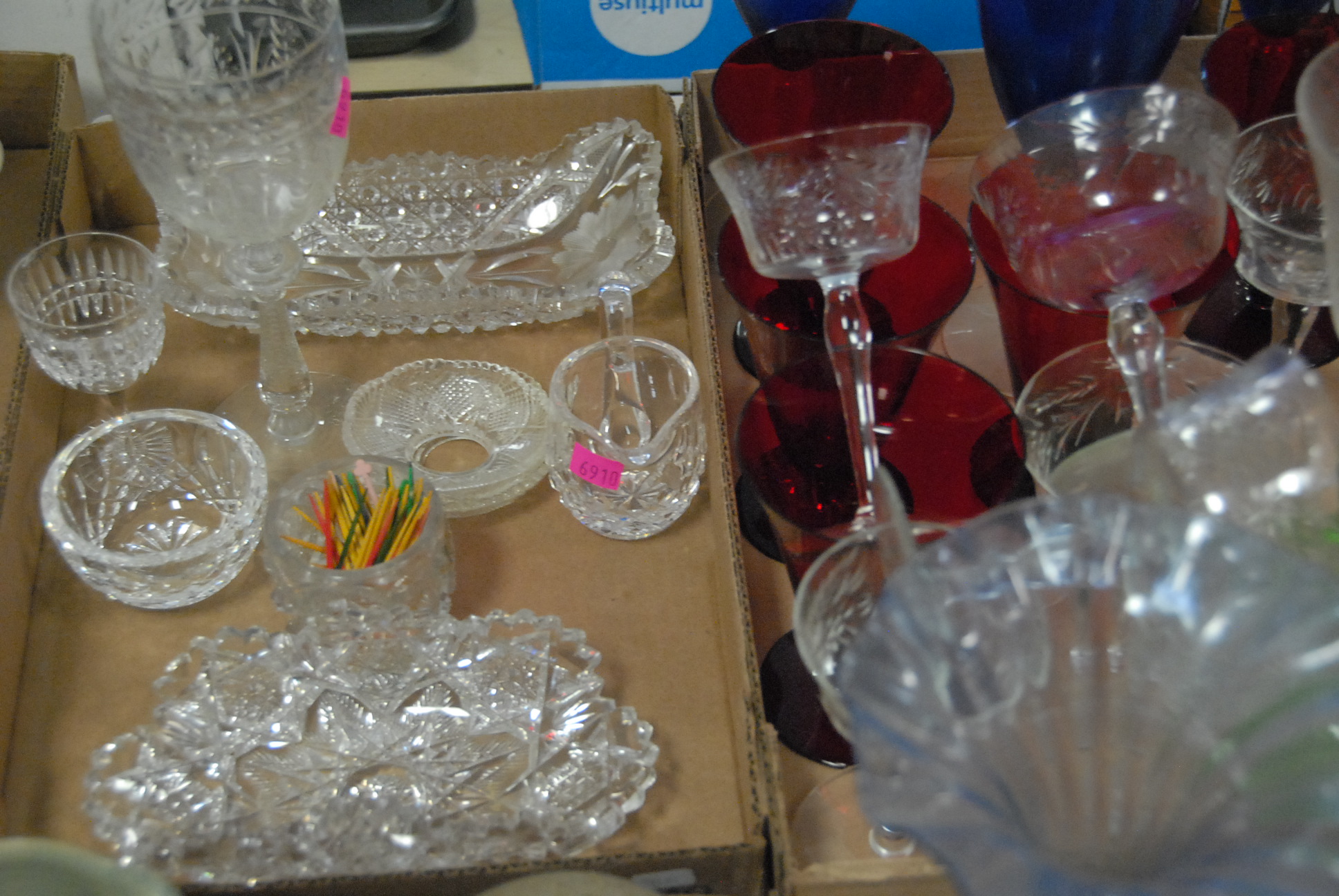 Five box lots of various stemware, partial sets, swirl tops with green bottoms, cobalt blue stems, Venetian glass vase, Venetian glass cologne bottle with stopper, cut crystal, small dishes, etc.
