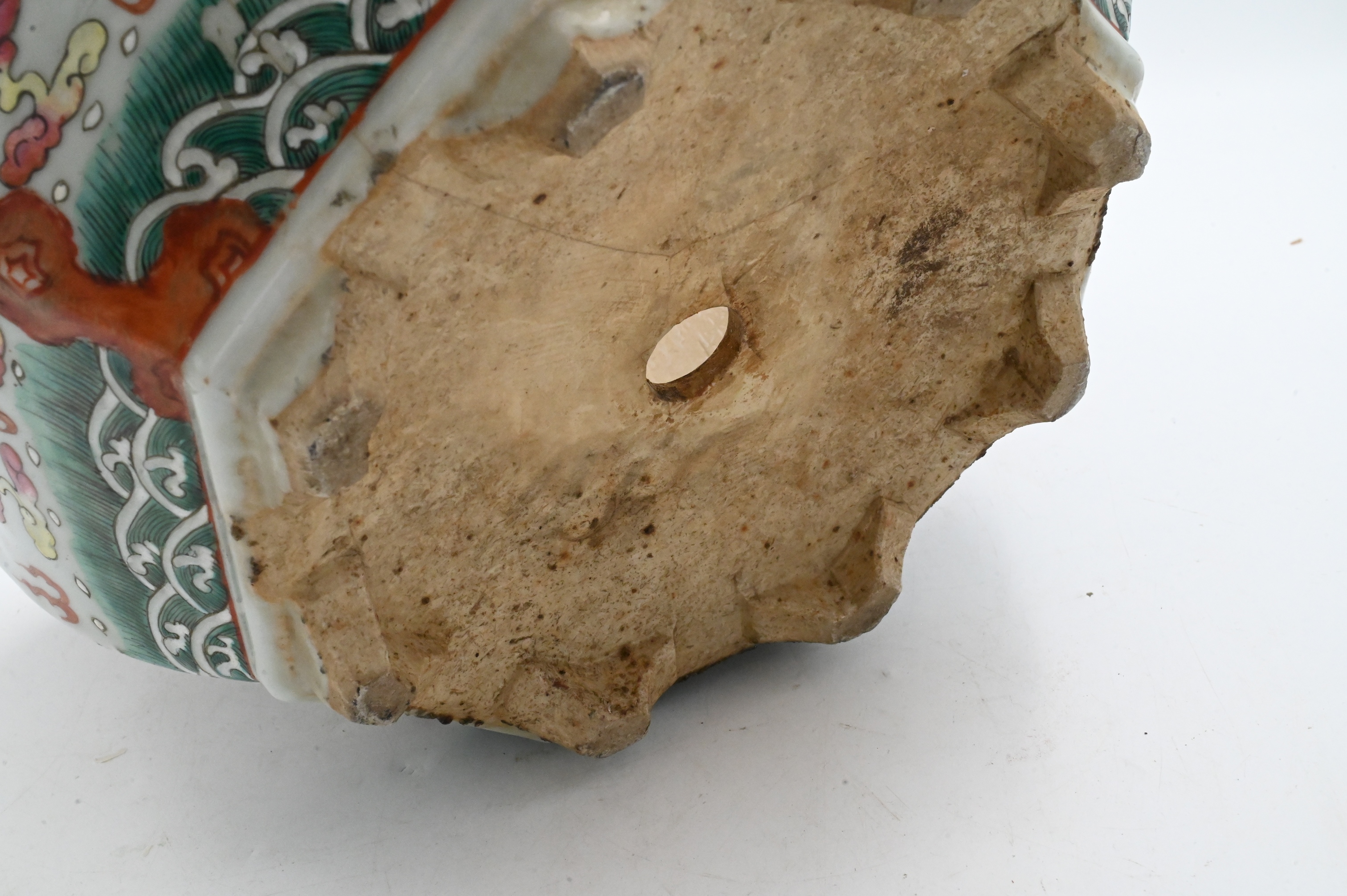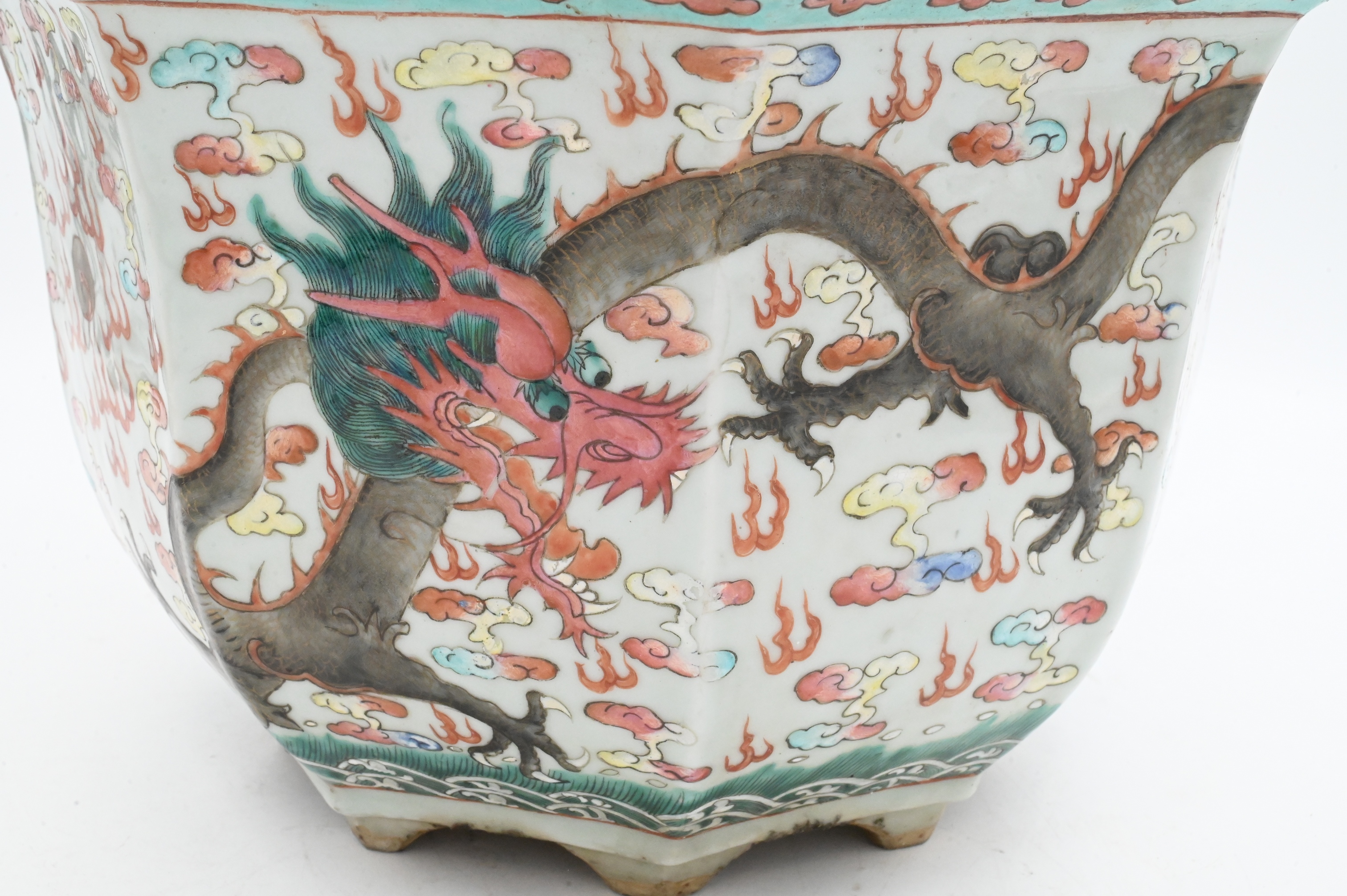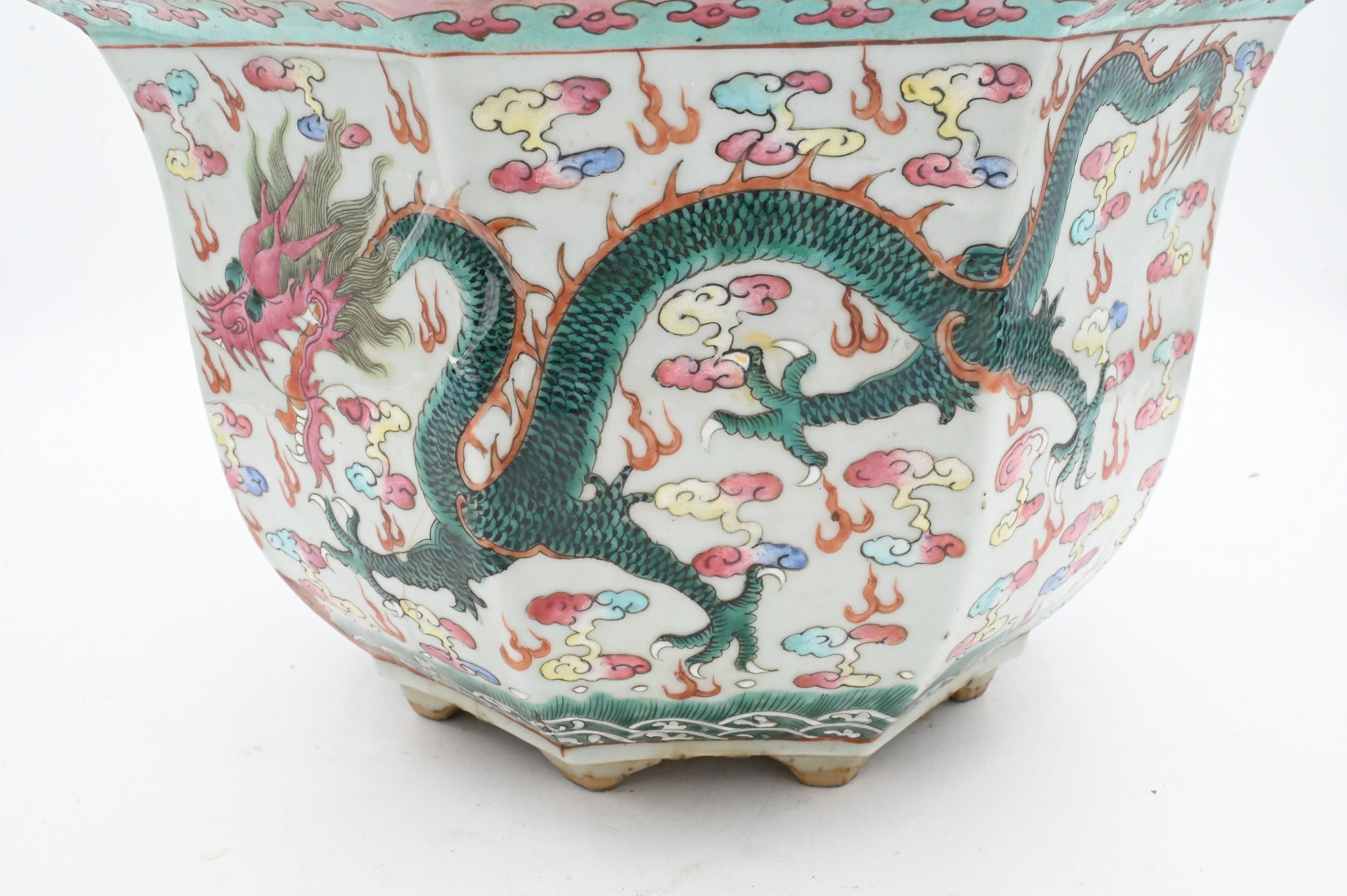 octogonal form featuring a green four clawed dragon amongst clouds and flames motif, drainage hole to bottom