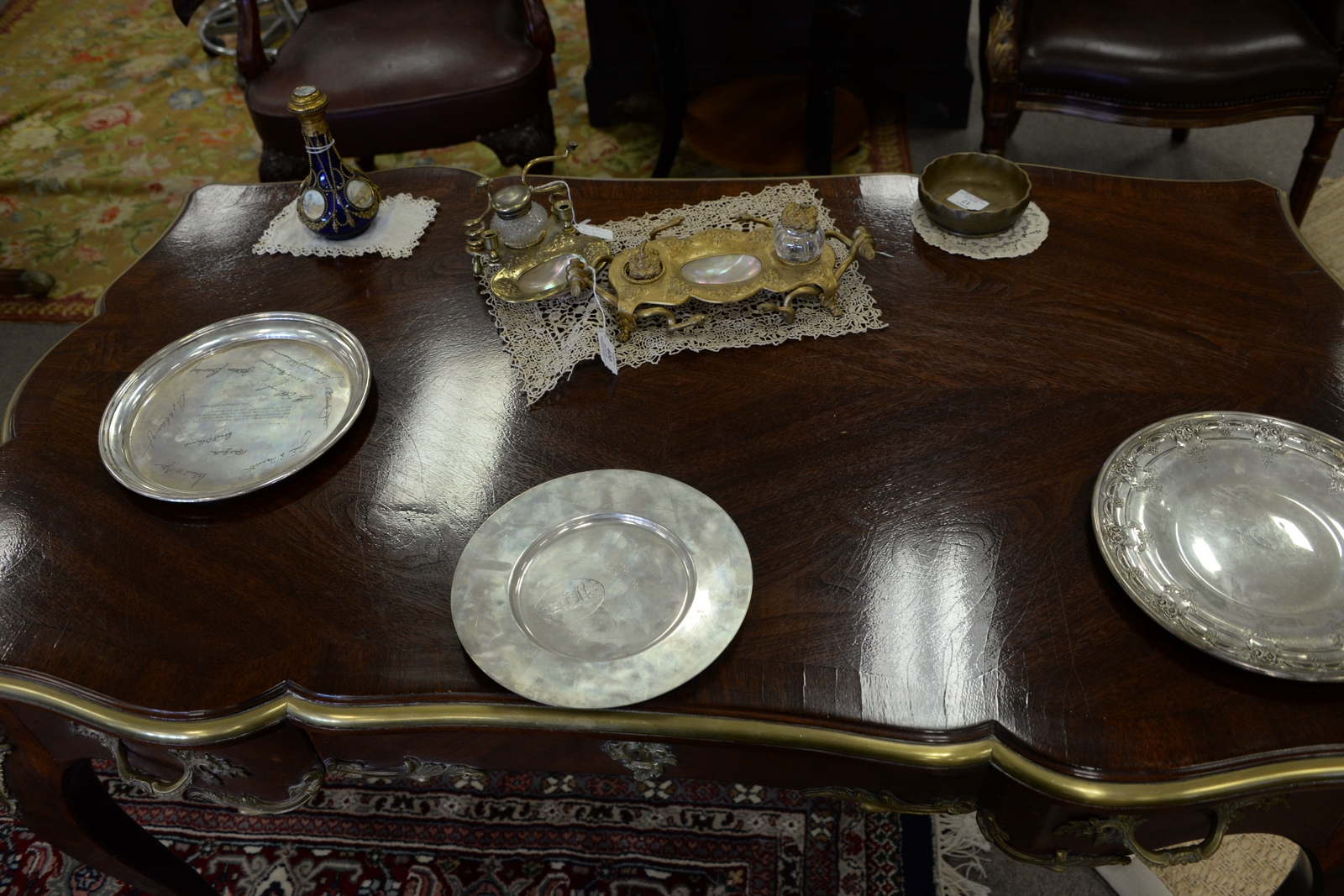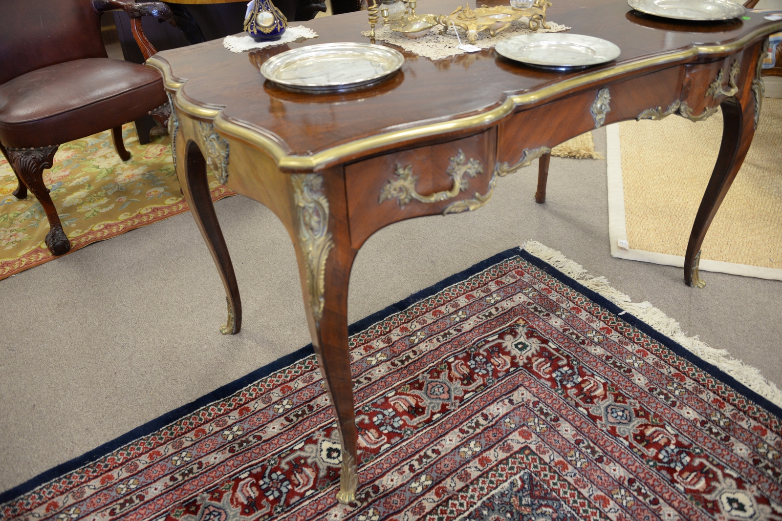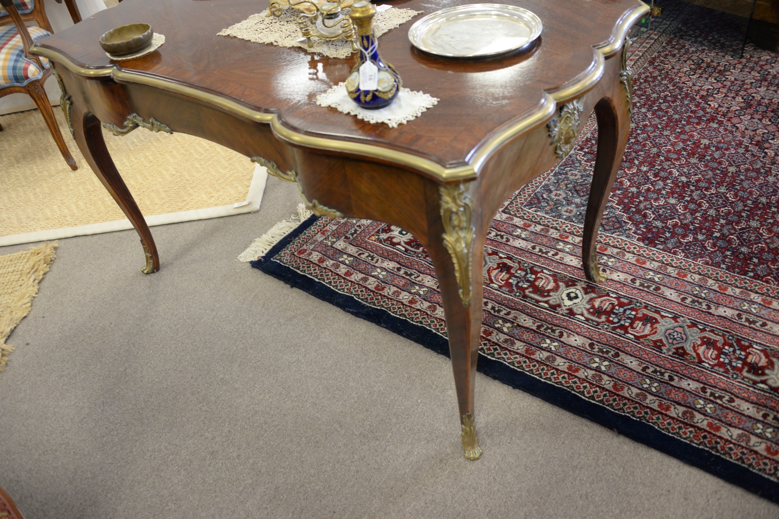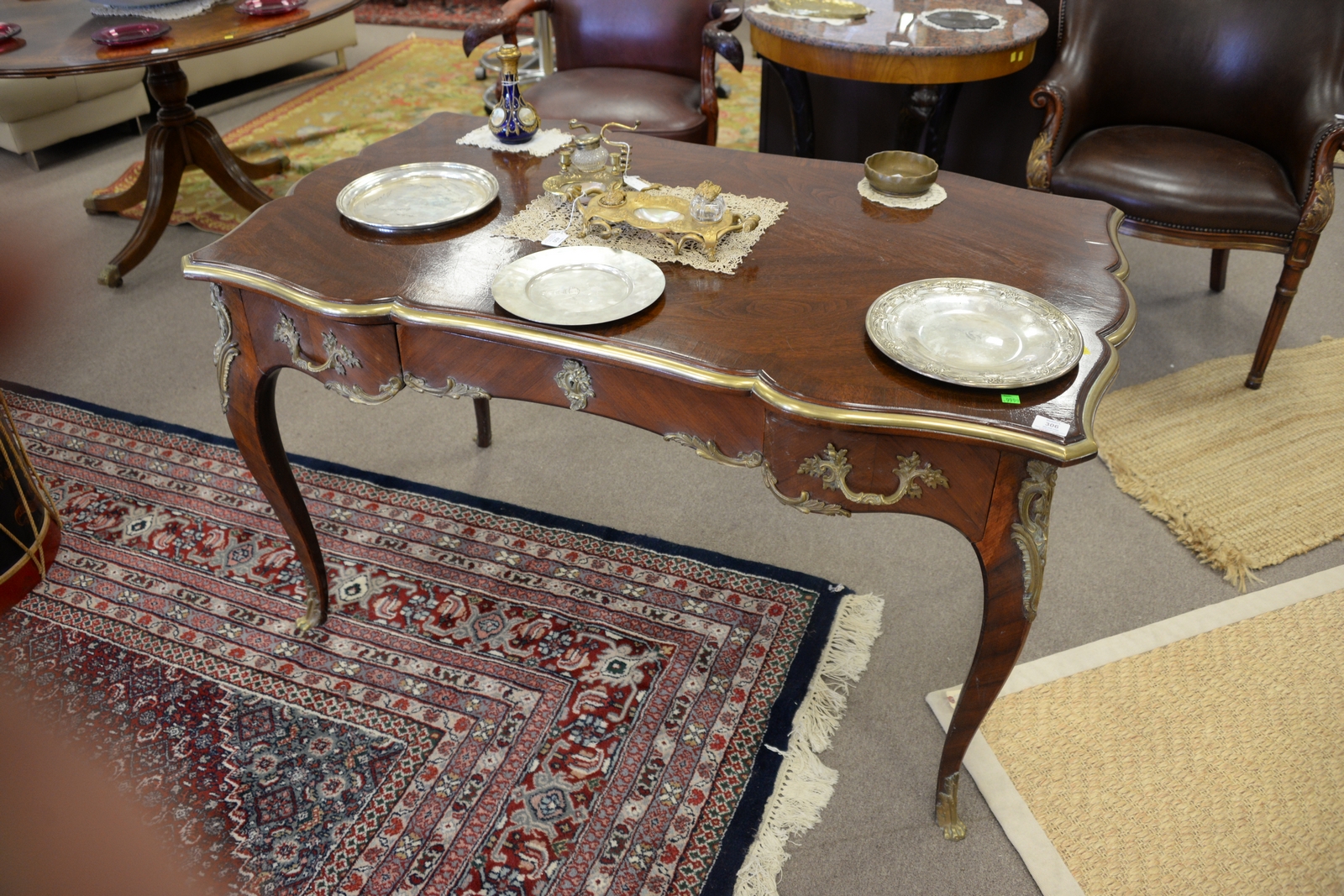 Lot 306: Louis XV style shaped top writing table with three drawers and brass mounts sun faded on one side. ht. 30in., top: 31 x 53