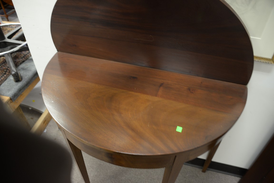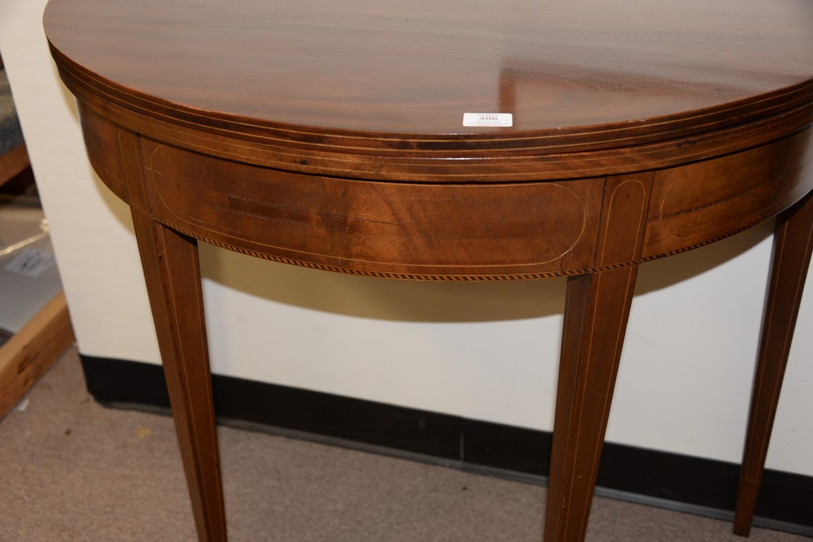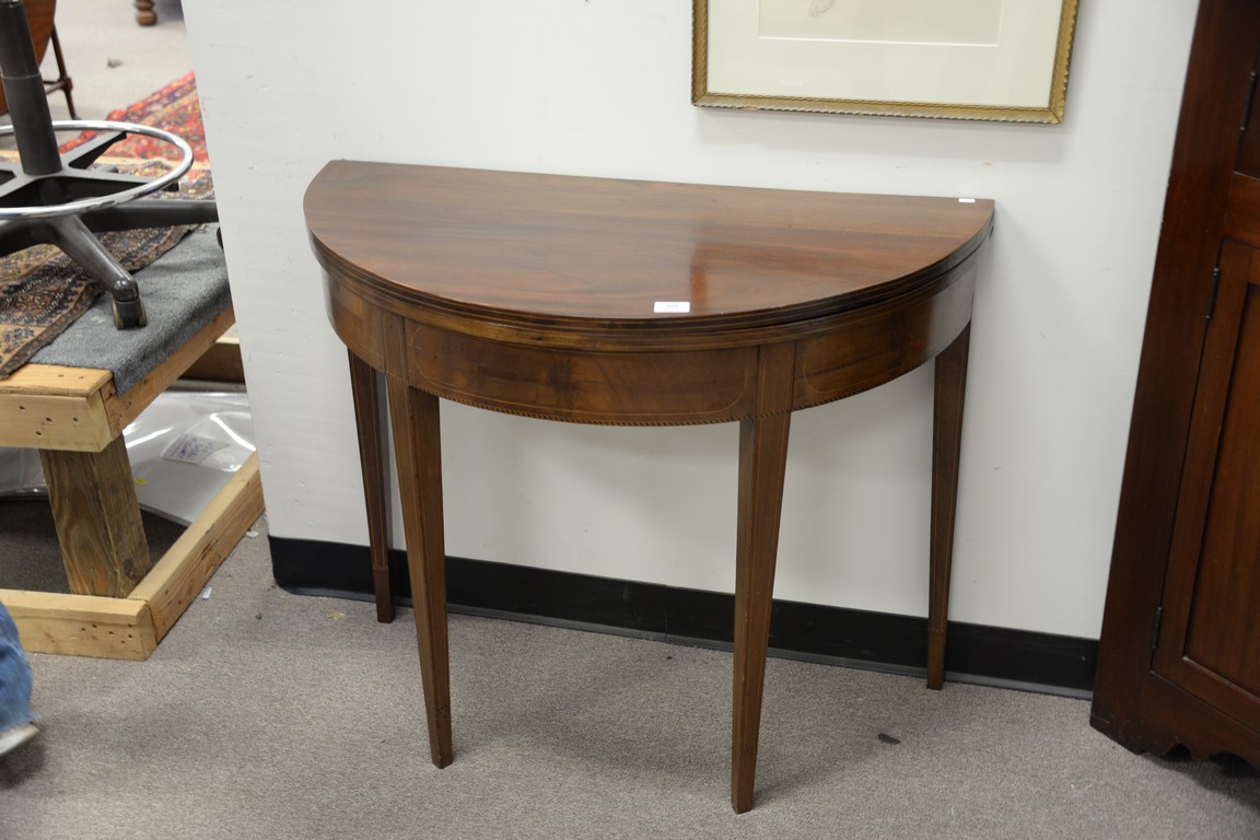 Lot 306: Mahogany Federal style demilune game table with line inlaid front and tapered legs. ht. 30in., lg. 36in.