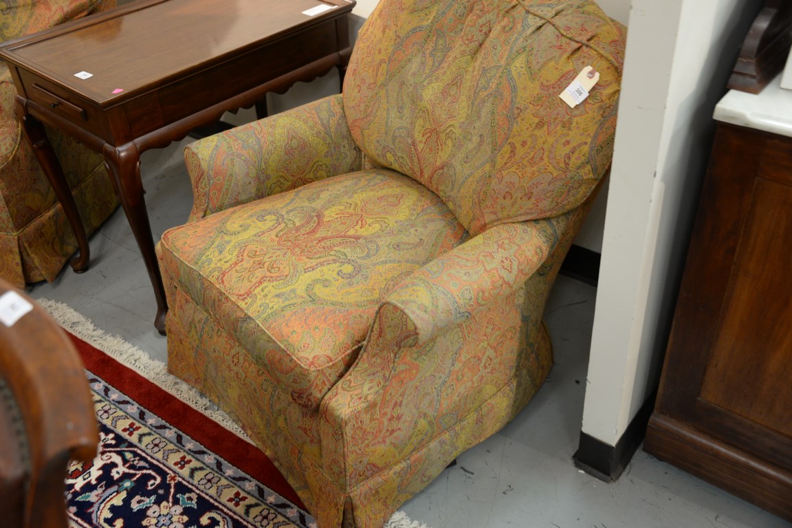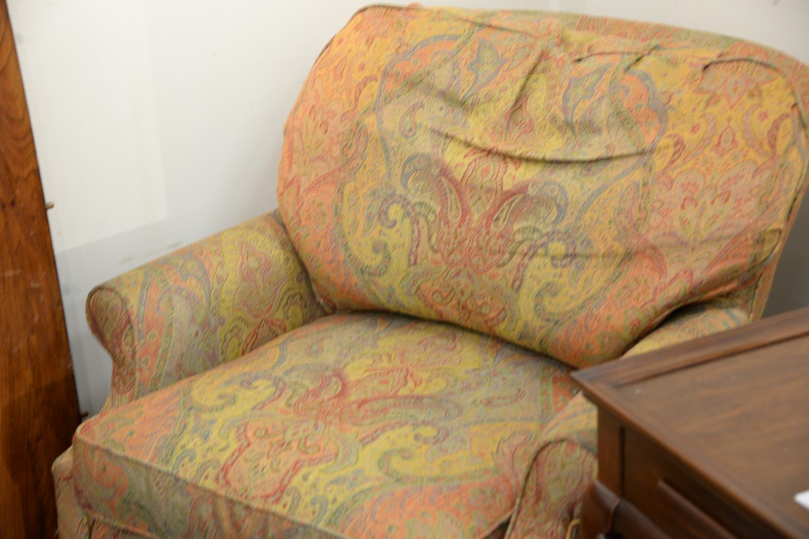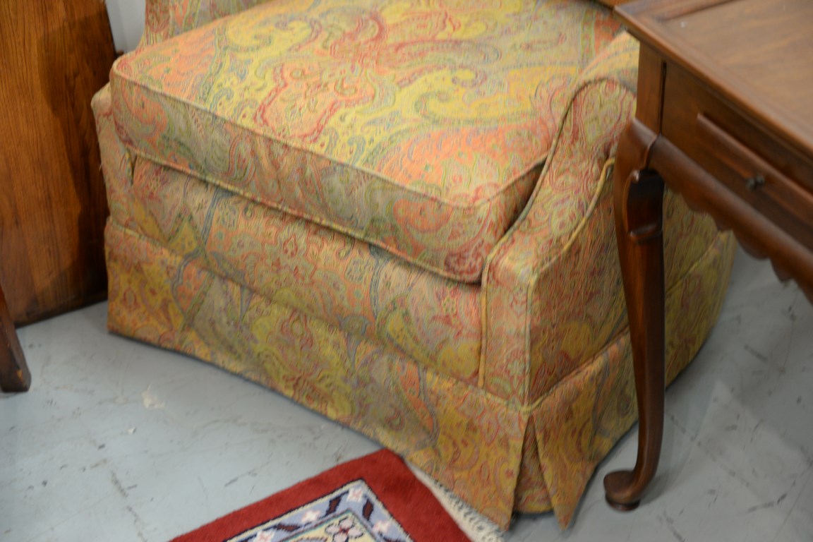 Pair of calico corner upholstered swivel rockers.