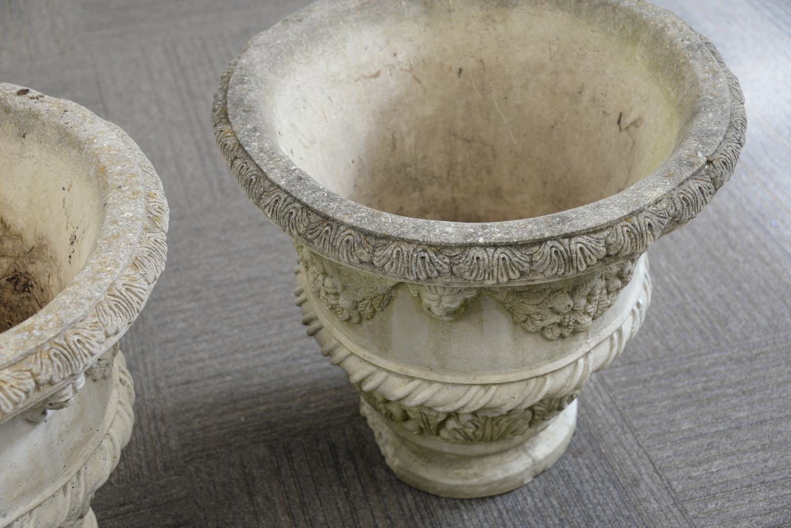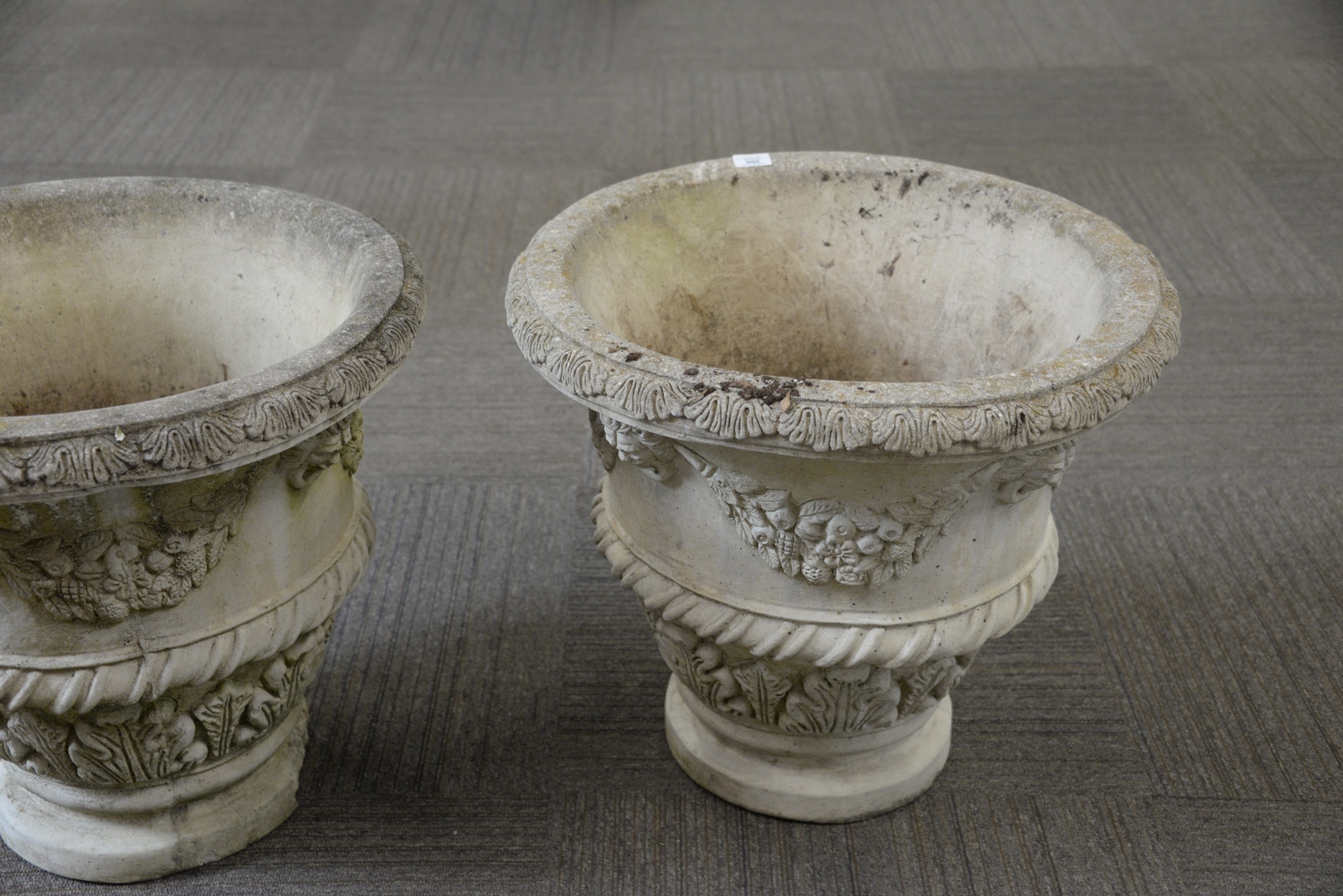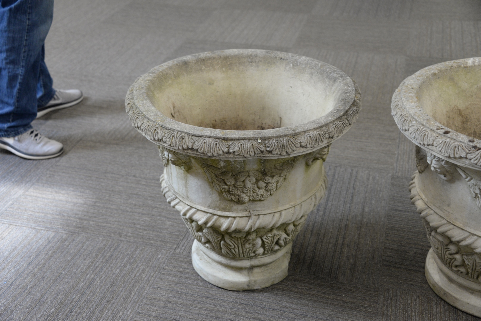 Lot 306: Pair of Concrete Urns with faces and wreaths, signed Nina Studio P249, height 22 inches, width 23 inches.