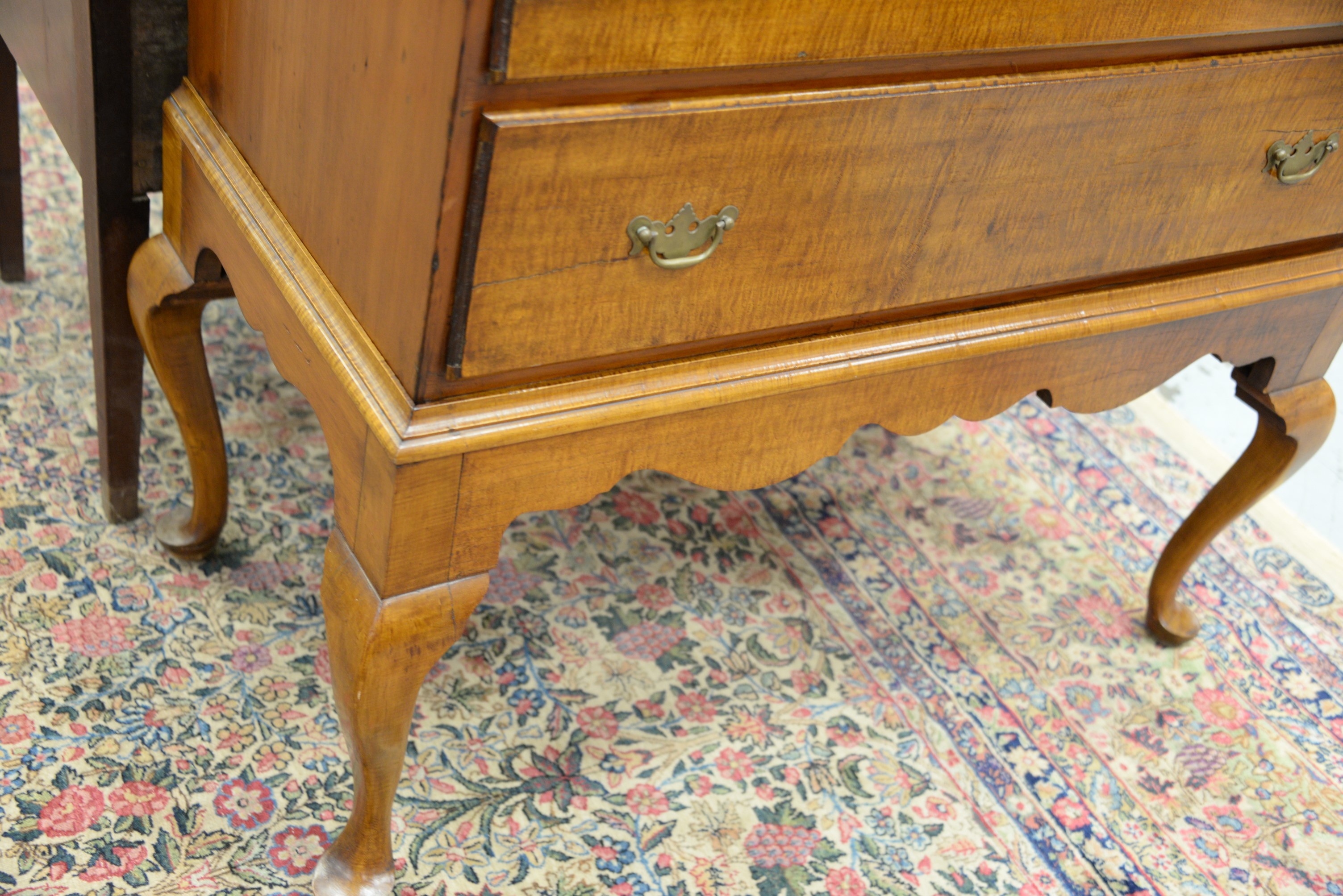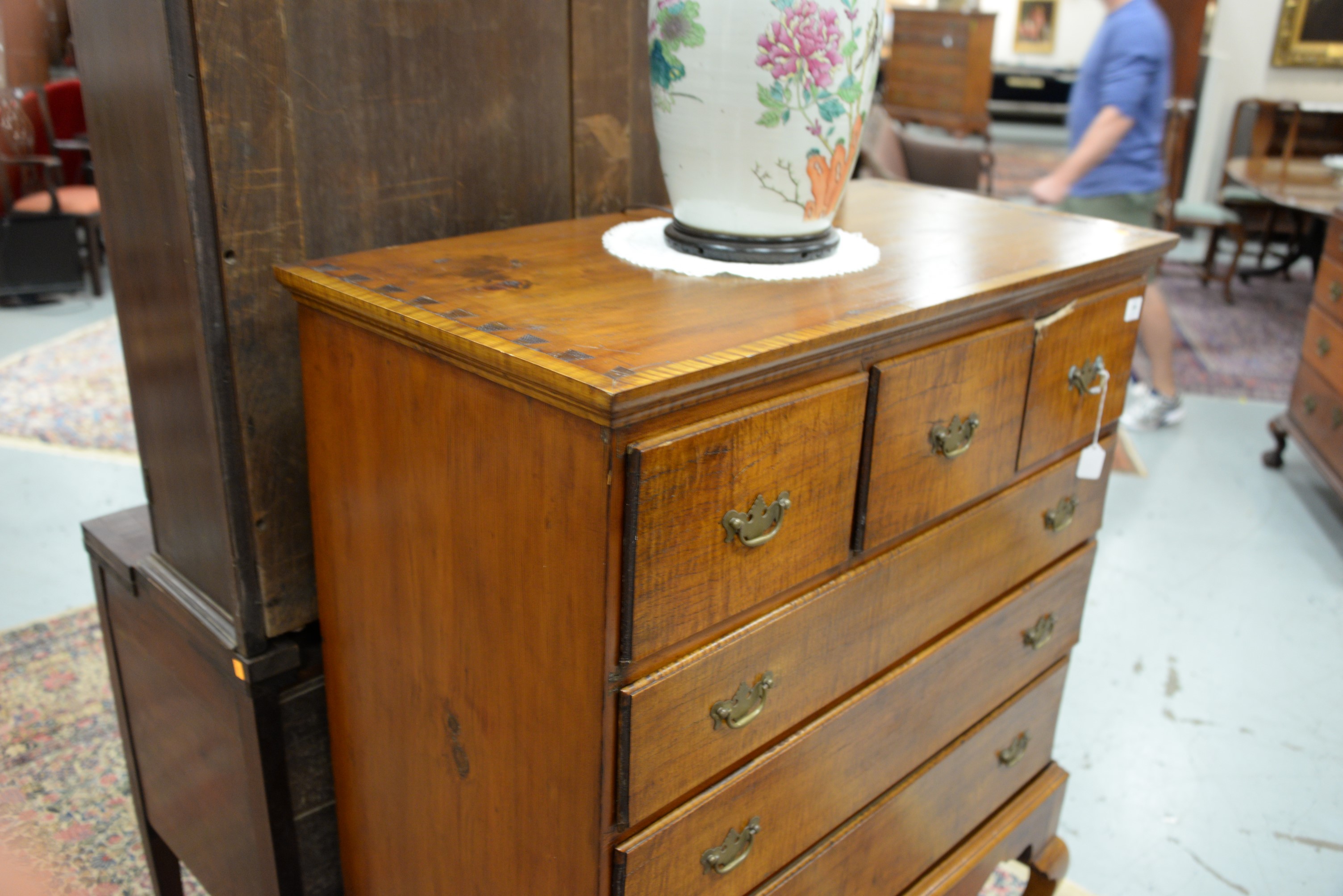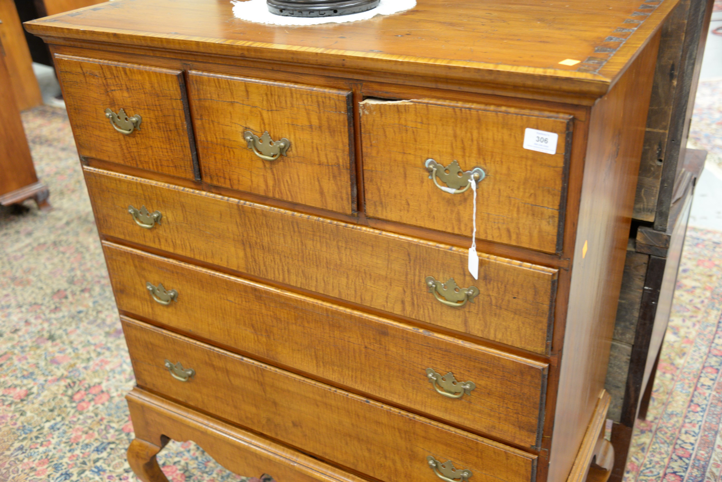 Lot 306: Queen Anne chest on frame chest with three short drawers over three long drawers set on frame with cabriole legs ending in pad feet,…