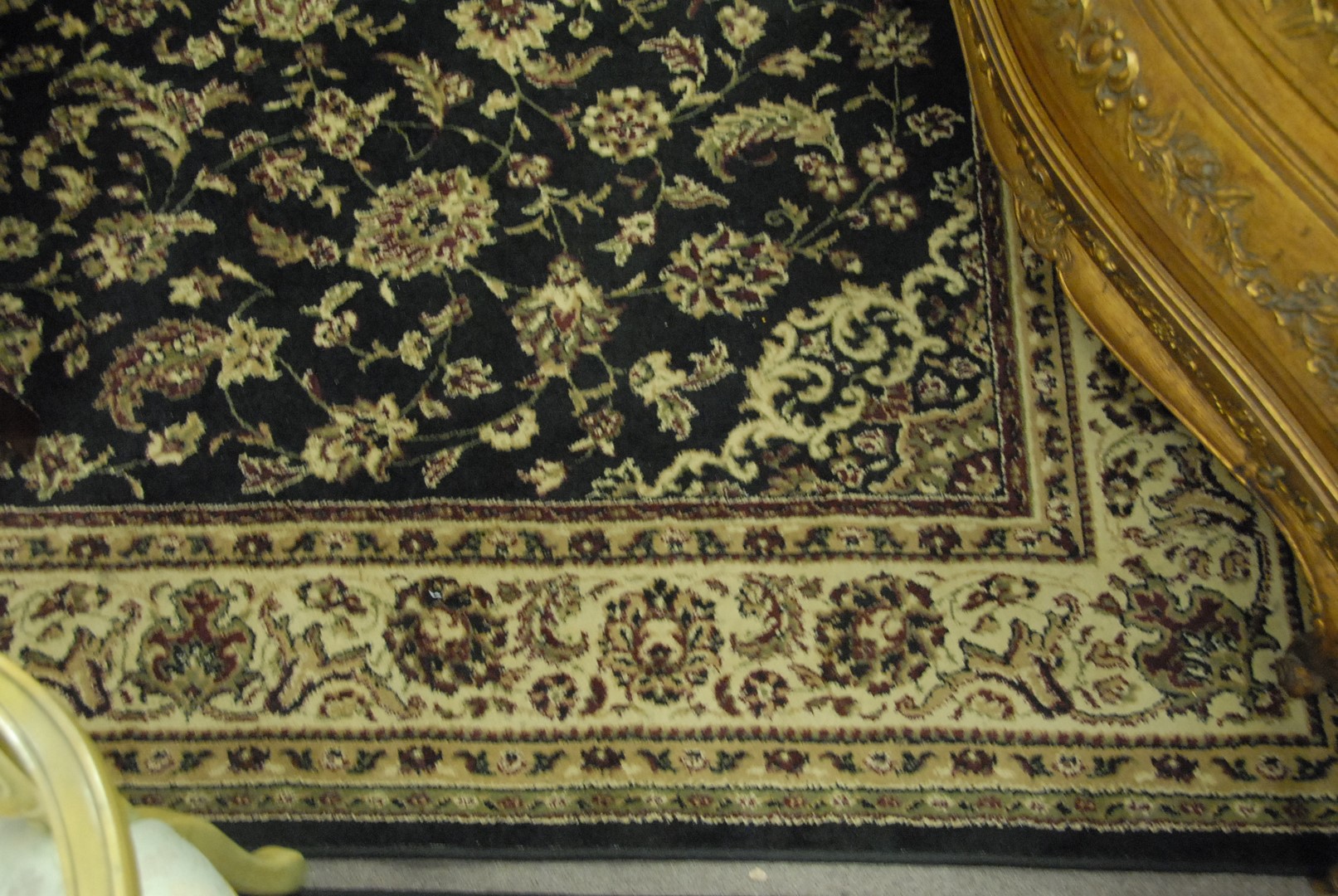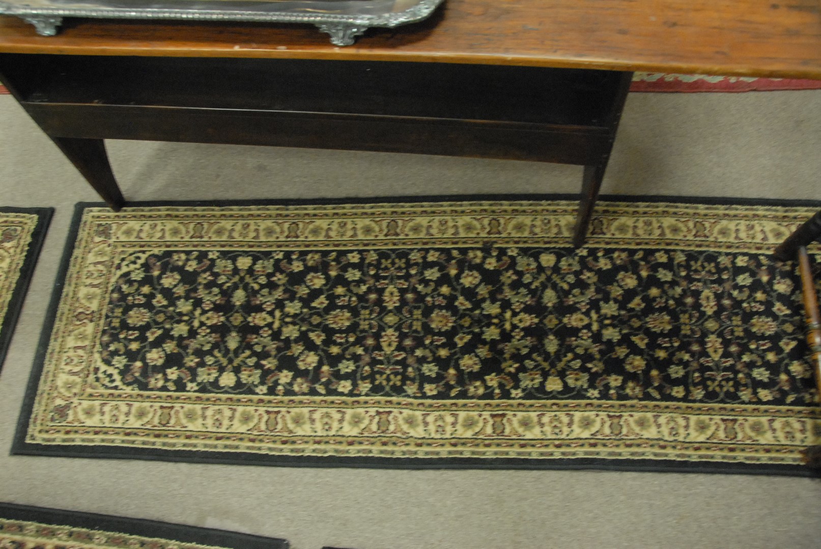 Three black and tan machine made rugs including room size, medium size, and a runner. 7’7 x 11′, 5’5 x 7’7, and 2’1 x 7’7