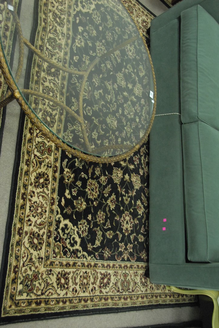 Lot 306: Three black and tan machine made rugs including room size, medium size, and a runner. 7’7 x 11′, 5’5 x 7’7, and 2’1 x 7’7
