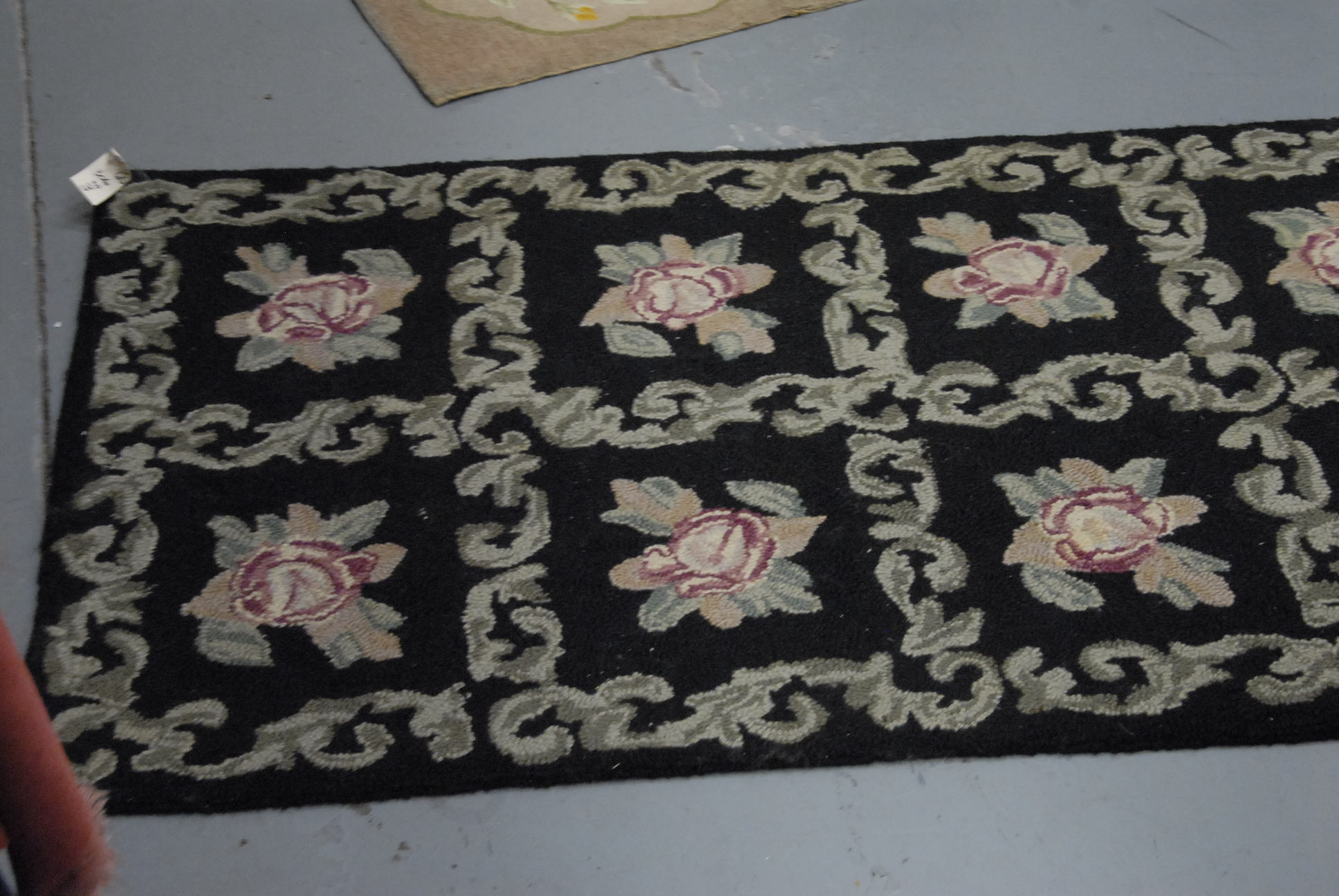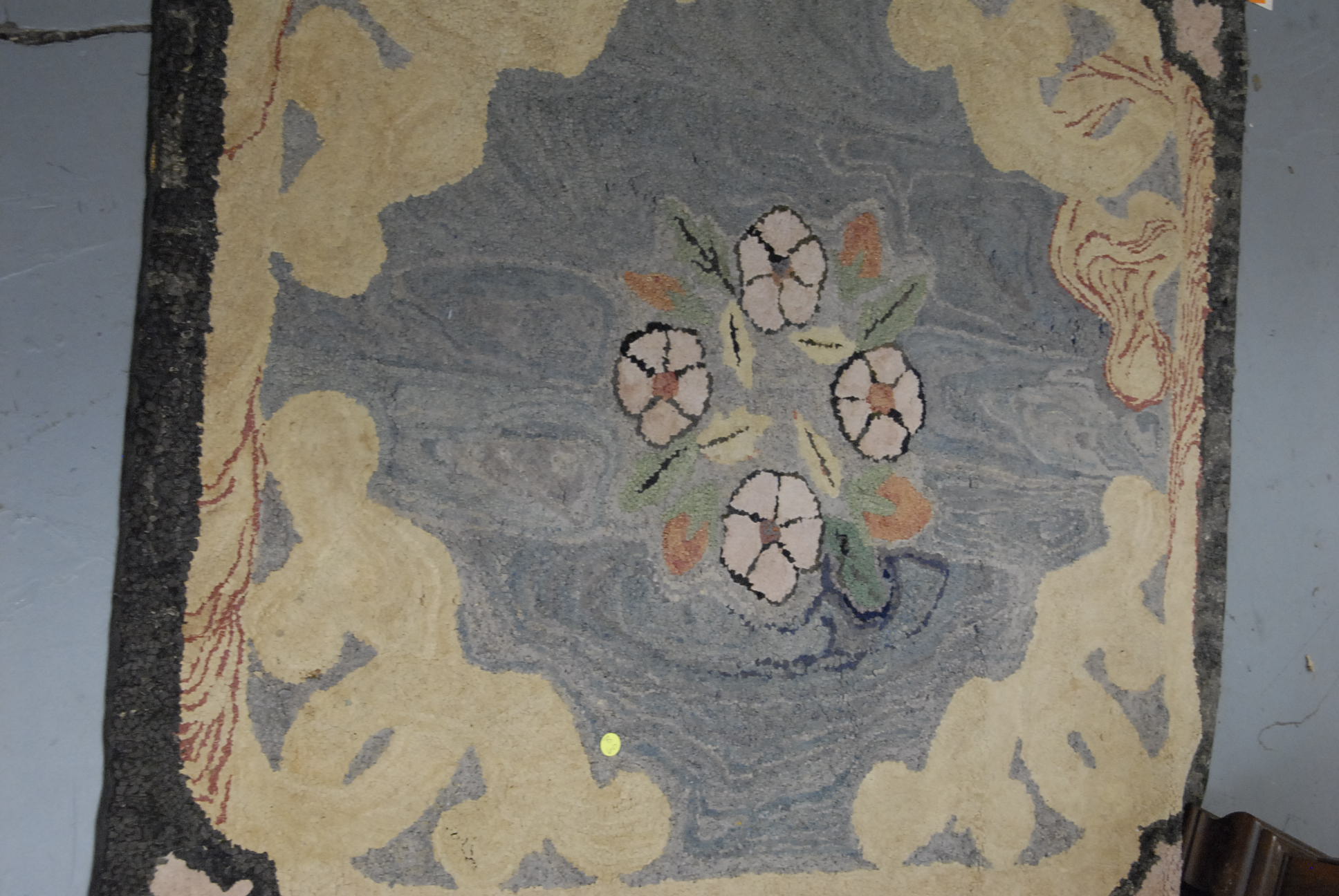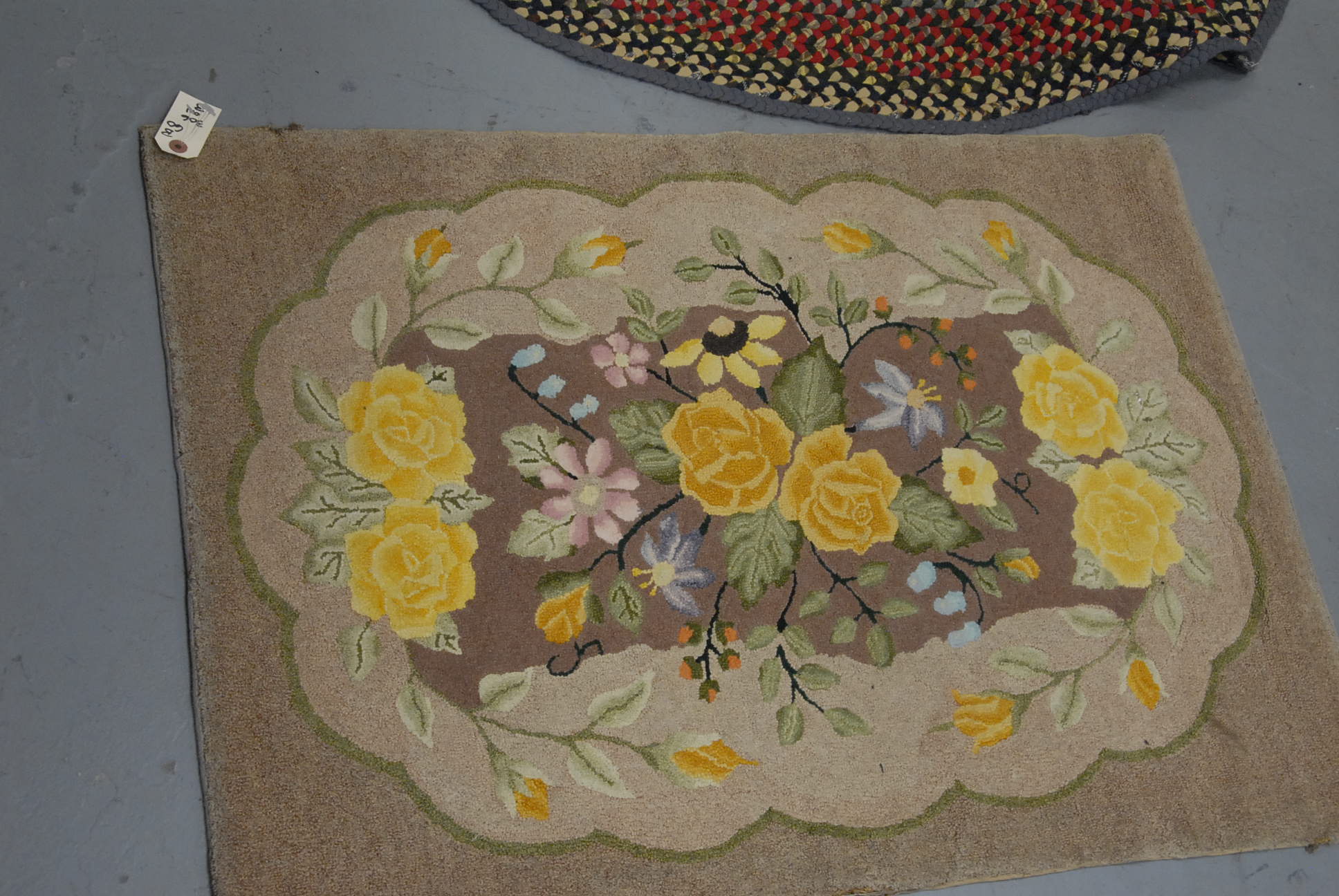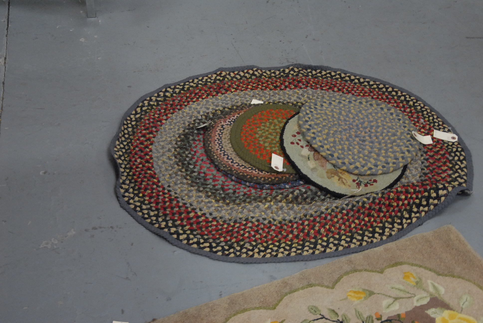 Three floral hooked rugs along with oval braided rug and some seat rugs