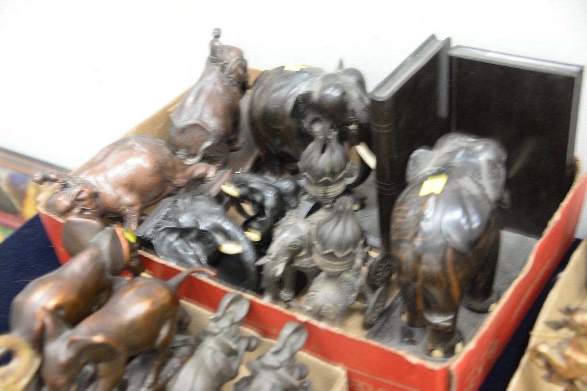 Lot 306: Two box lots of elephants and bookends to include sand clad bronze, iron elephants, hardwood carved elephants, etc.