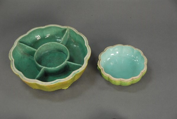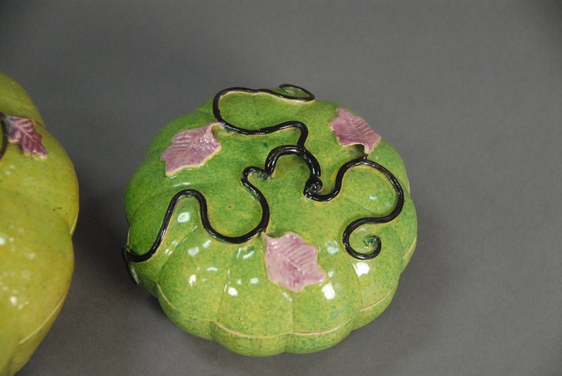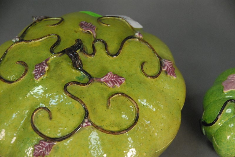 Lot 306: Two Oriental moulded porcelain covered boxes having moulded vine and leaf decoration, dia. 5 in. & dia. 8 in.