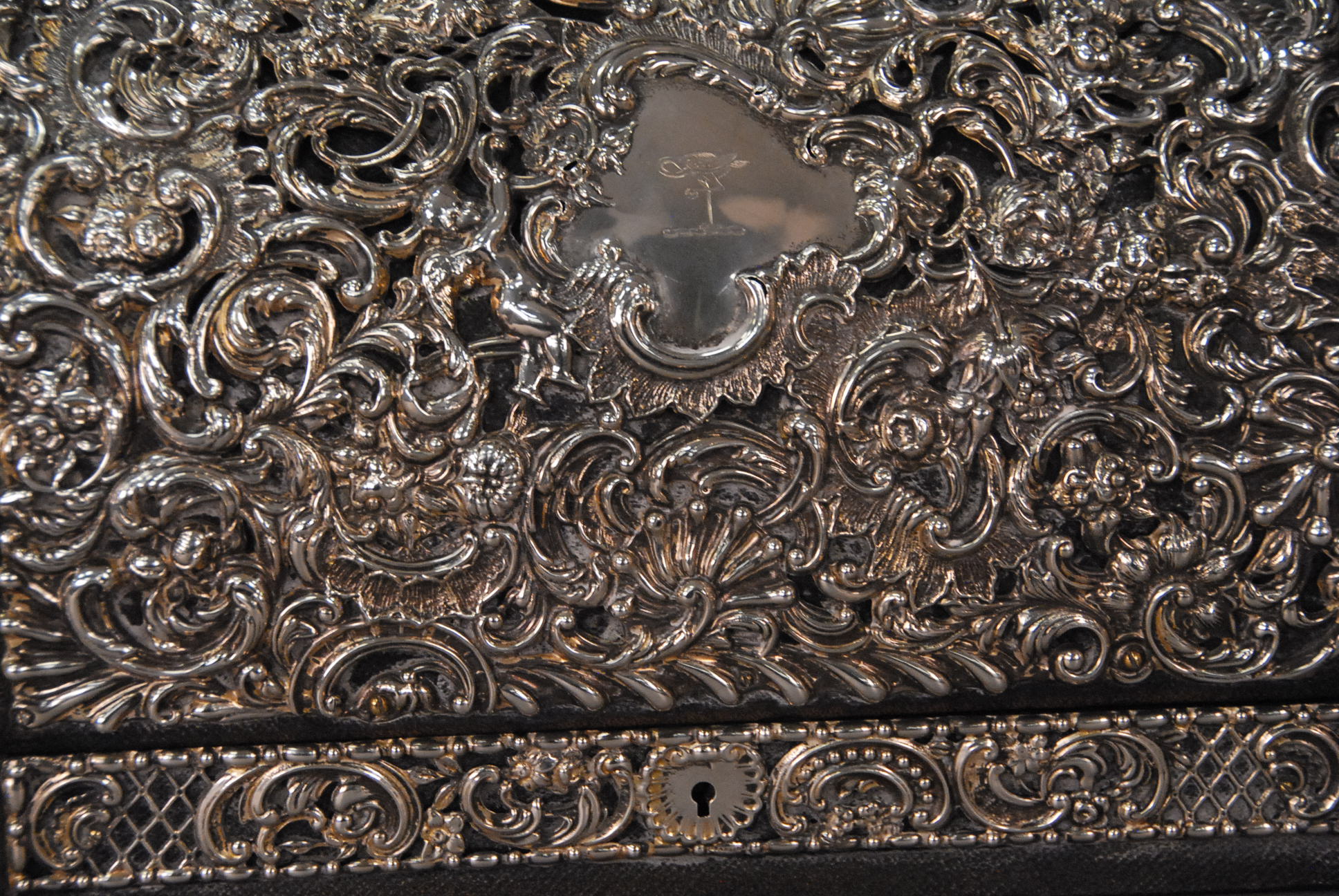 Lot 306: Two piece lot to include leather letter box and book with half round hinged lid, overlaid with repousse silver with putti, each with etched flamingo on front. ht. 8 1/2in. book: 11 1/2 x 9 1/2