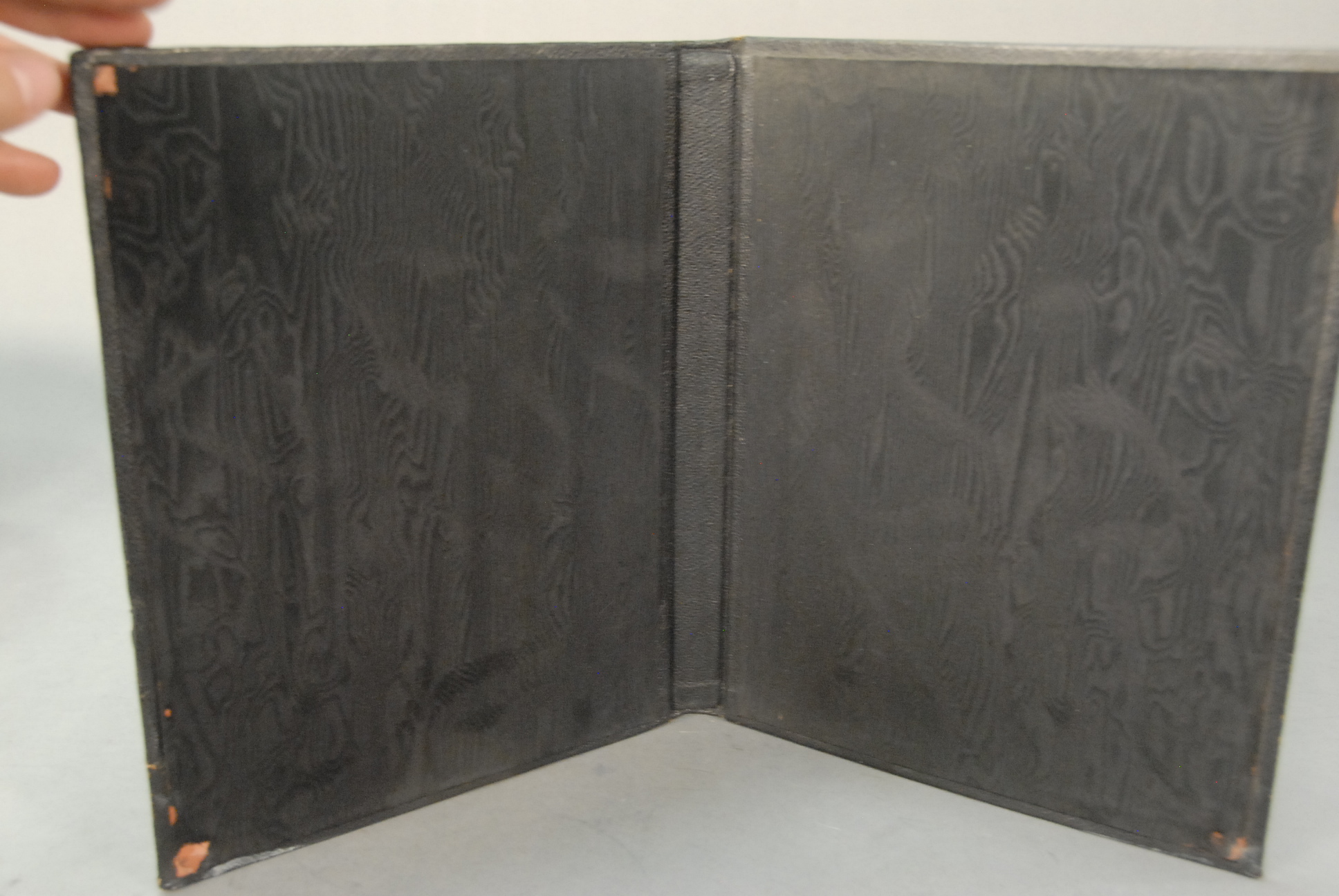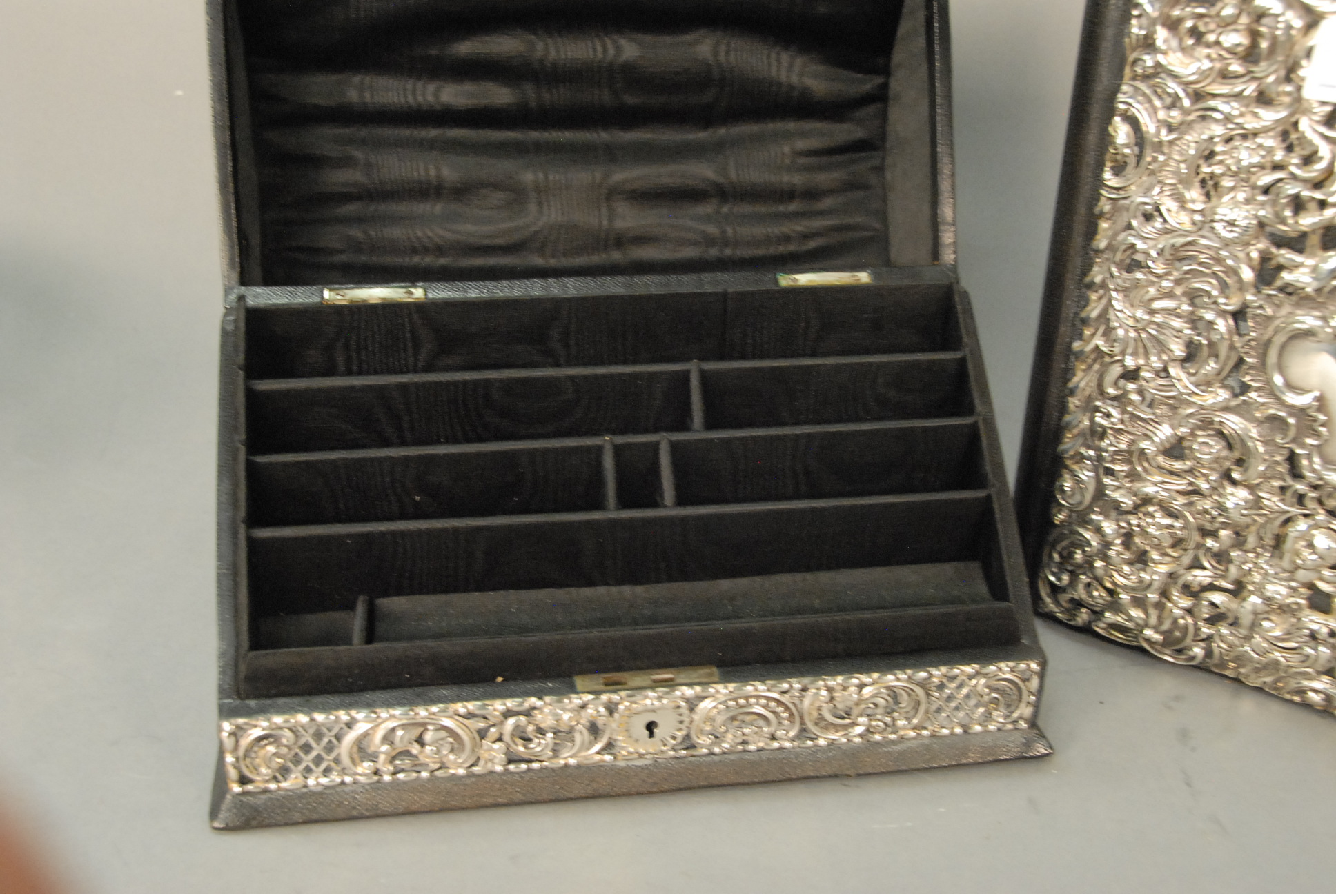 Two piece lot to include leather letter box and book with half round hinged lid, overlaid with repousse silver with putti, each with etched flamingo on front. ht. 8 1/2in. book: 11 1/2 x 9 1/2