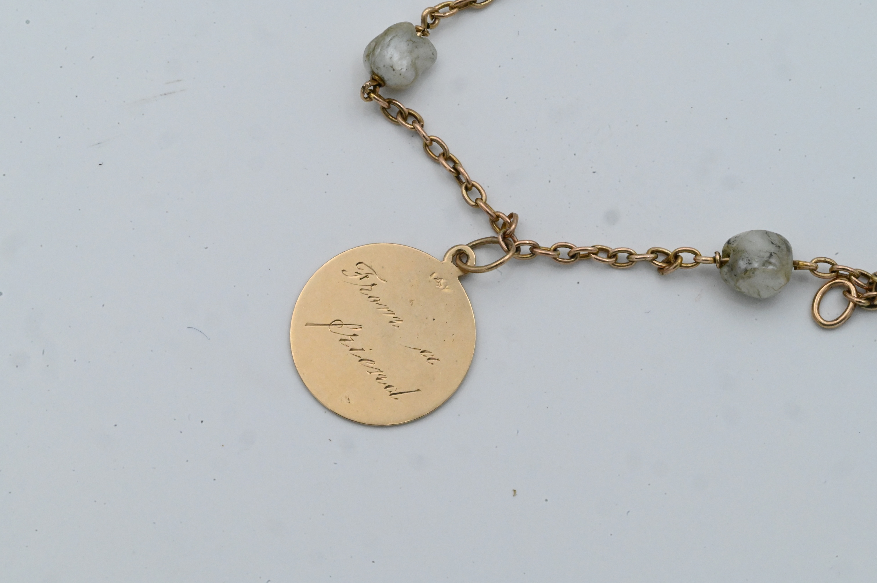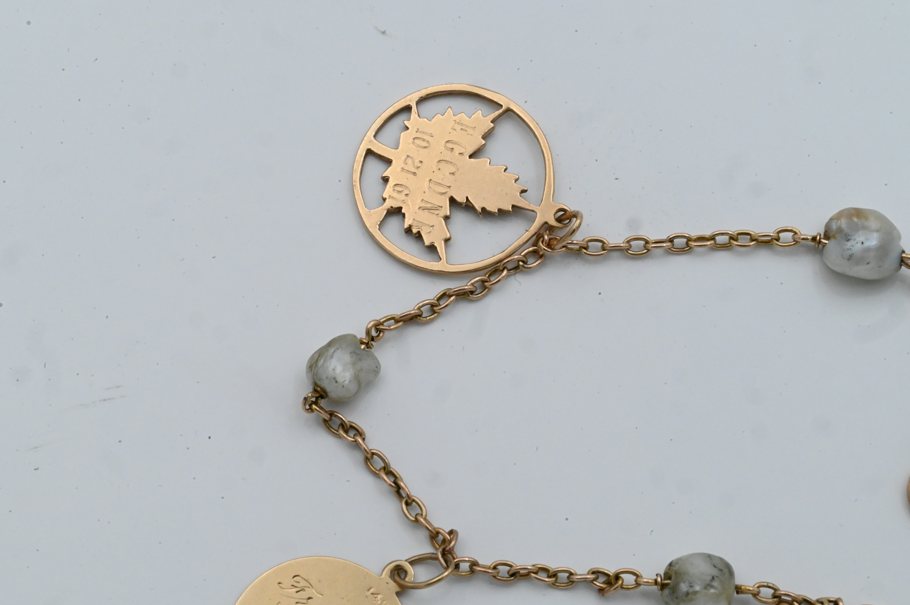 having four 14K gold charms and three baroque pearls