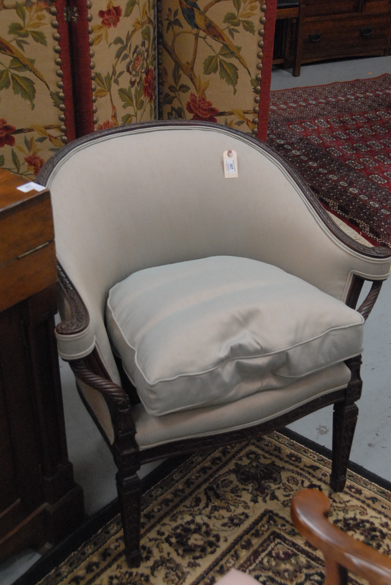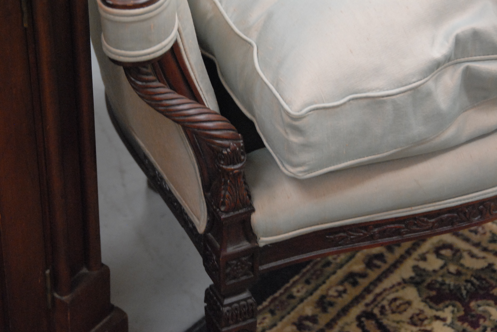 Aqua silk upholstered chair with barrel back crack in back rail.
