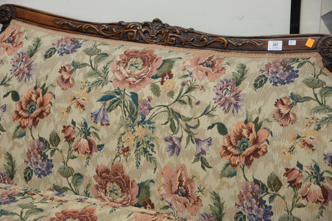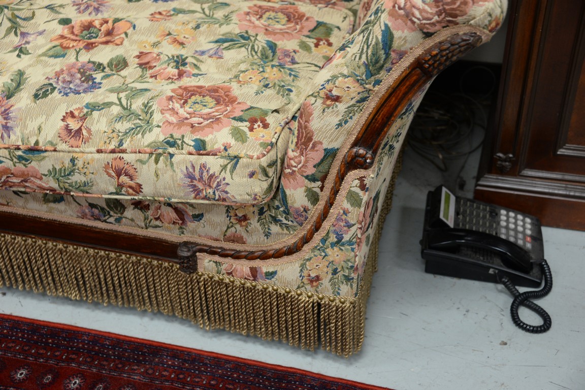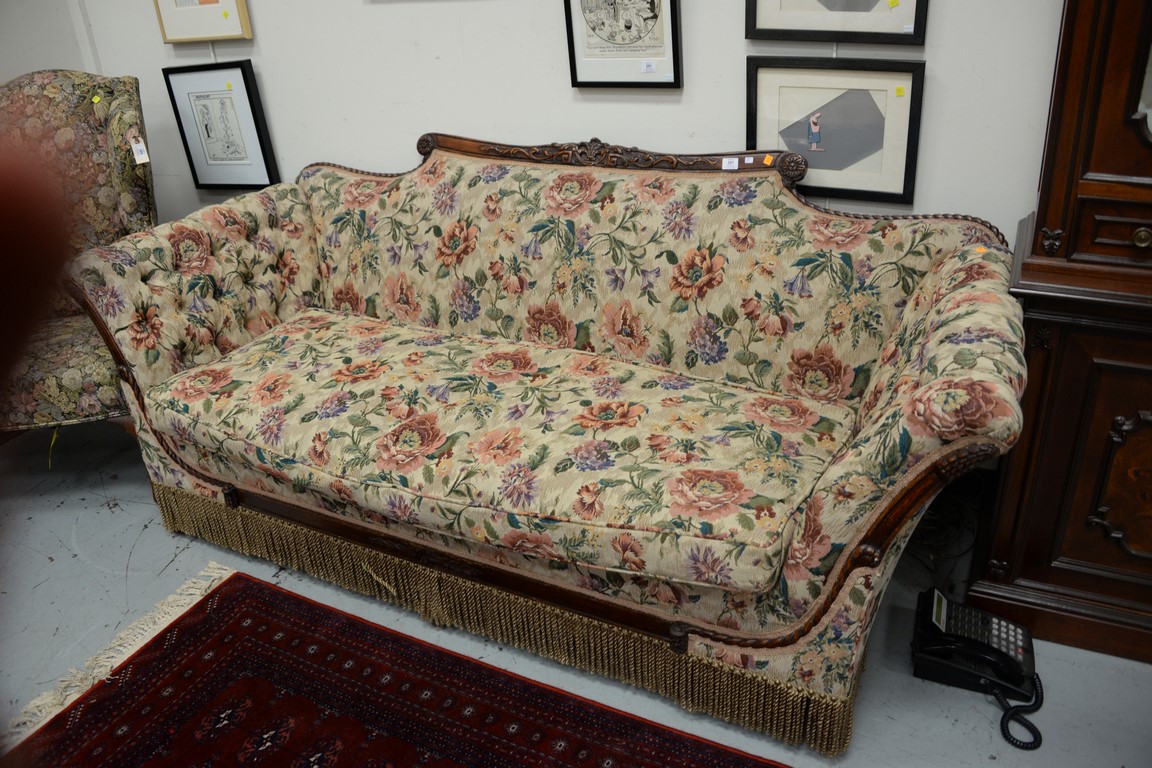 Carved mahogany sofa in tapestry style upholstery. lg. 84 in.