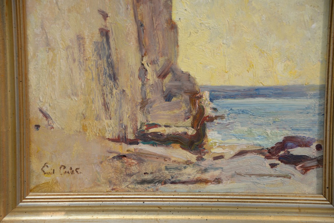 EMIL CARLSEN 1848-1932 Coastal Scene with Cliff Side oil on board signed lower left Emil Carlsen Estate stamp on reverse of Florence G. Carlsen, wife of artist 15 x 12