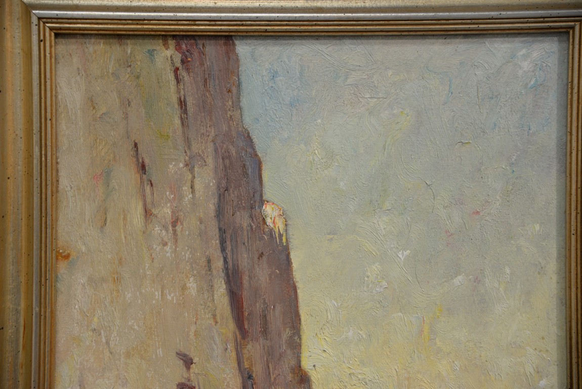 Lot 307: EMIL CARLSEN 1848-1932 Coastal Scene with Cliff Side oil on board signed lower left Emil Carlsen Estate stamp on reverse of Florence G. Carlsen, wife of artist 15 x 12
