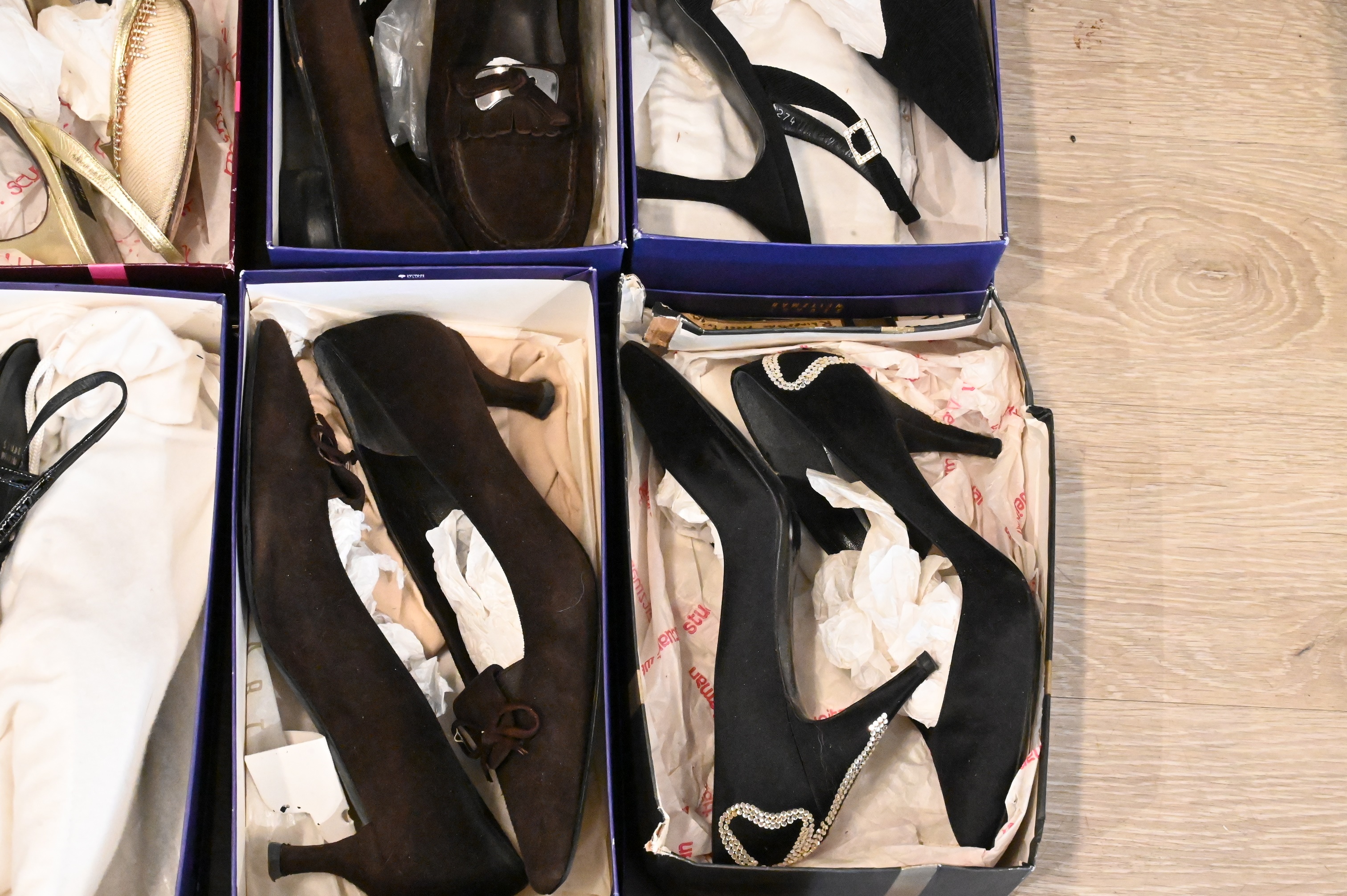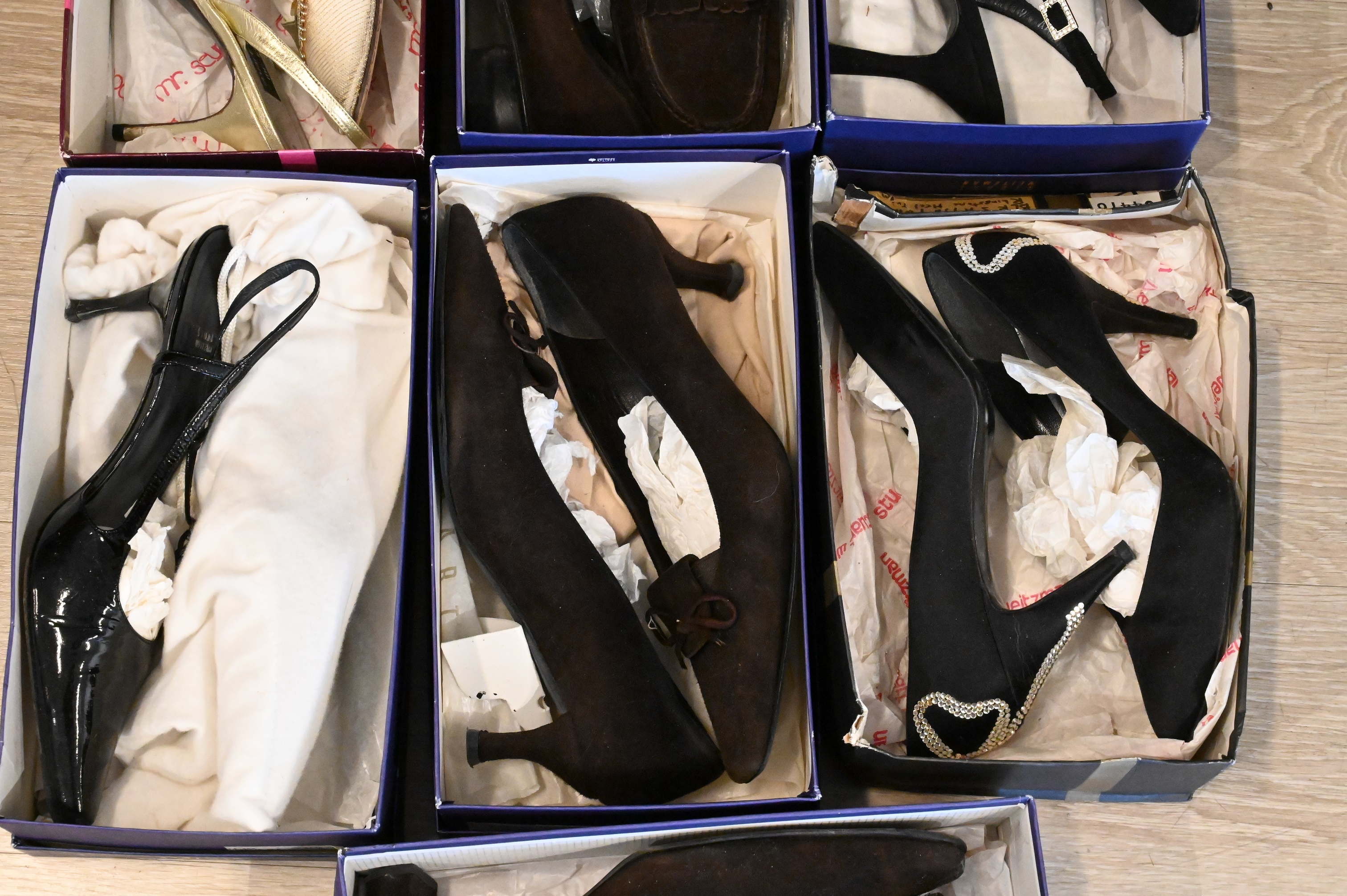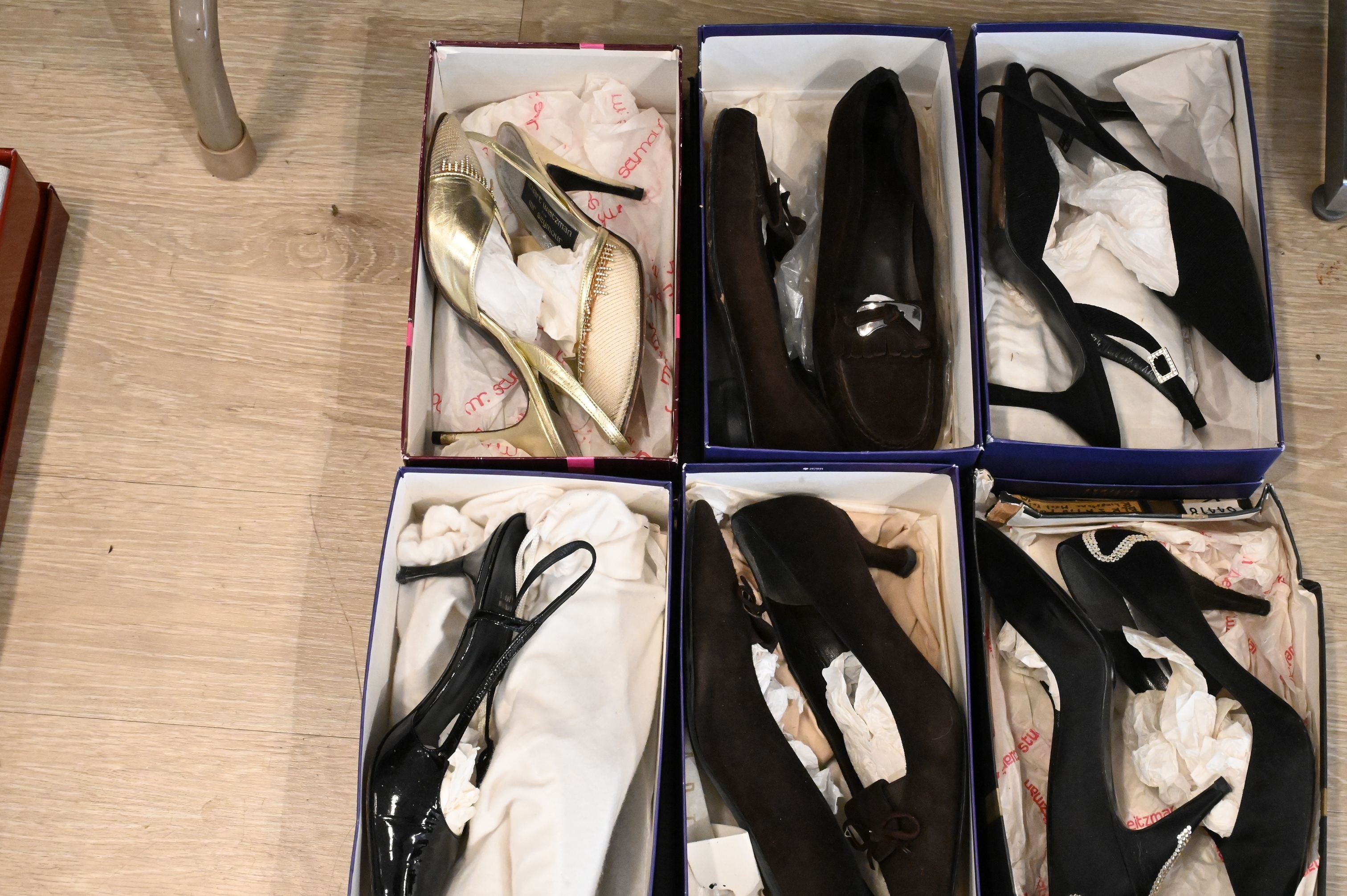 “Duke” in brown suede, “Glo Twilight” in black plisse and high heel, “Grazie” high heel in black patent etcetera…three pairs size 8 1/2, four pairs size 9