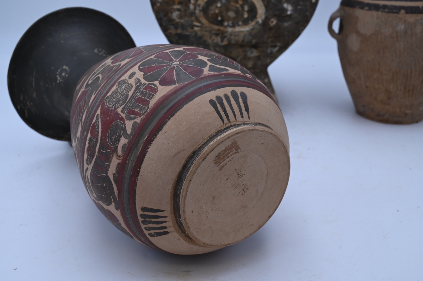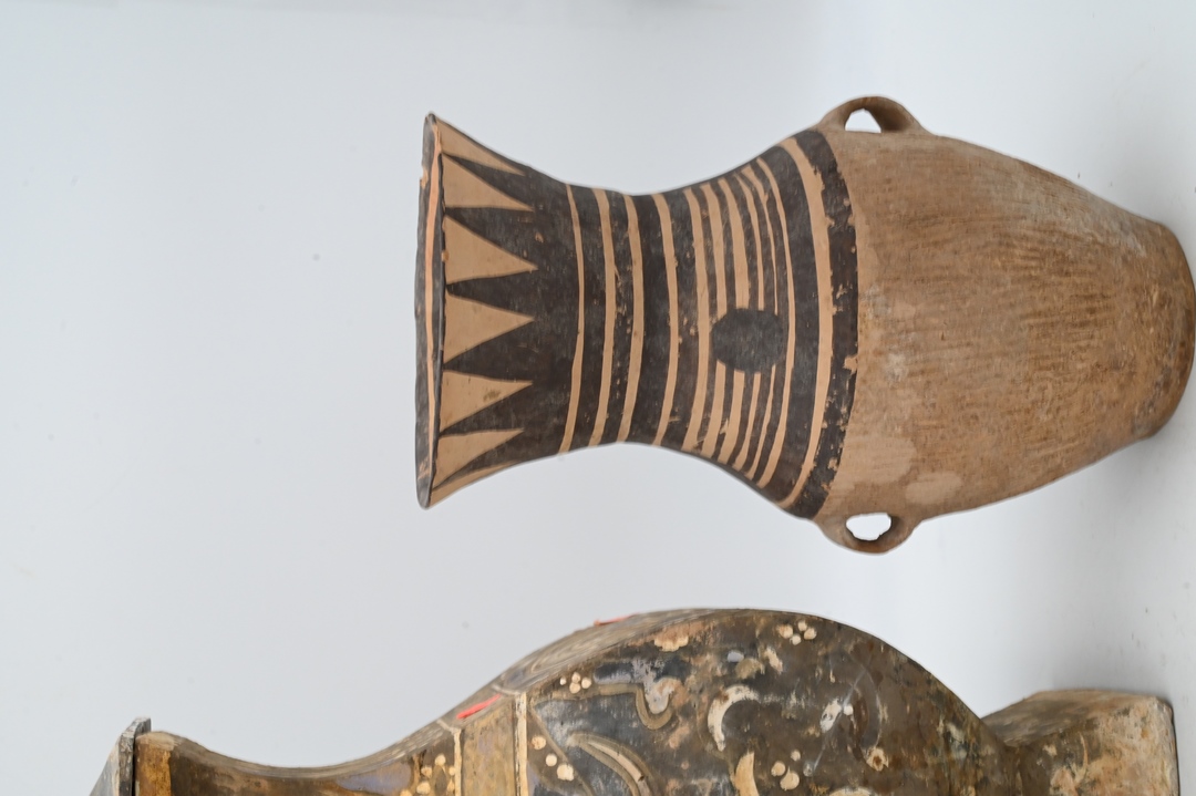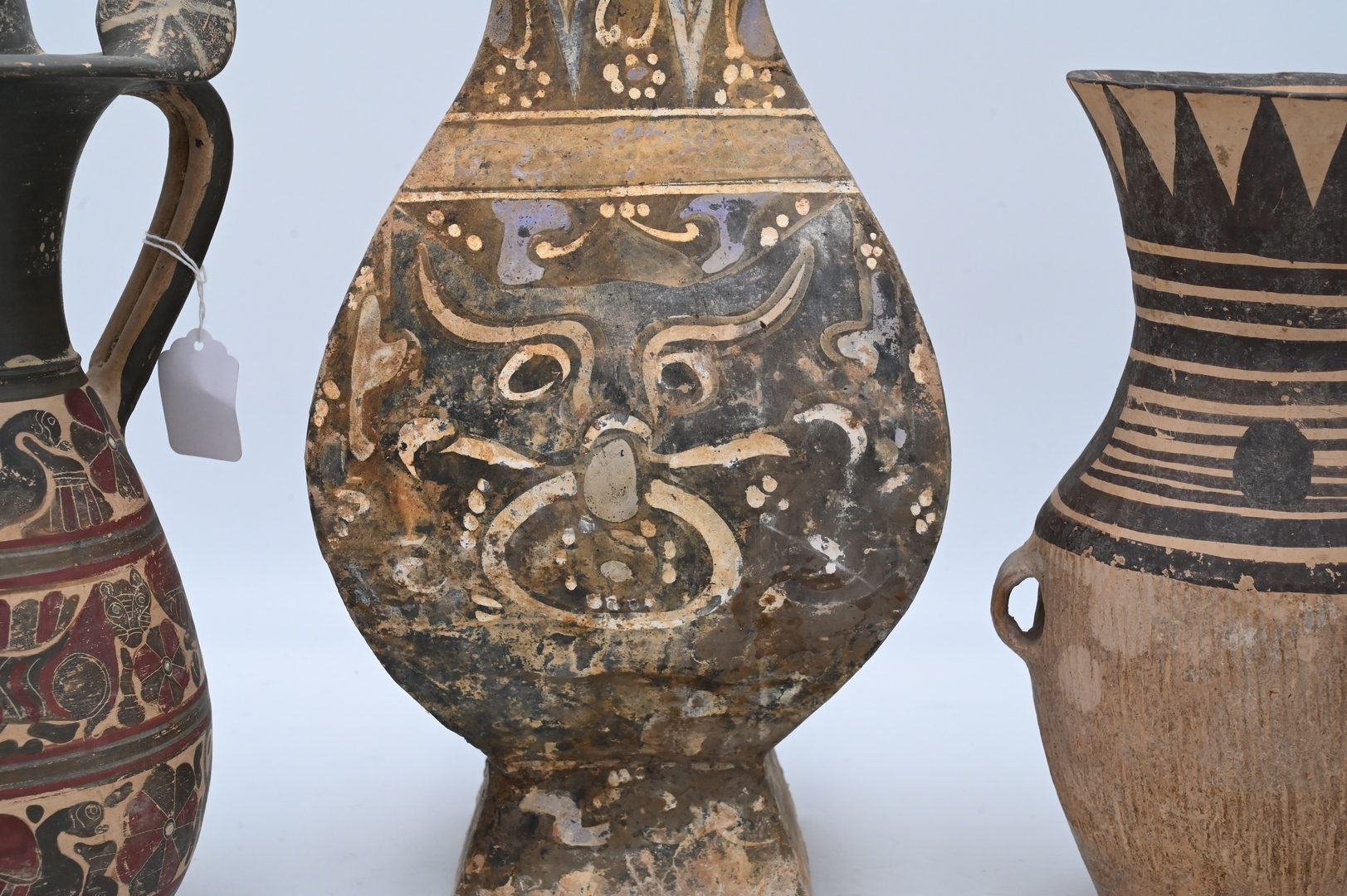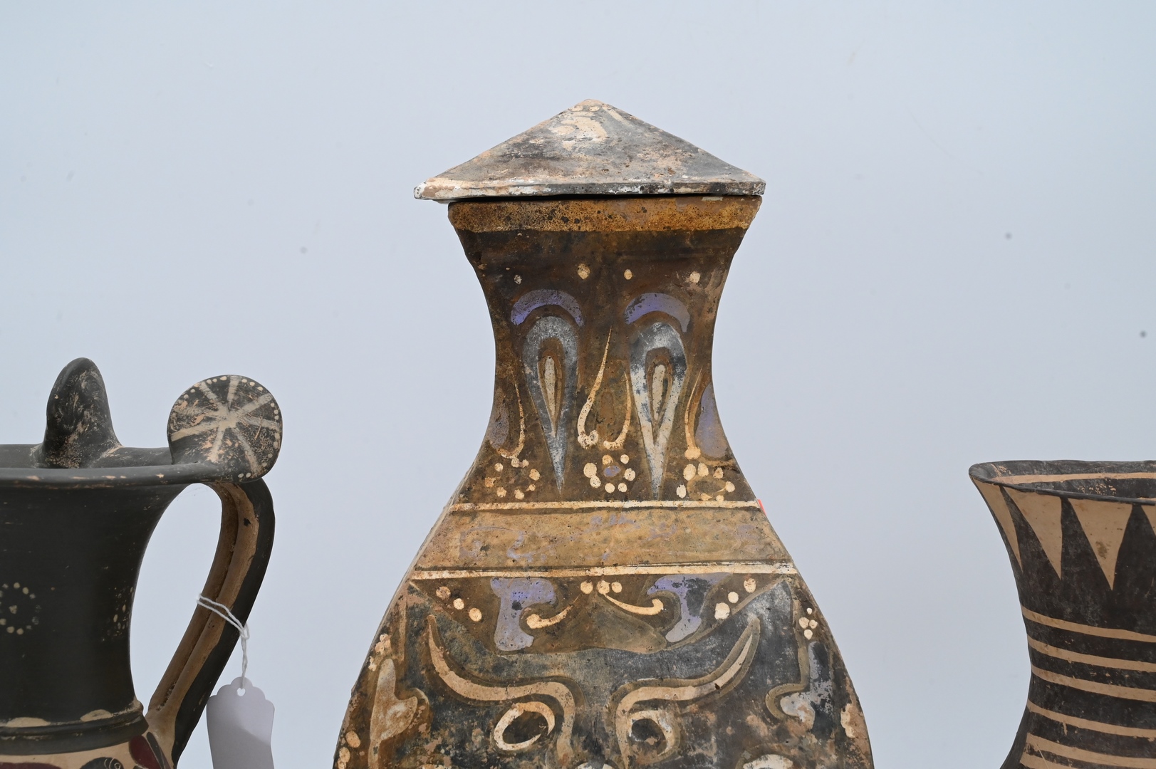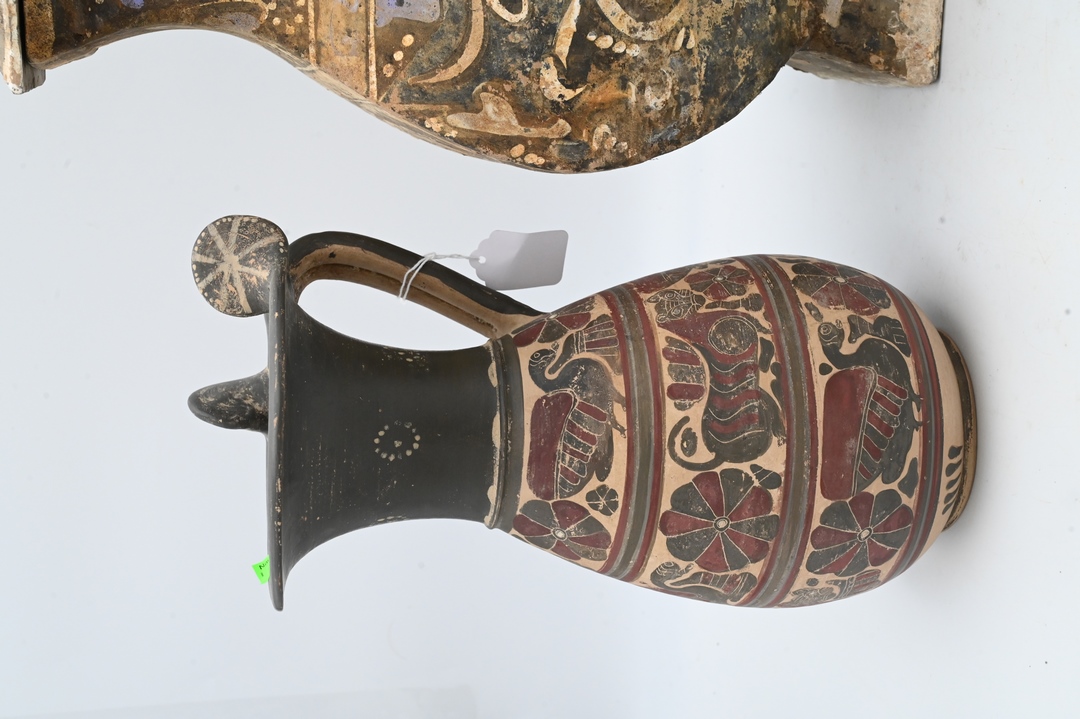 Group of Three Pottery Urns, to include one square with cover along with one pitcher having Egyptian painted scene; height 17 inches. Provenance: Estate of Peter Tillou, Litchfield, Connecticut.