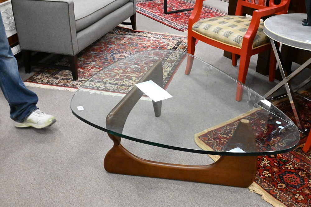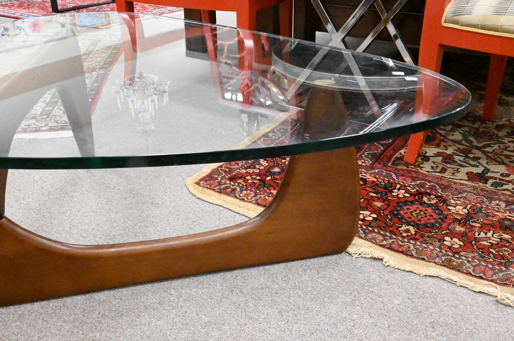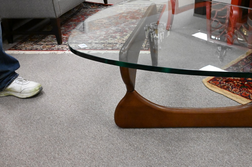 Lot 307: Isamu Noguchi Style Walnut Coffee Table, having 3/4 glass, height 15 1/2 inches, length 50 inches, depth 37 inches.