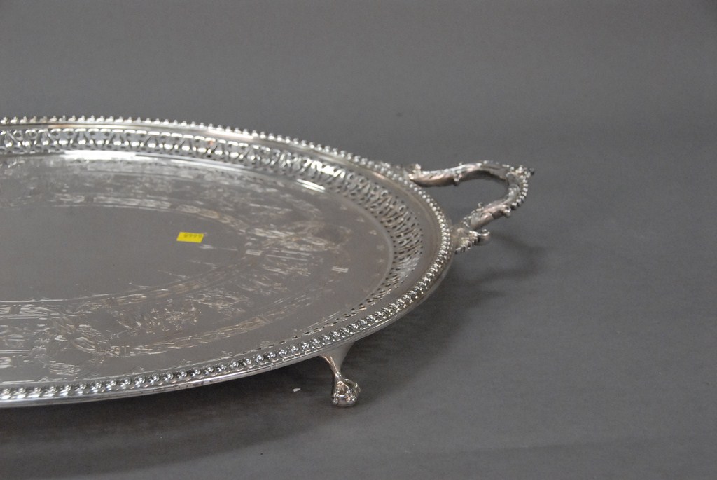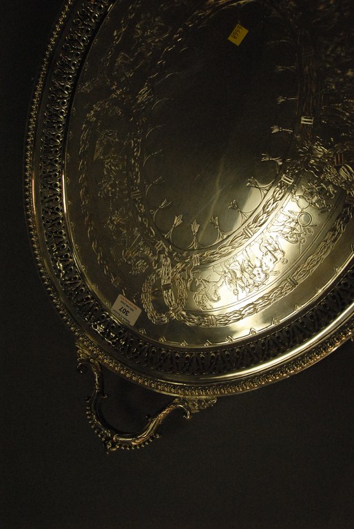 Lot 307: Large silverplate tray depicting roman soldiers and other figures with reticulated sides and large scroll handles. 32 1/2 x 20 3/4