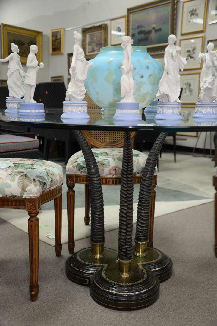 Lot 307: Maitland Smith Hollywood Regency Glass Top Circular Table, raised on three sculpted horns on a leather covered base, height 29 inches, diameter 48 inches.