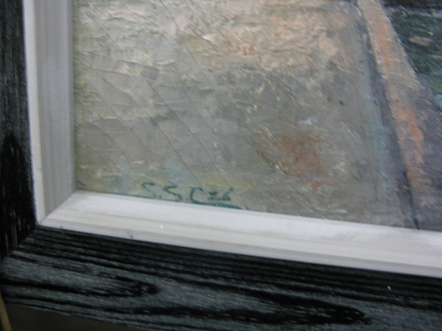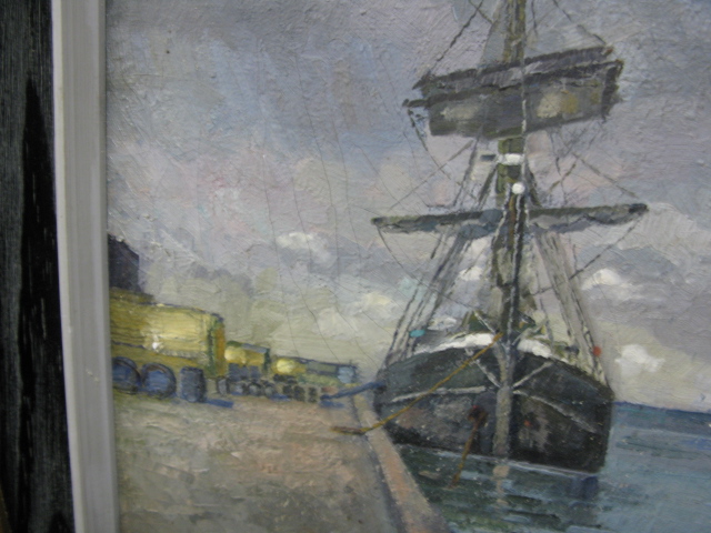 Oil on canvas of a Sailing Shop in port, signed lower left, S.S.C.