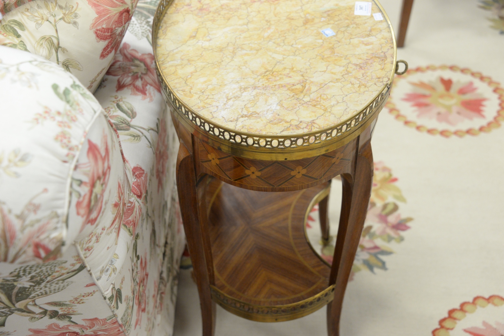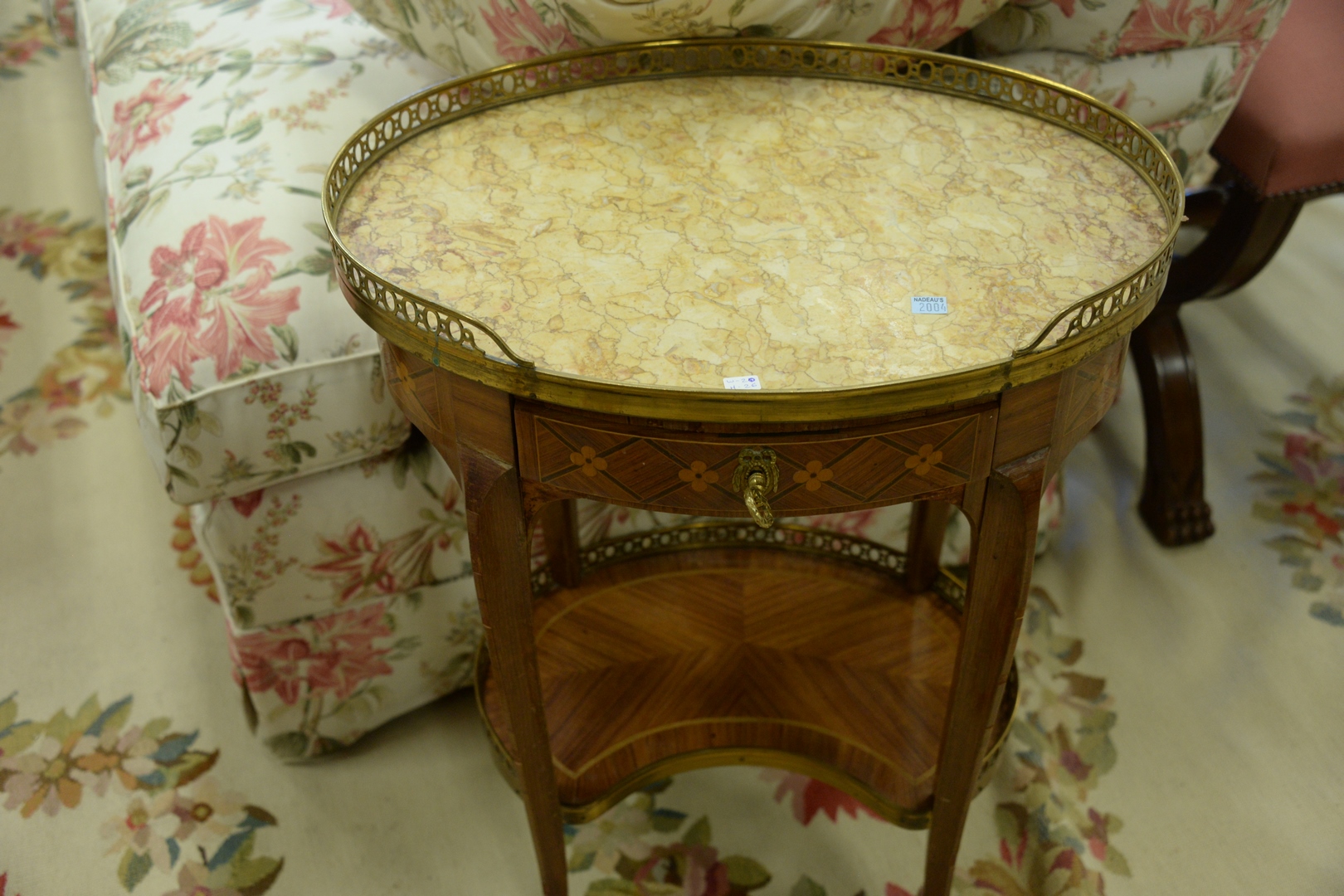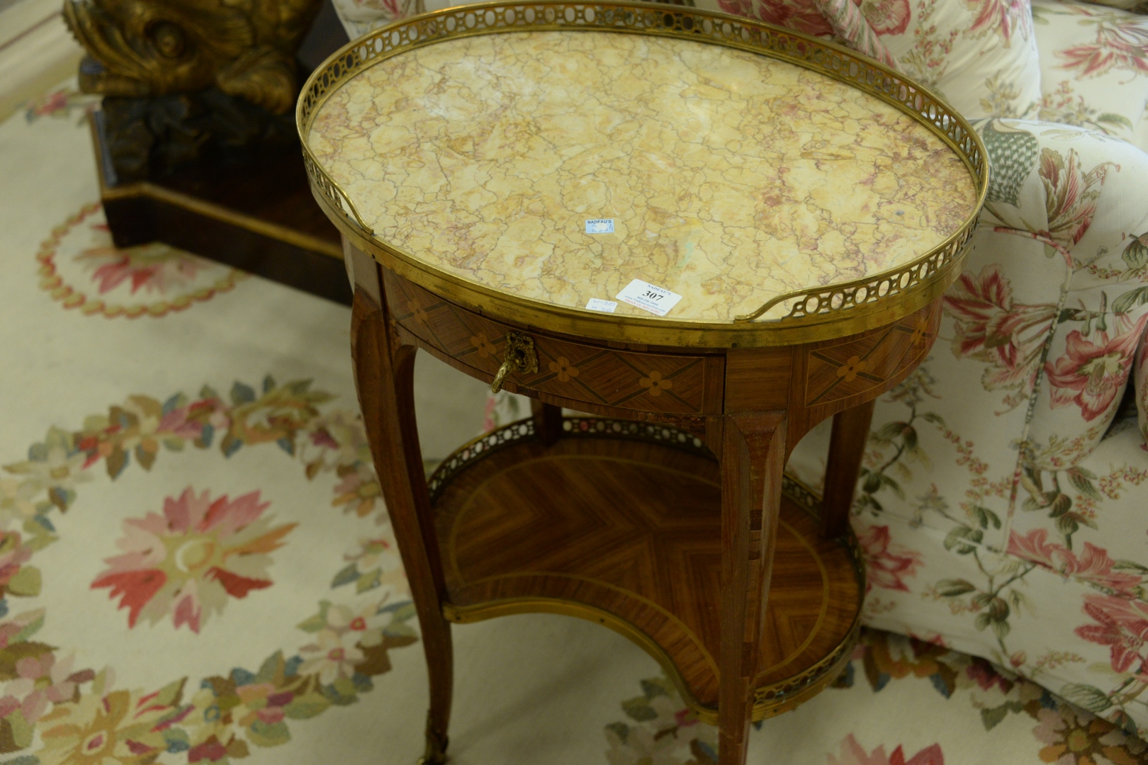 Lot 307: Pair of Louis XV Style Oval Stands, each with brass gallery, marble top over inlaid drawer, total height 27 inches, top 14 1/2 x 20…