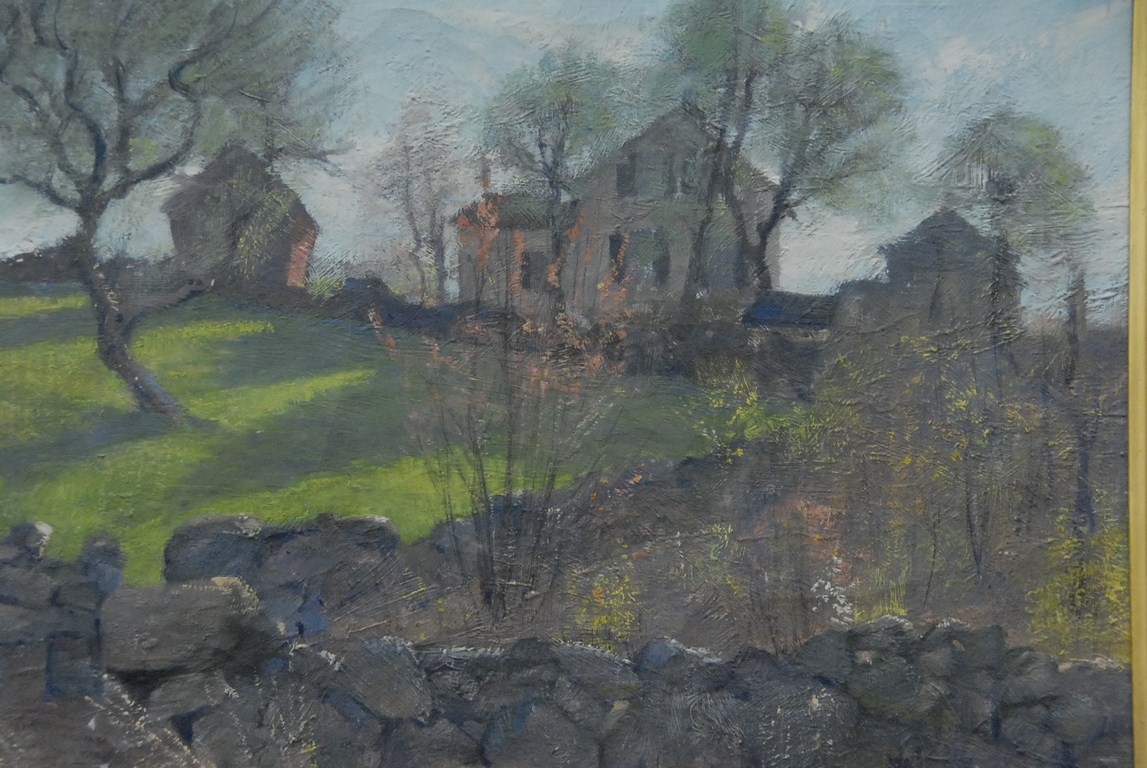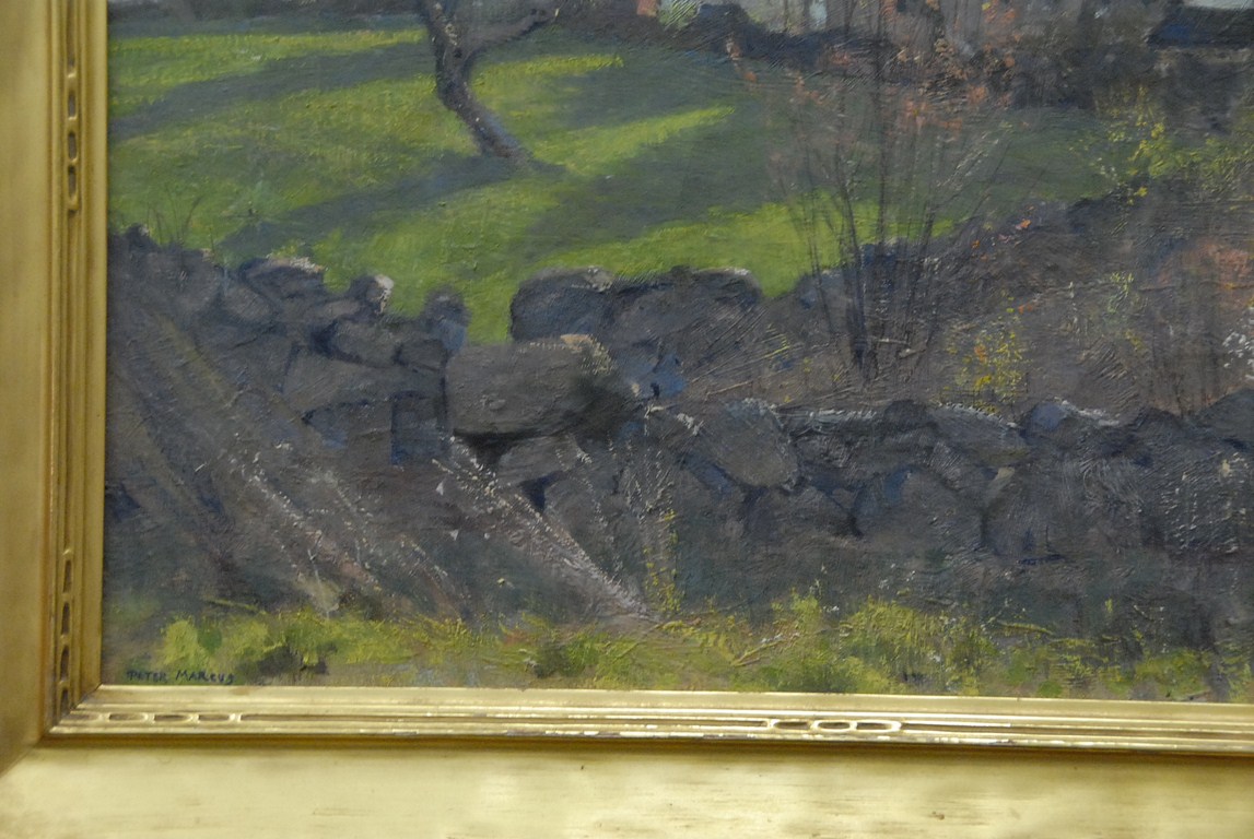 Peter Marcus 1889-1934 CONNECTICUT’S OLD FARM ROCK WALL oil on canvas landscape signed lower left Peter Marcus in great gilt frame 18 x 24 From the collection of Thomas and Alice Kugelman