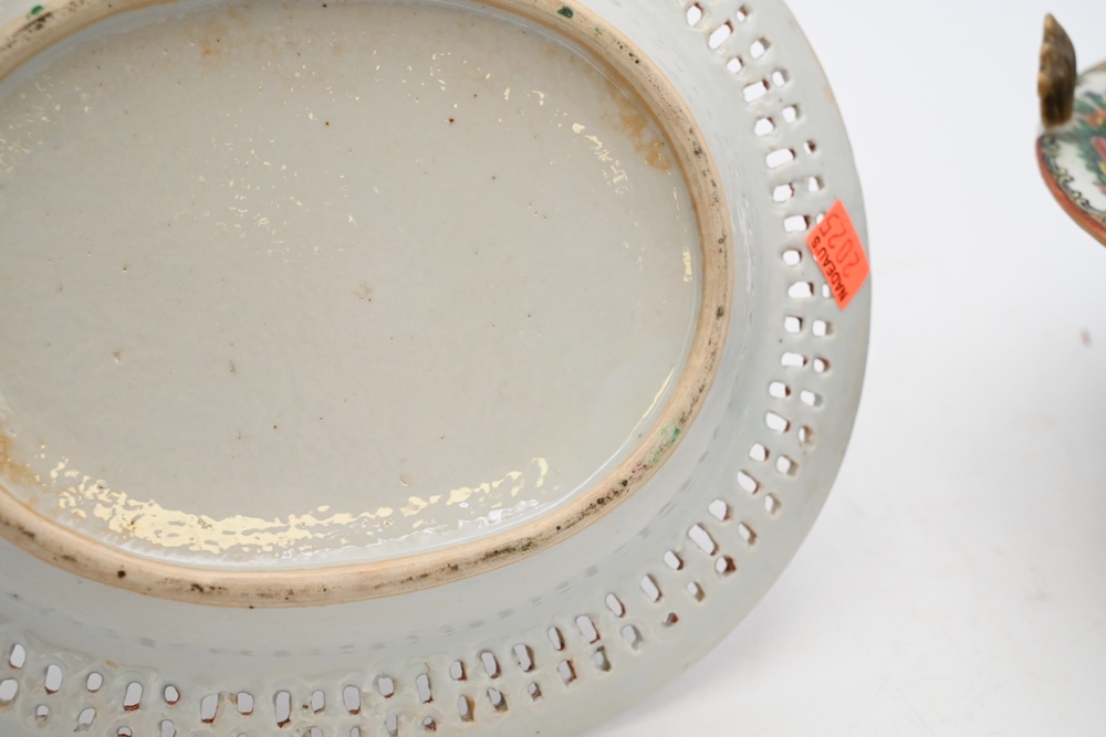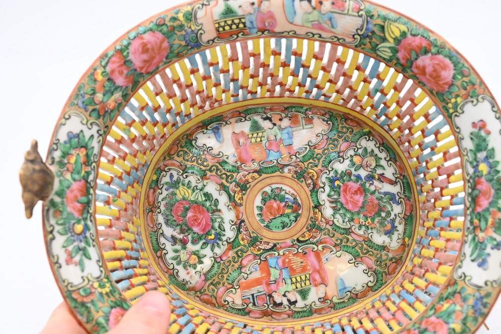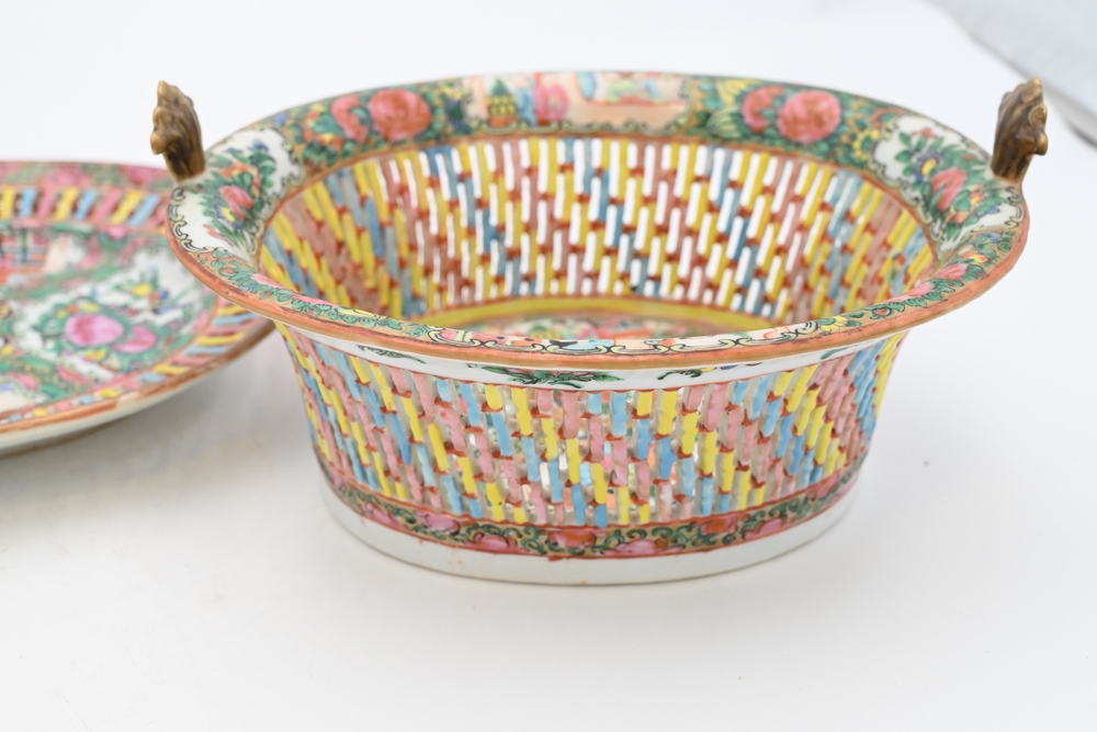 Lot 307: Rose Medallion Porcelain Fruit Basket with Matching Underplate having gilt foliate handles, basket, and under tray with reticulated rim and body height 4 1/2 inches Provenance: Waterfront Estate, Stamford, Connecticut.