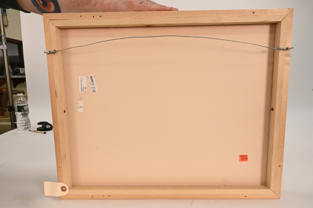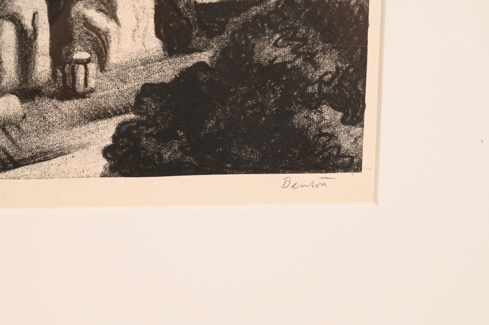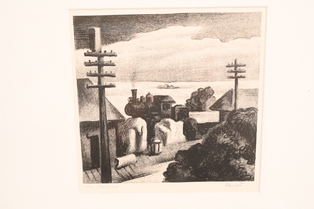 Thomas Hart Benton (1889 – 1975), The Station, 1929, lithograph, signed, titled and numbered 50/100 in pencil on Rives, published by Delphic Studios, New York, 5 7/8″ x 6 1/4″, sheet size 11 3/8″ x 15 7/8″. Provenance: Purchased from the artist in April 1966 by Creekmore Fath. Exhibited: Austin, Texas, The Archer M. Huntington Art Gallery, College of Fine Arts, The University of Texas at Austin, The Fath Collection: Selected prints from the United States and Mexico, 1915 – 1950, May 15 – July 6, 1986, no. 4. C The Creekmore and Adele Fath Charitable Foundation Collection. Sold at Doyle’s, New York, November 8, 2011, #100. Condition: Pale matstain, pinholes at sheet edges at center of top and bottom sheet edges, some ink in the margins and verso, some old glue residue with associated light abrasion in the top margin, a few unobtrusive specks of old glue residue in the left and right margins, some unobtrusive handling creases, a 5/16 inch tear at bottom sheet edge, otherwise in good condition, with full margins, framed.
