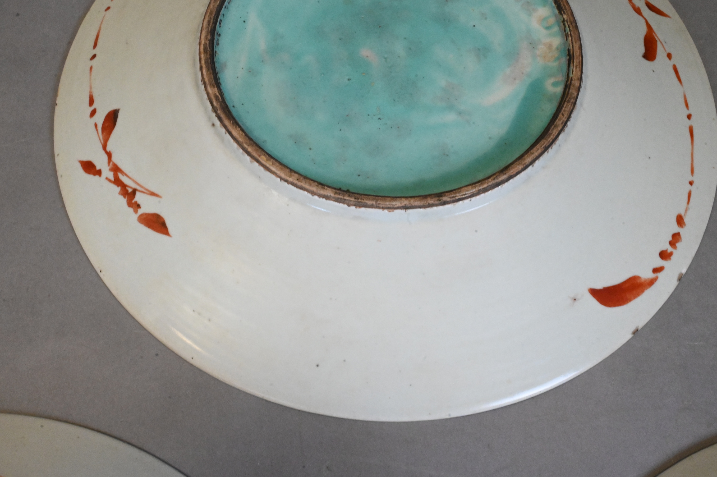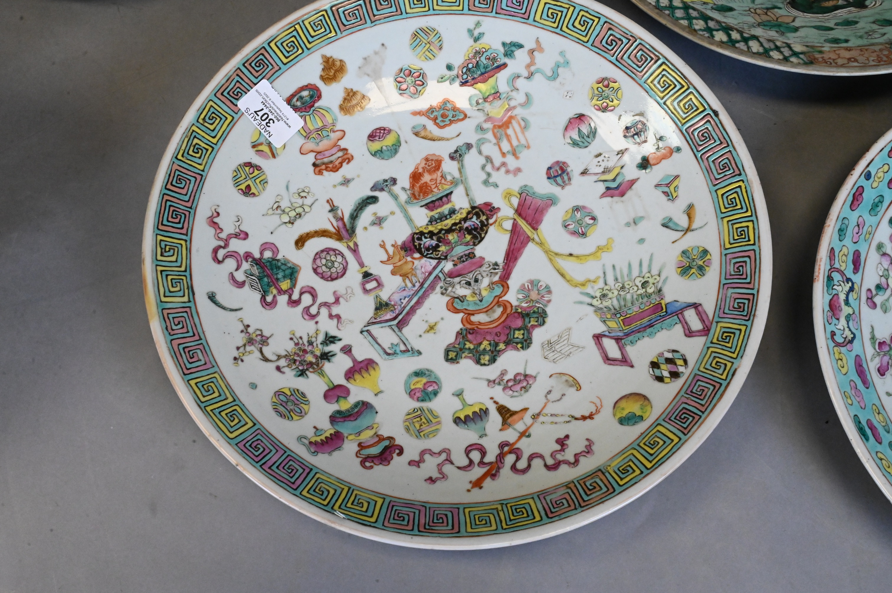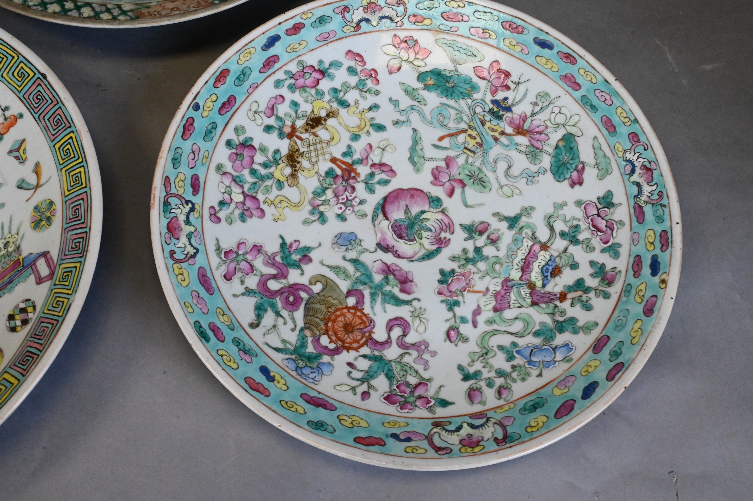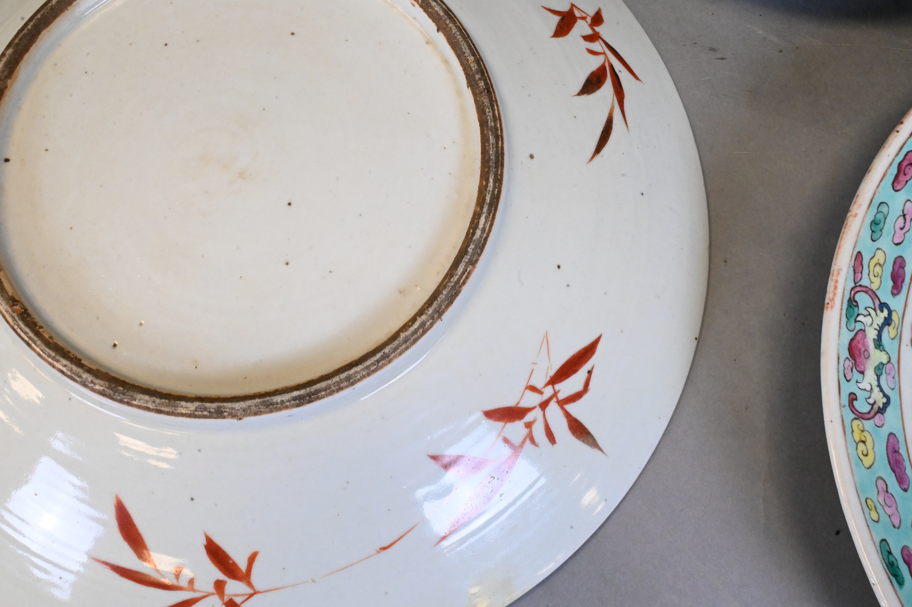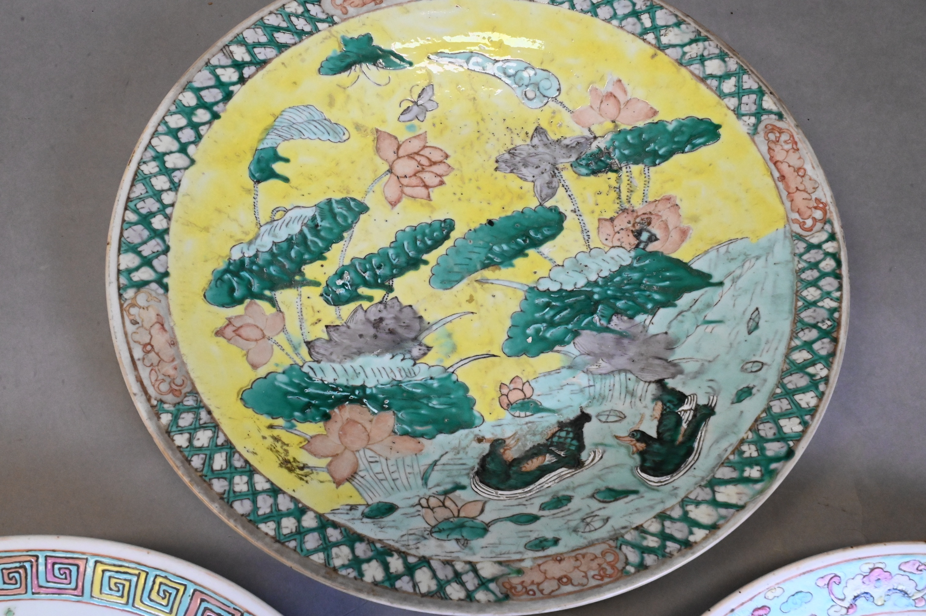 famille jaune yellow ground platter having pond landscape with lotus and ducks, antiquities plate featuring urns, censors and foo dogs, along with famille rose plate with seashells, fish and flower design