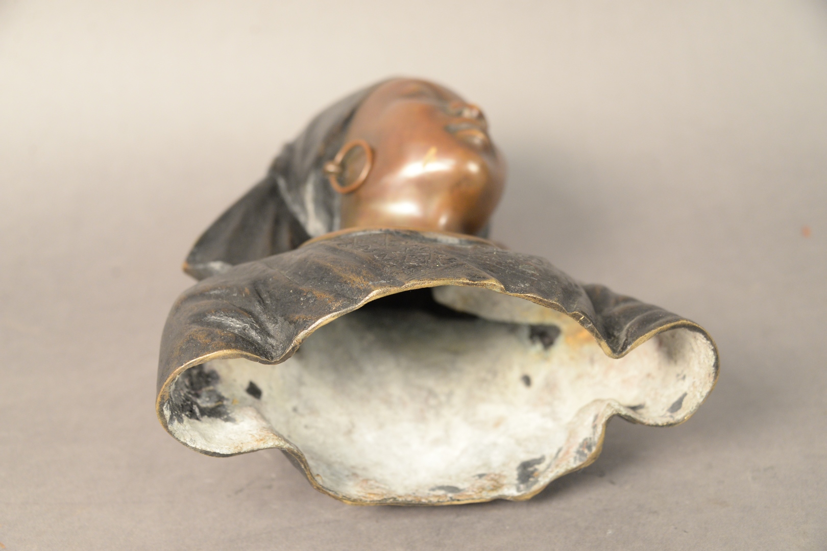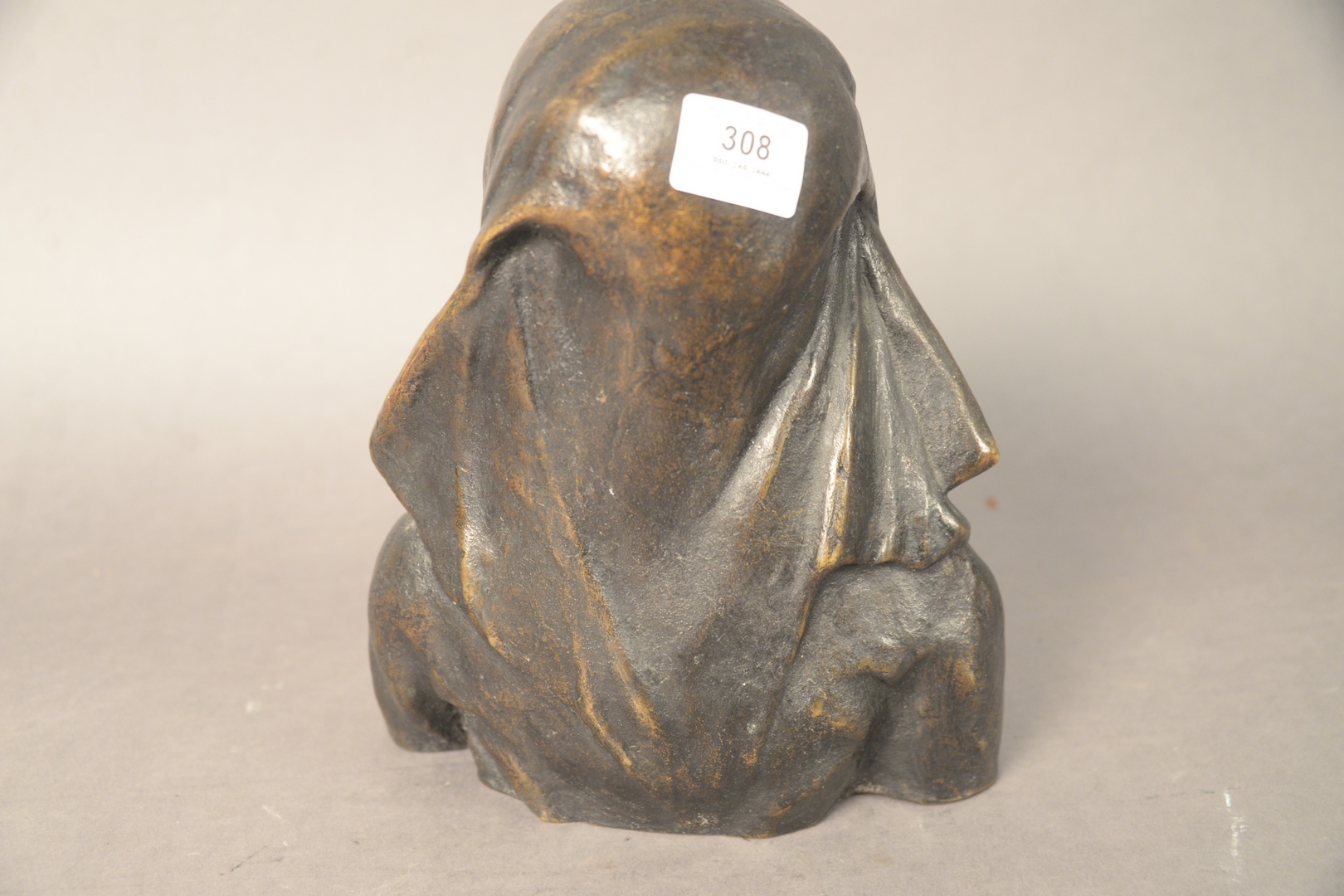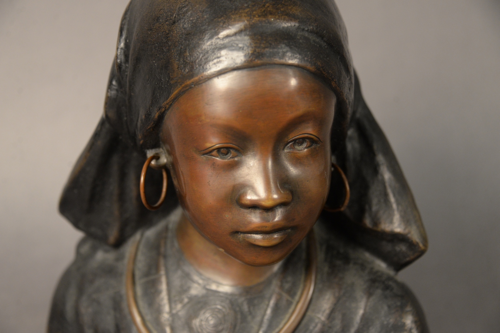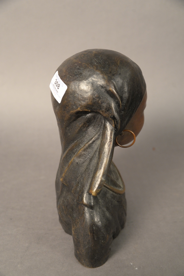 Lot 308: Bronze Bust of an African Woman, having incised details on her clothing, unmarked, height 10 1/2 inches, width 9 inches.