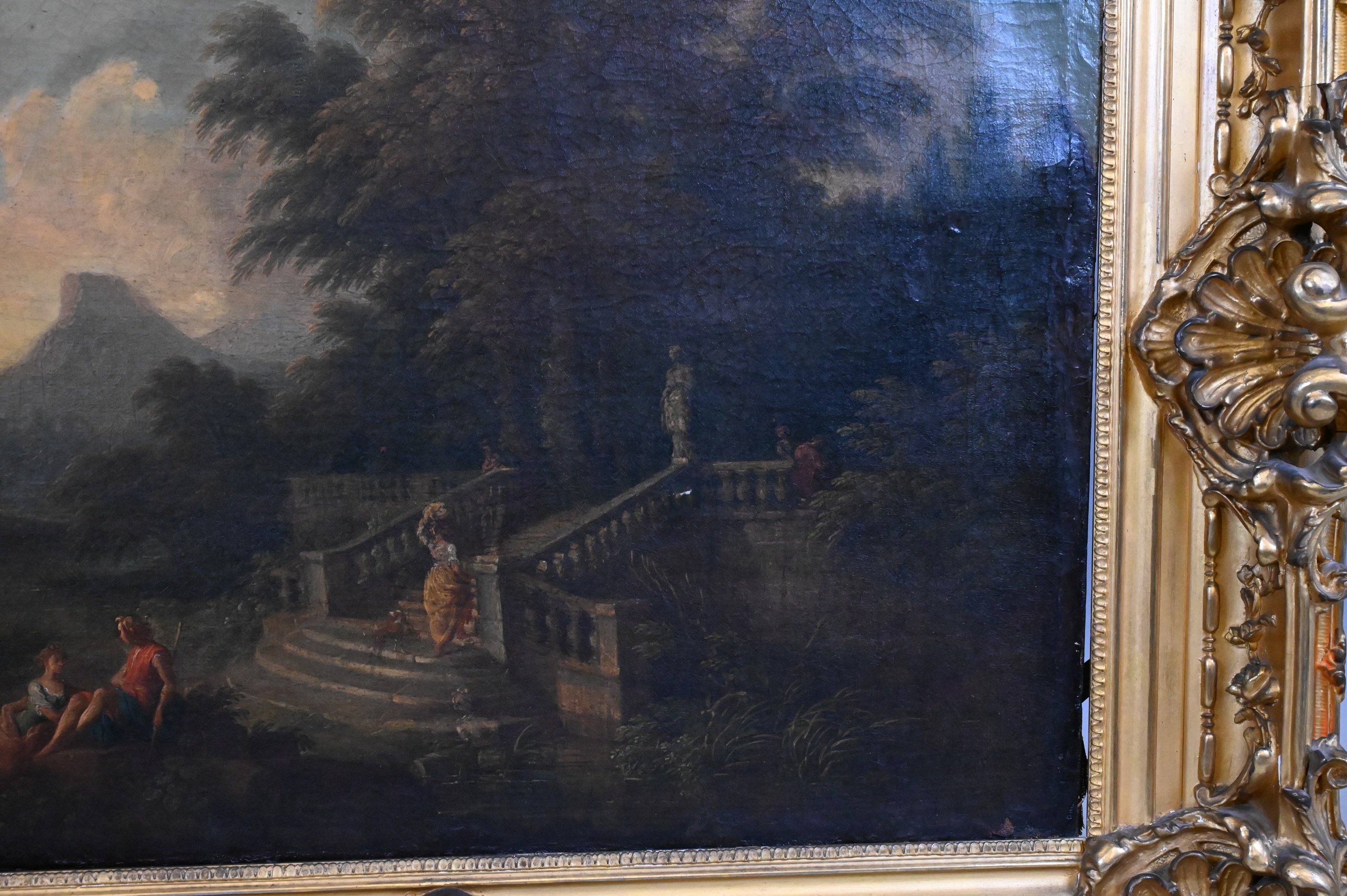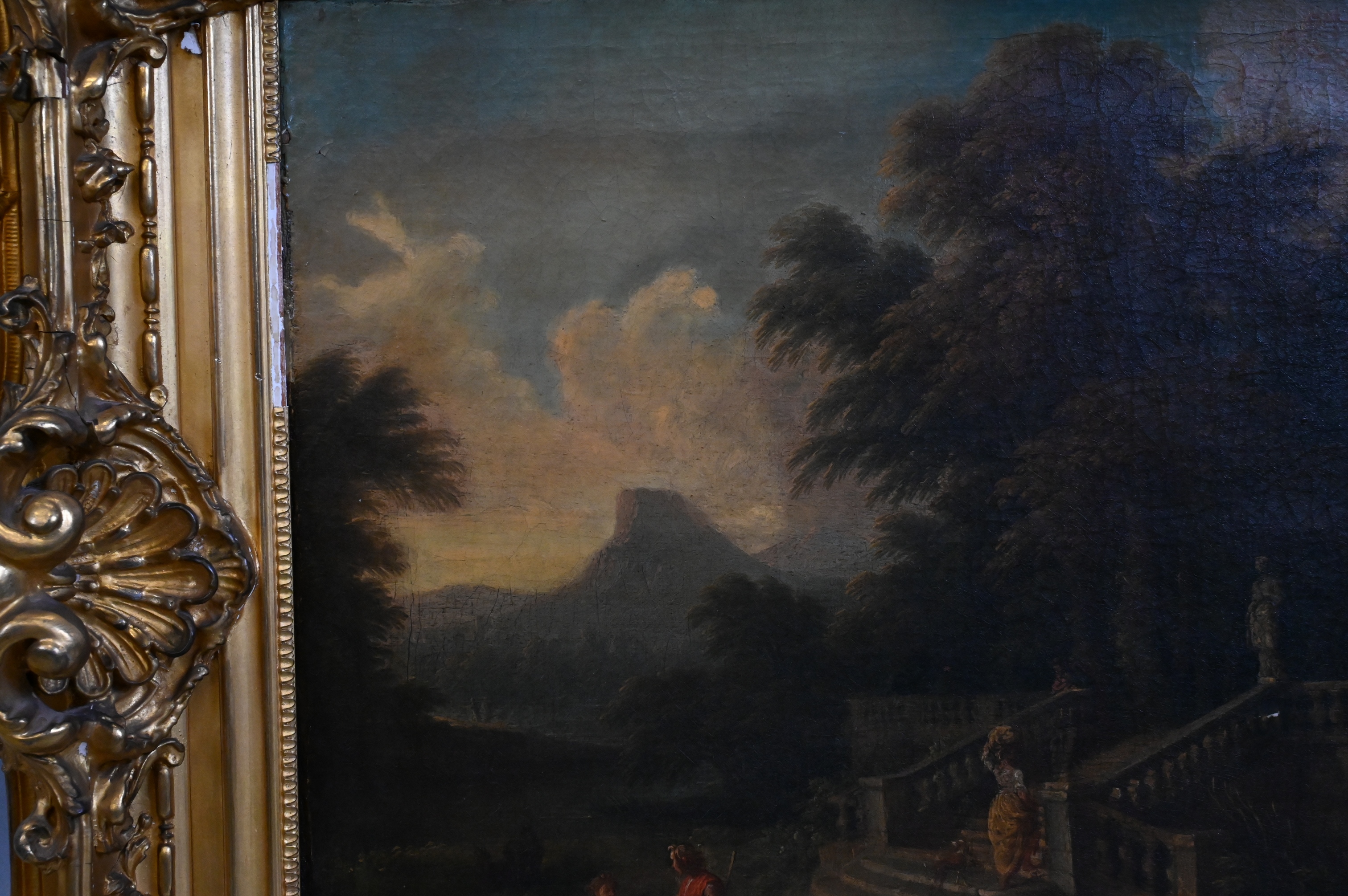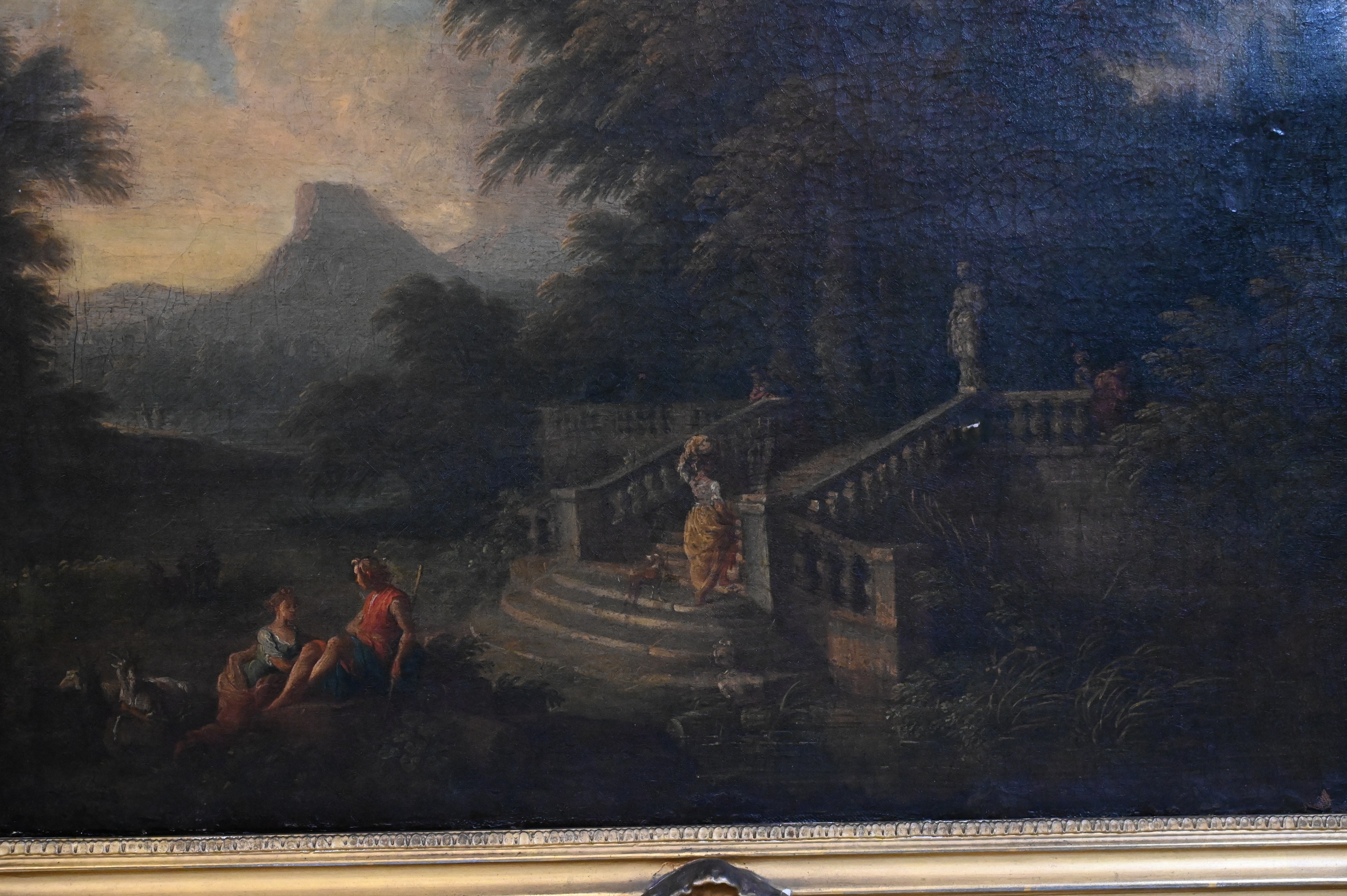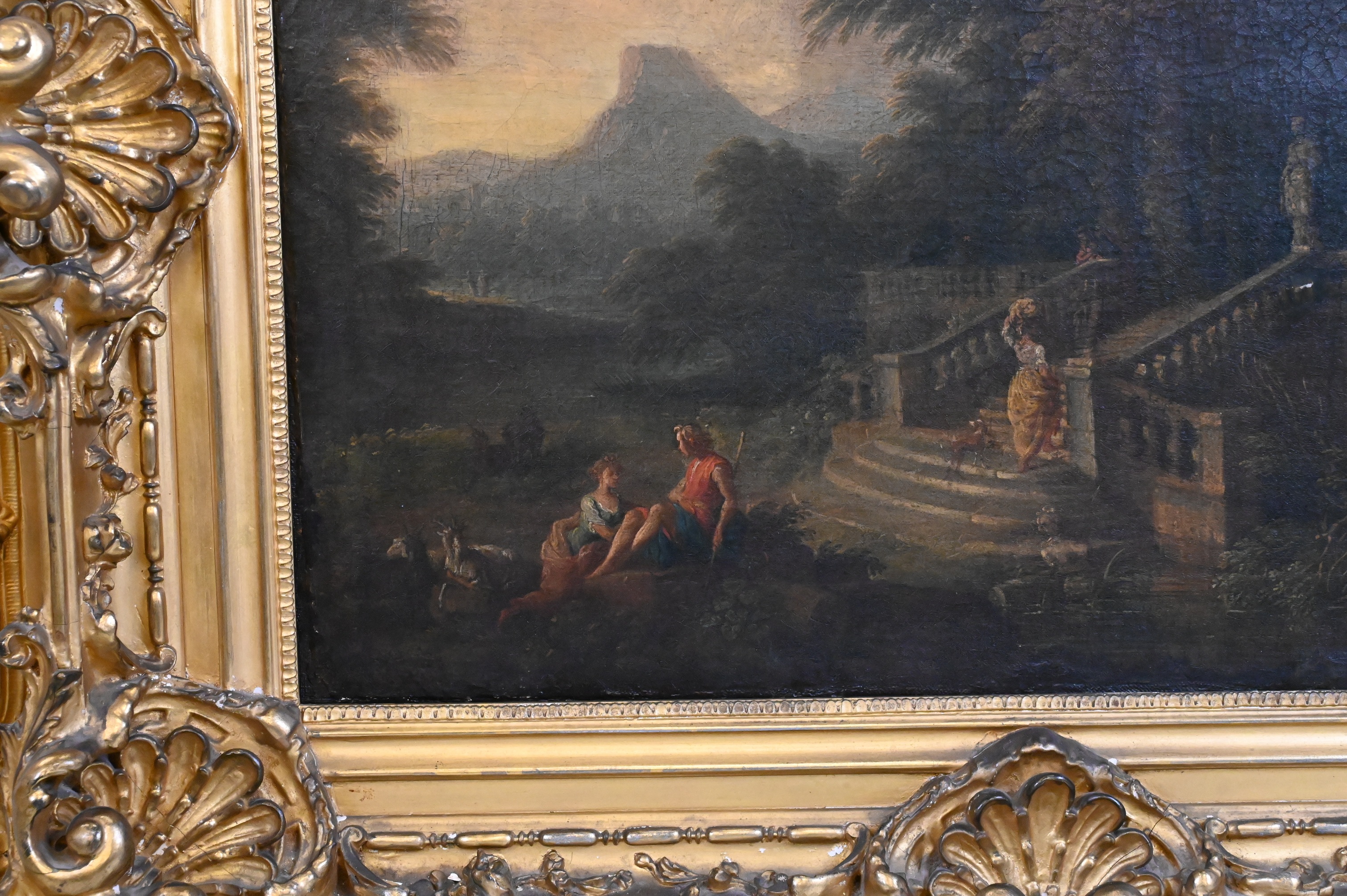 Pastoral scene with shepherds in on Italian landscape with ornate staircase