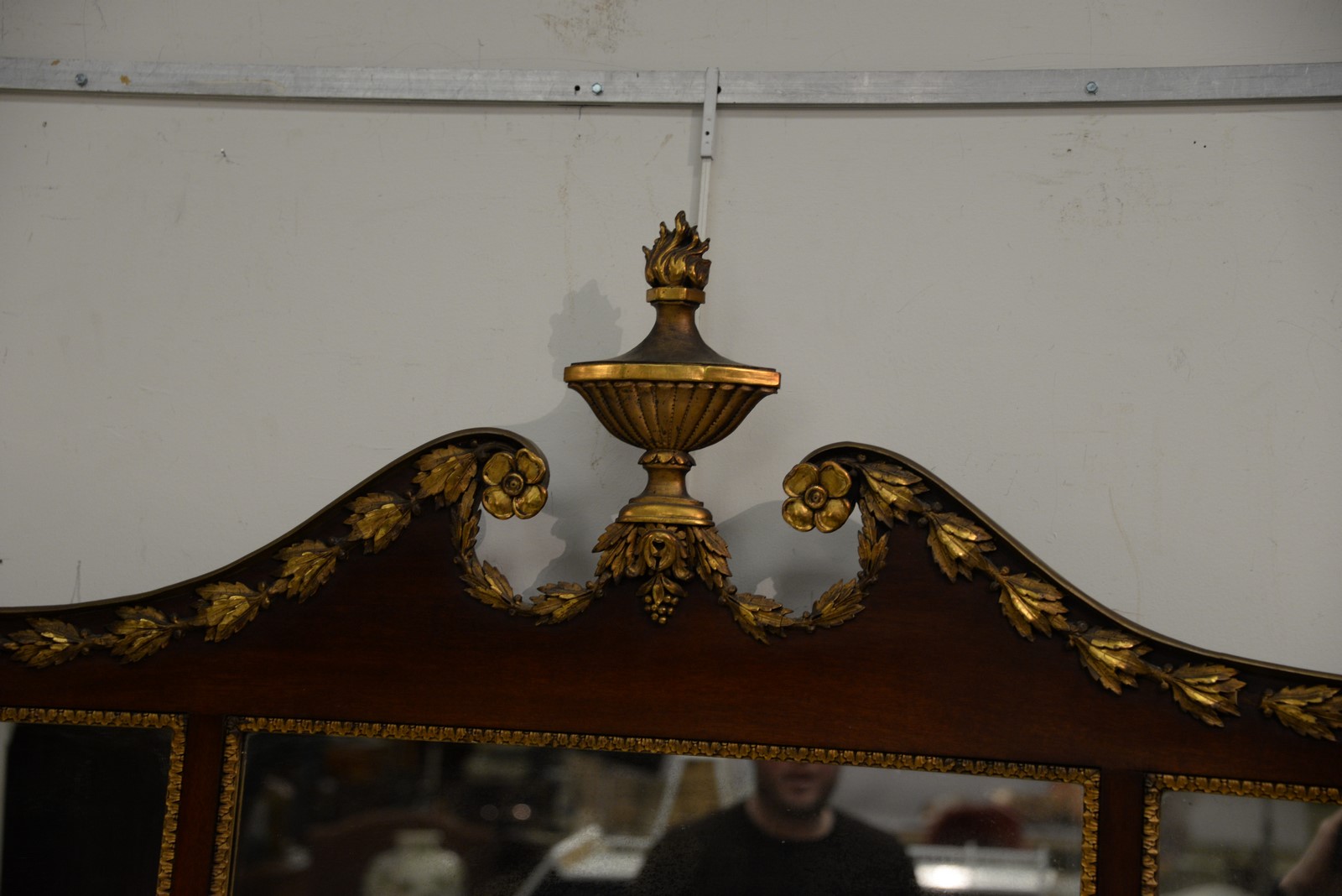 Custom mahogany three part over mantle mirror with urn finial, in excellent condition. 36 x 58