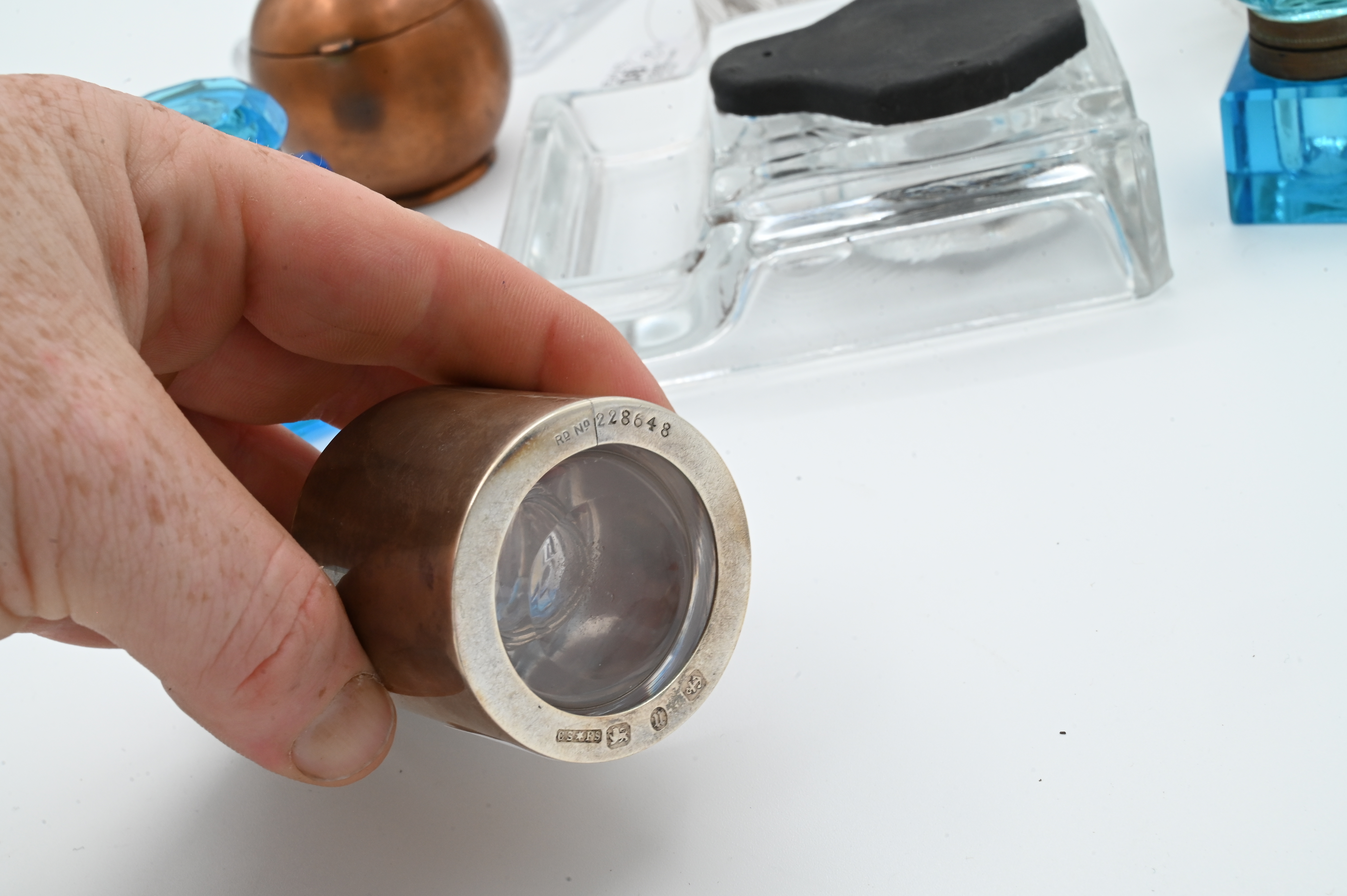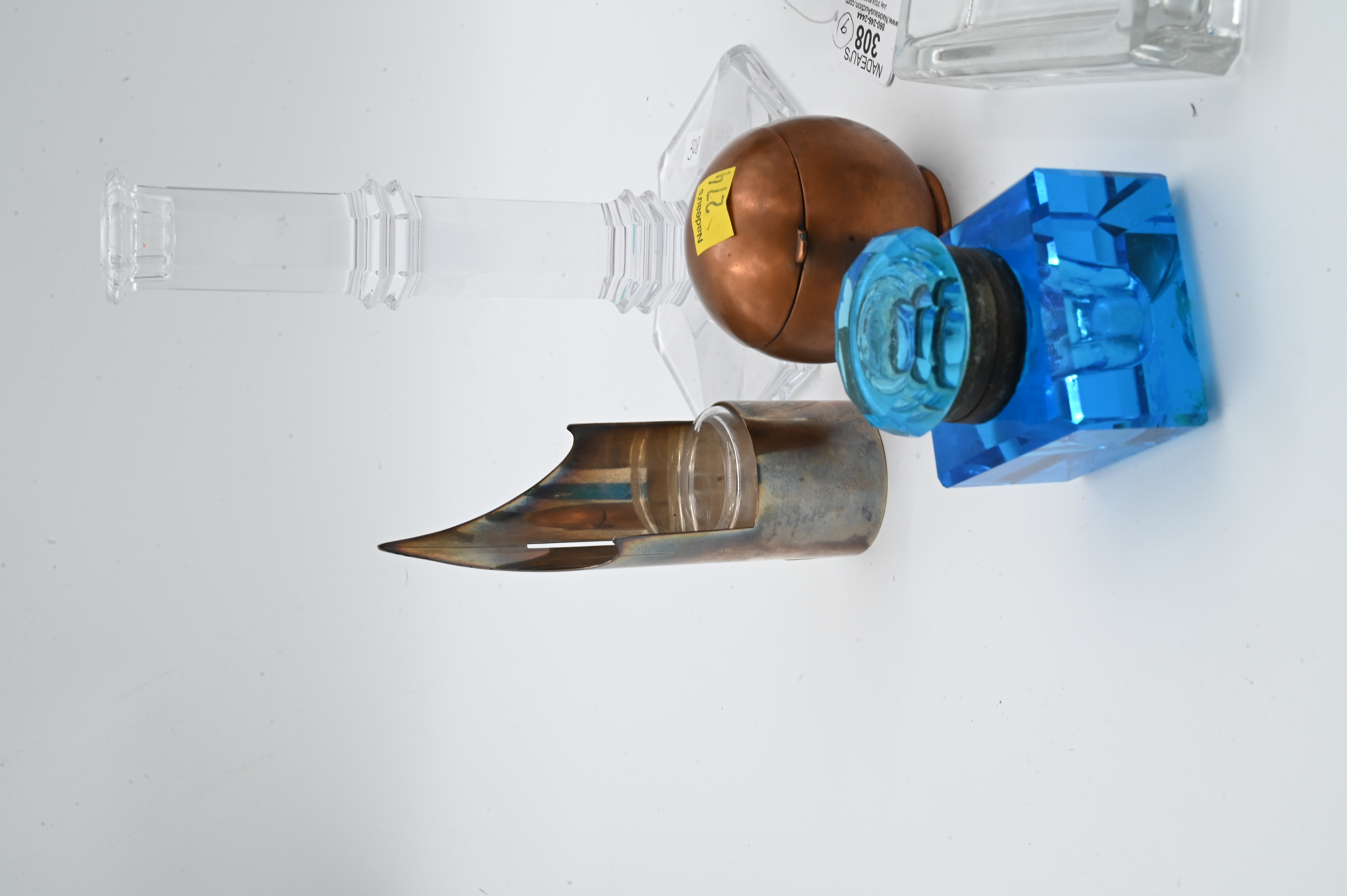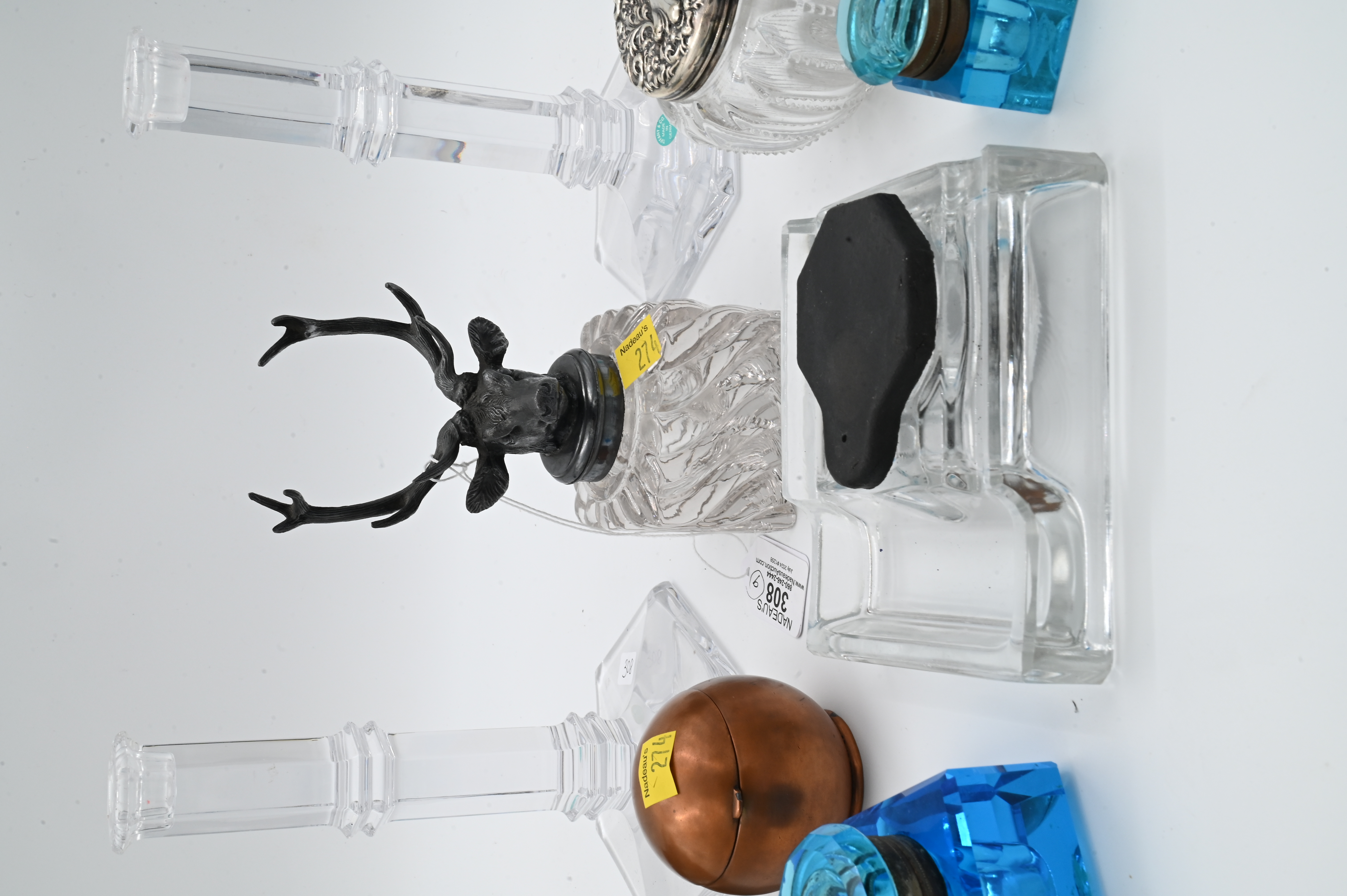 to include 925 sterling pen nib inkwell Saunders and Shepherd circa 1894, stag head inkwell, round copper hinged lid inkwell, two blue glass inkwells, one clear glass inkwell, and a pair of Tiffany and Co. glass candlesticks
