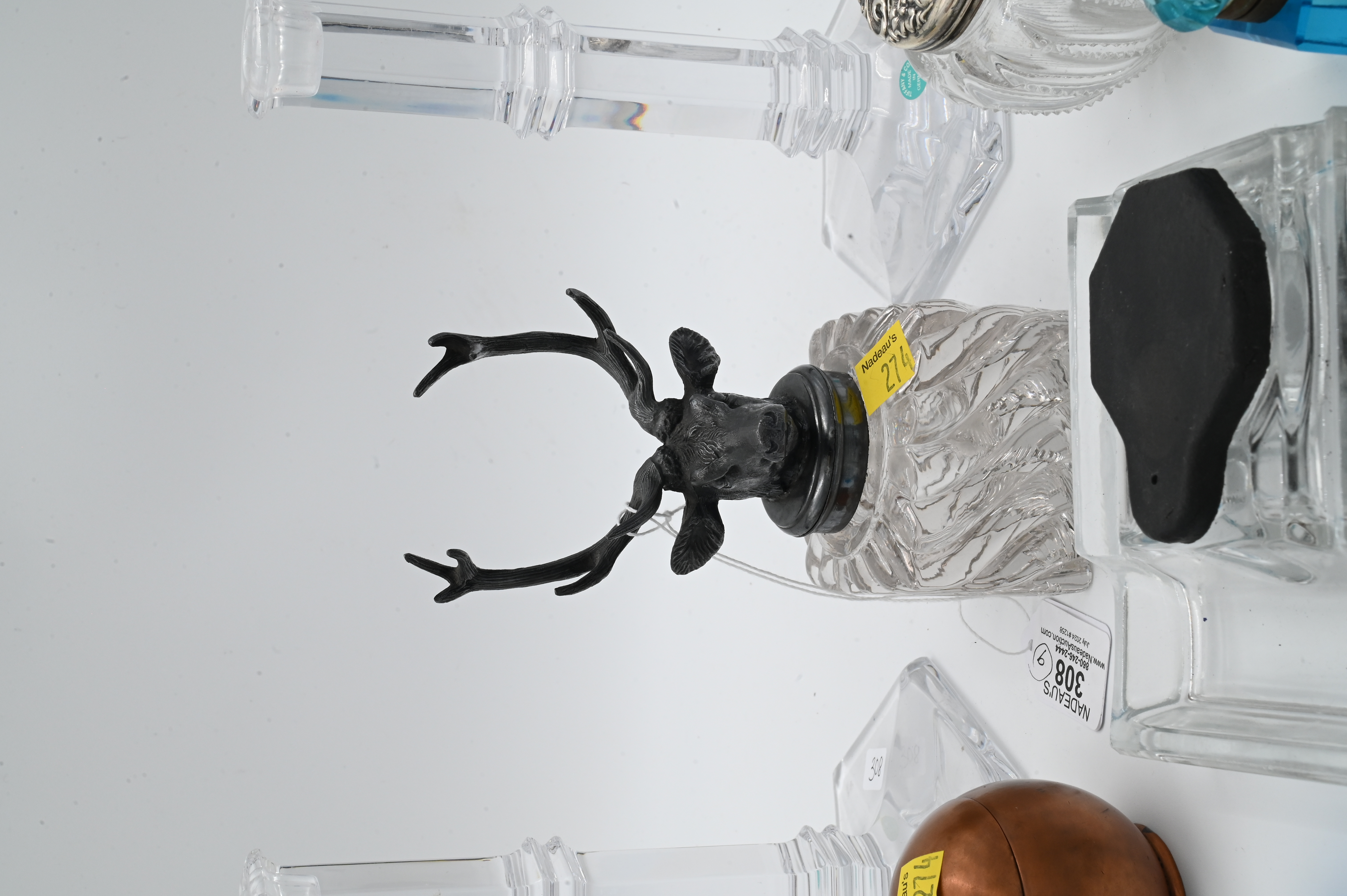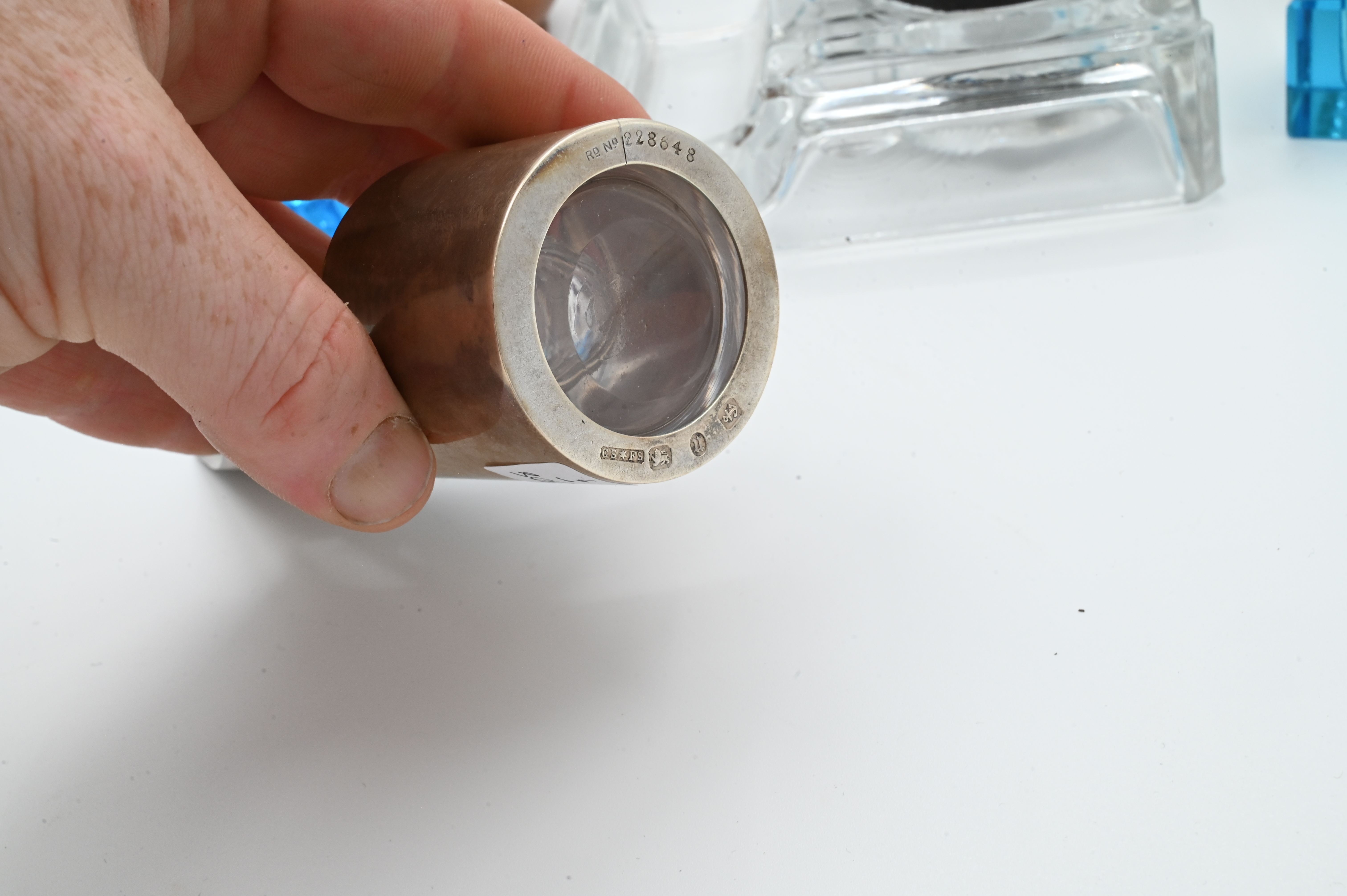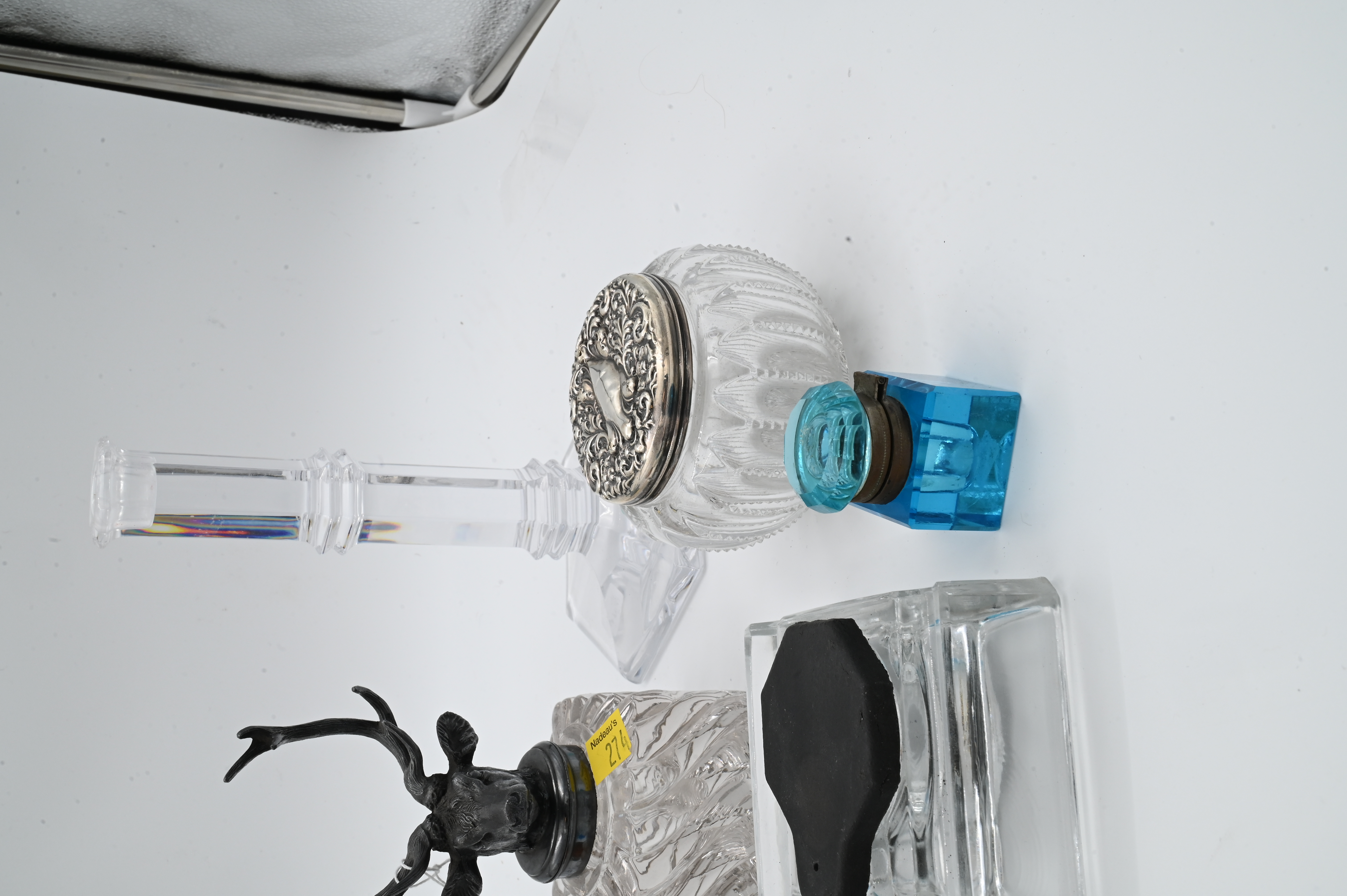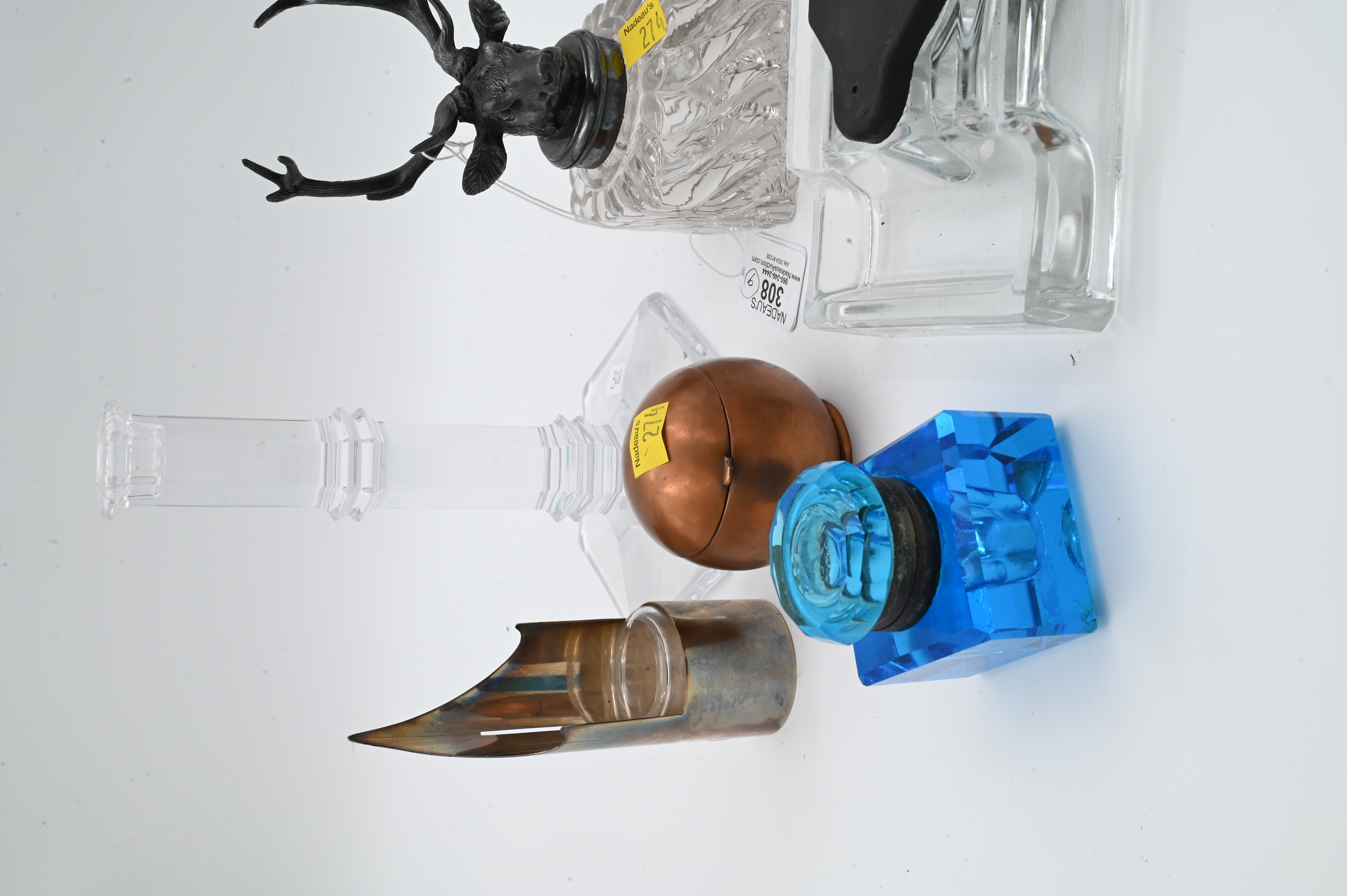 to include 925 sterling pen nib inkwell Saunders and Shepherd circa 1894, stag head inkwell, round copper hinged lid inkwell, two blue glass inkwells, one clear glass inkwell, and a pair of Tiffany and Co. glass candlesticks