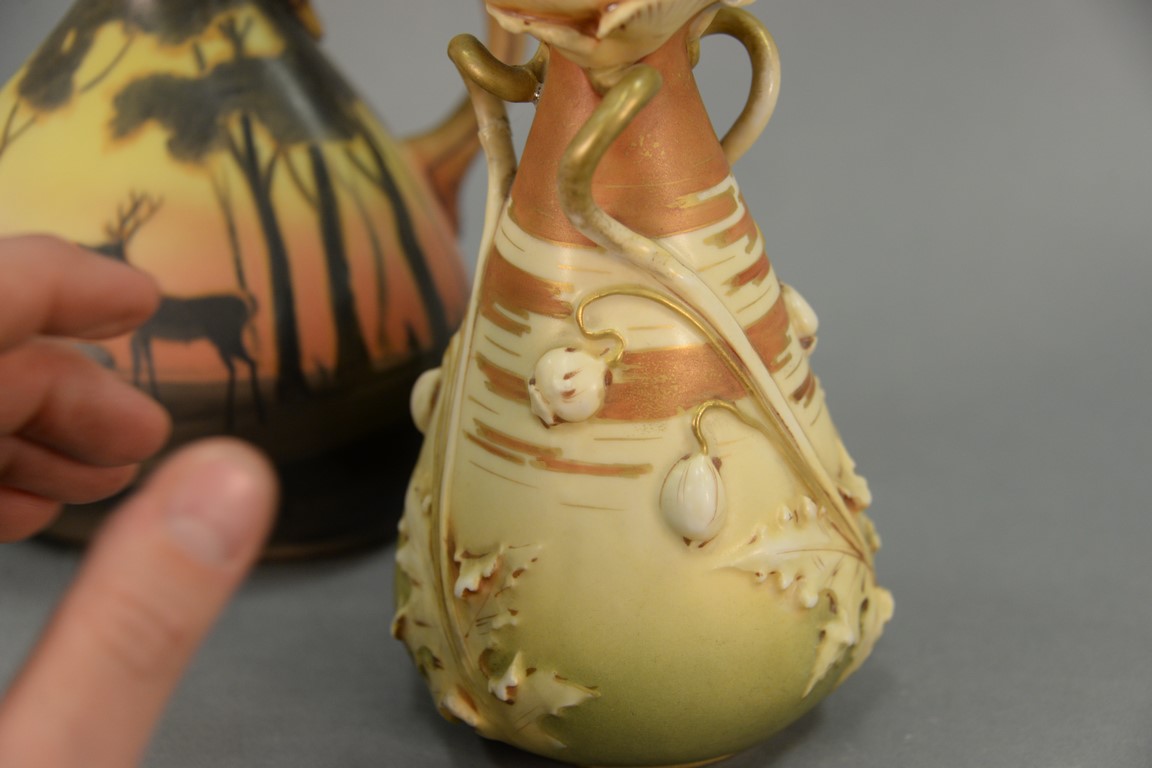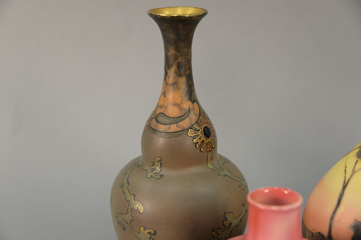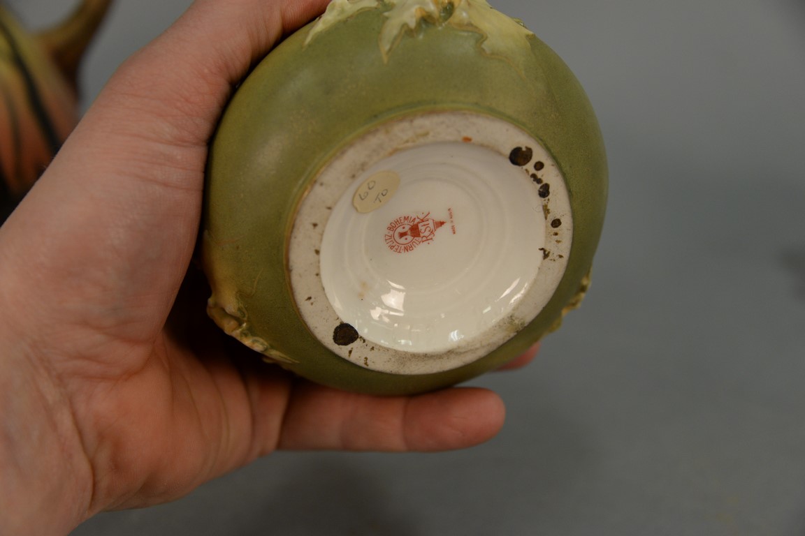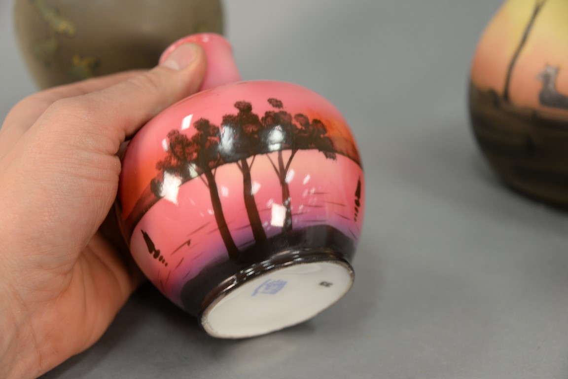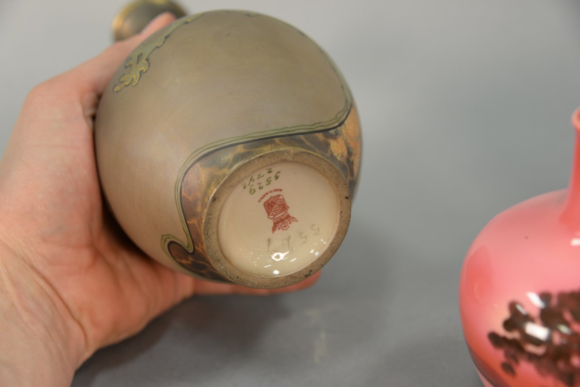 Four porcelain vases to include Turn Teplitz, Turn Vienna, Royal Bayreuth, and a hand painted Nippon urn with stopper. ht. 5in. to 8 1/2in.