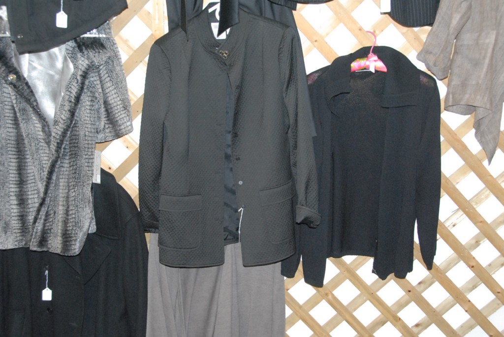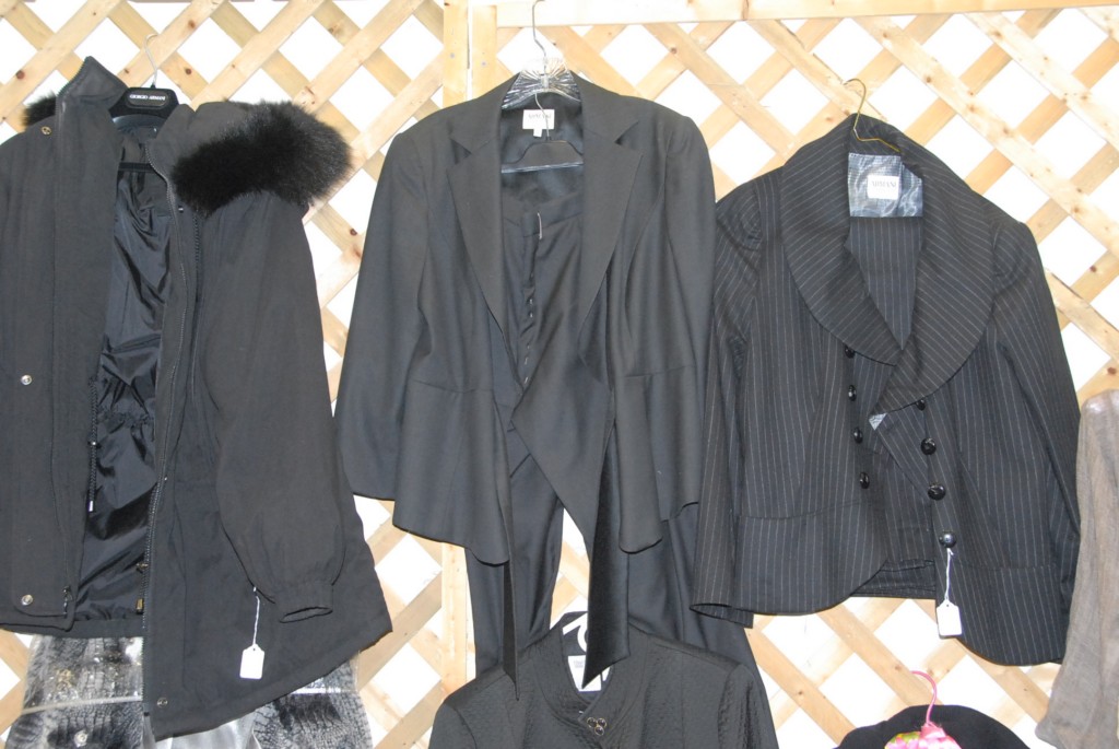 Group of jackets, suits Columbia Sport, Bromley Sport jacket, Worth jacket, two Armani suits, shawl, Jaeger fleece trench coat, Emil Rifenbery coat etc.