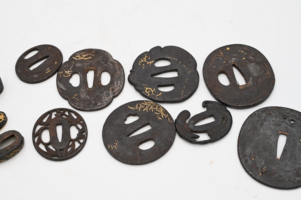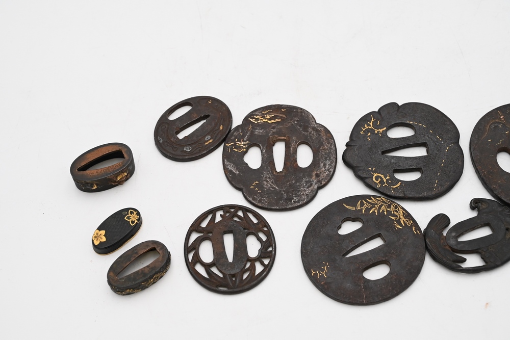 Lot 308: Group of Japanese Sword Fittings to include two Habaki with gilt gold figures, one signed; a Kashira with gold flowers; eight Tsuba; one figural with inlaid gold; three having mountainous scene and gold inlays; one with a bird, etc. some 16th century, some 17th century or later largest diameter 3 1/2 inches