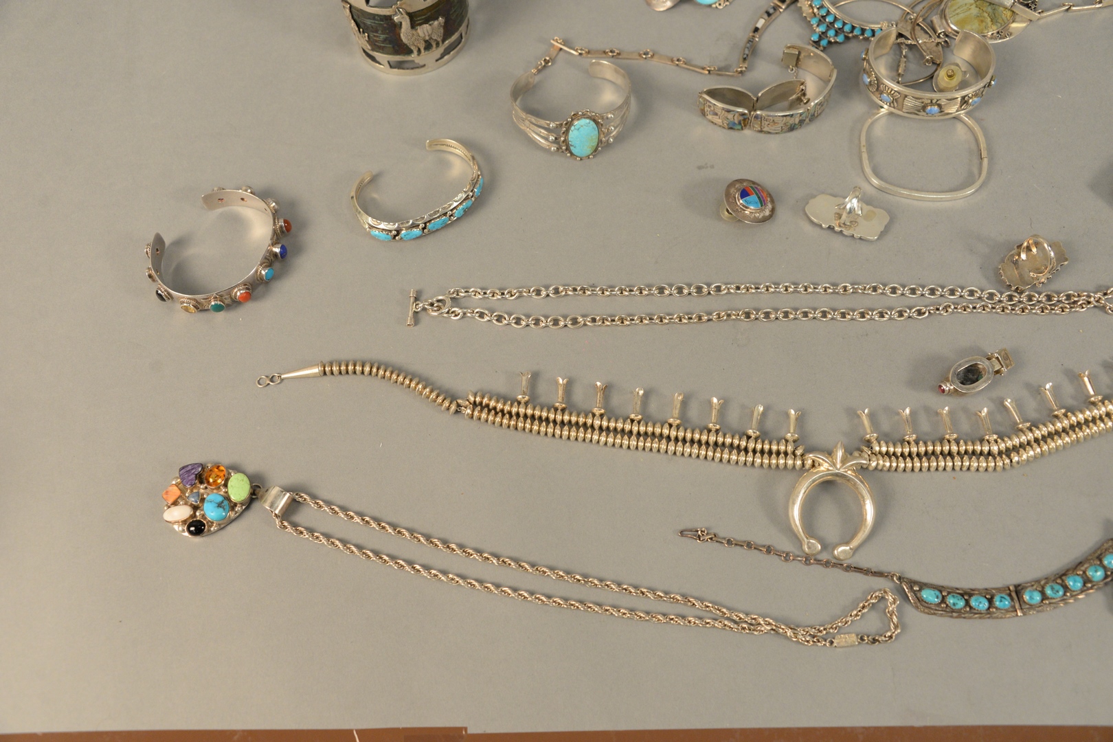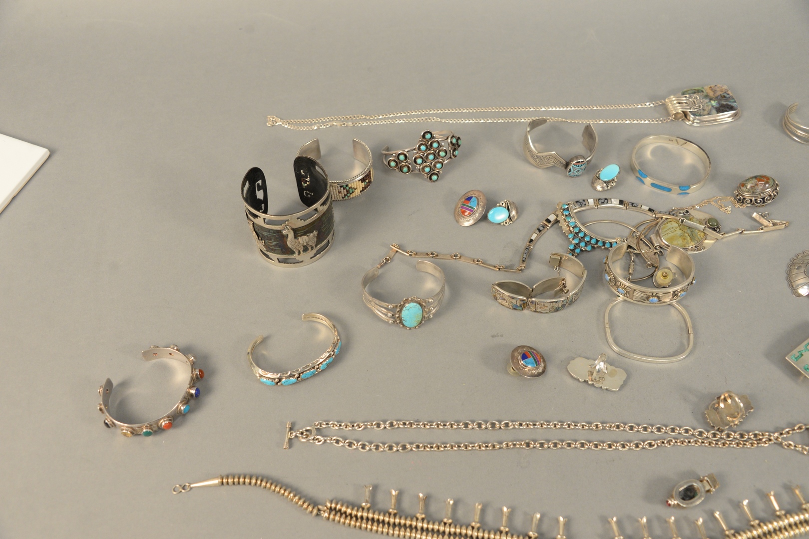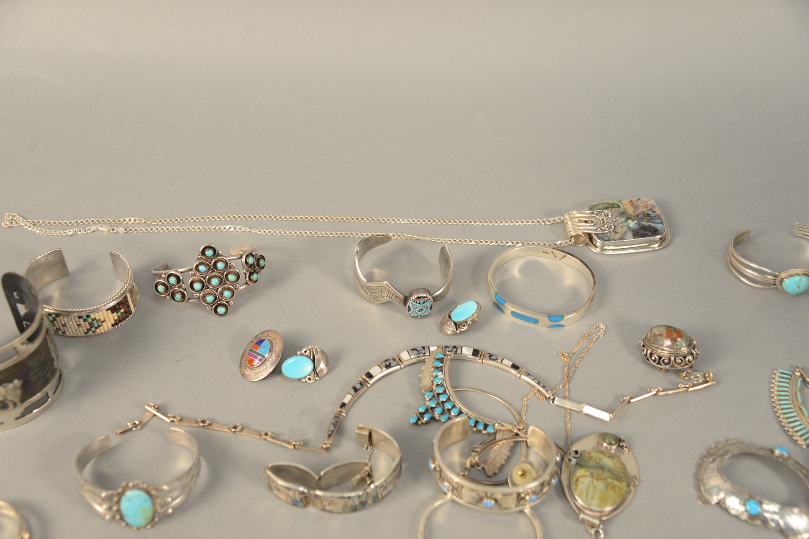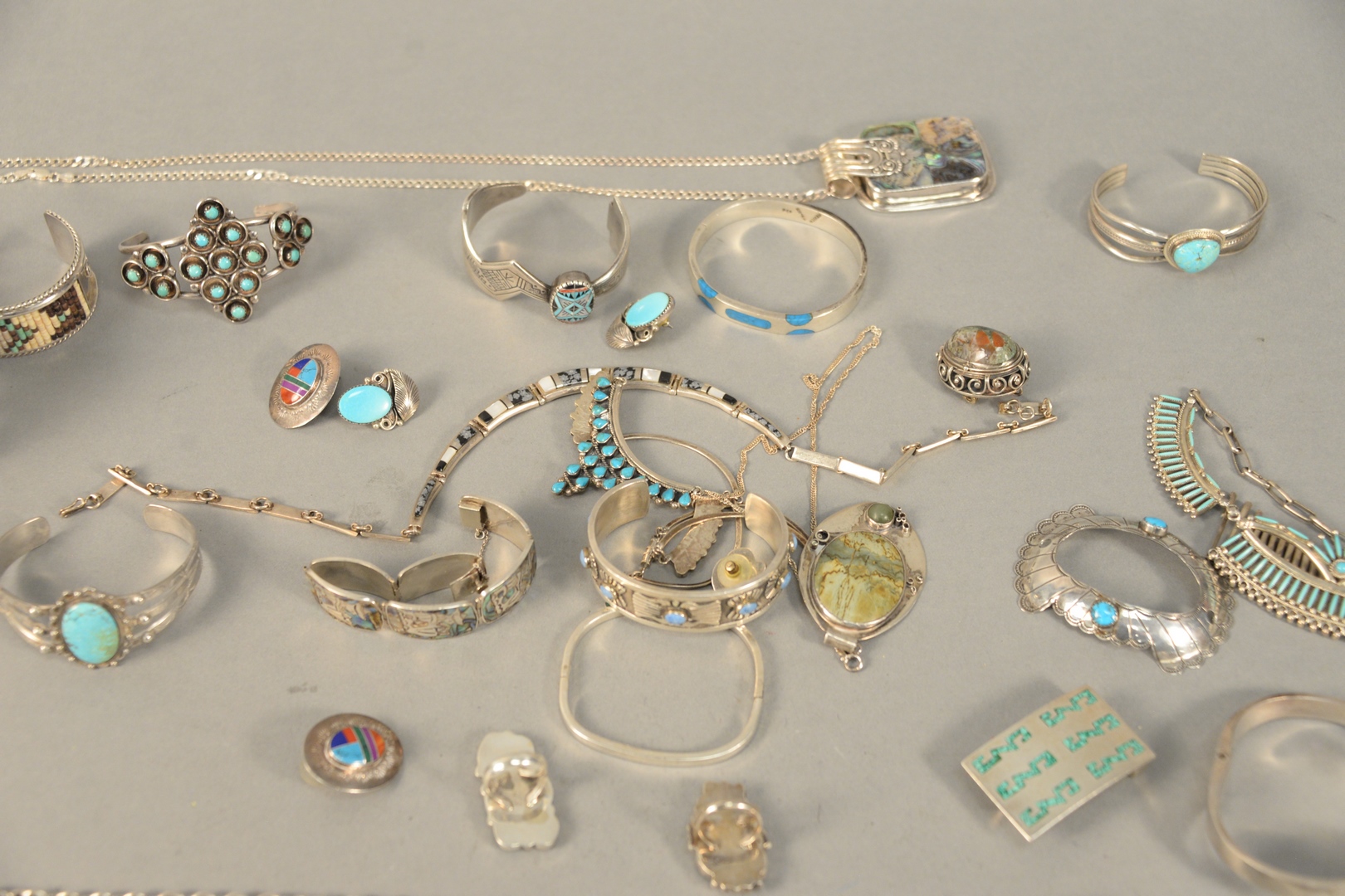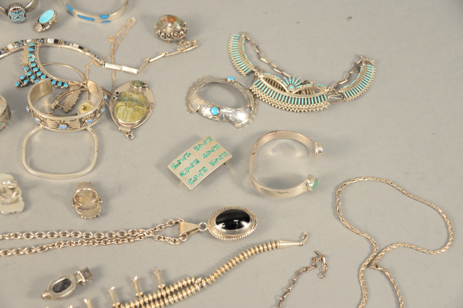 Large group of sterling silver jewelry, most mounted with turquoise stones, Indian bangle bracelets, necklaces, rings, etc., 36.5 t.oz. with stones.